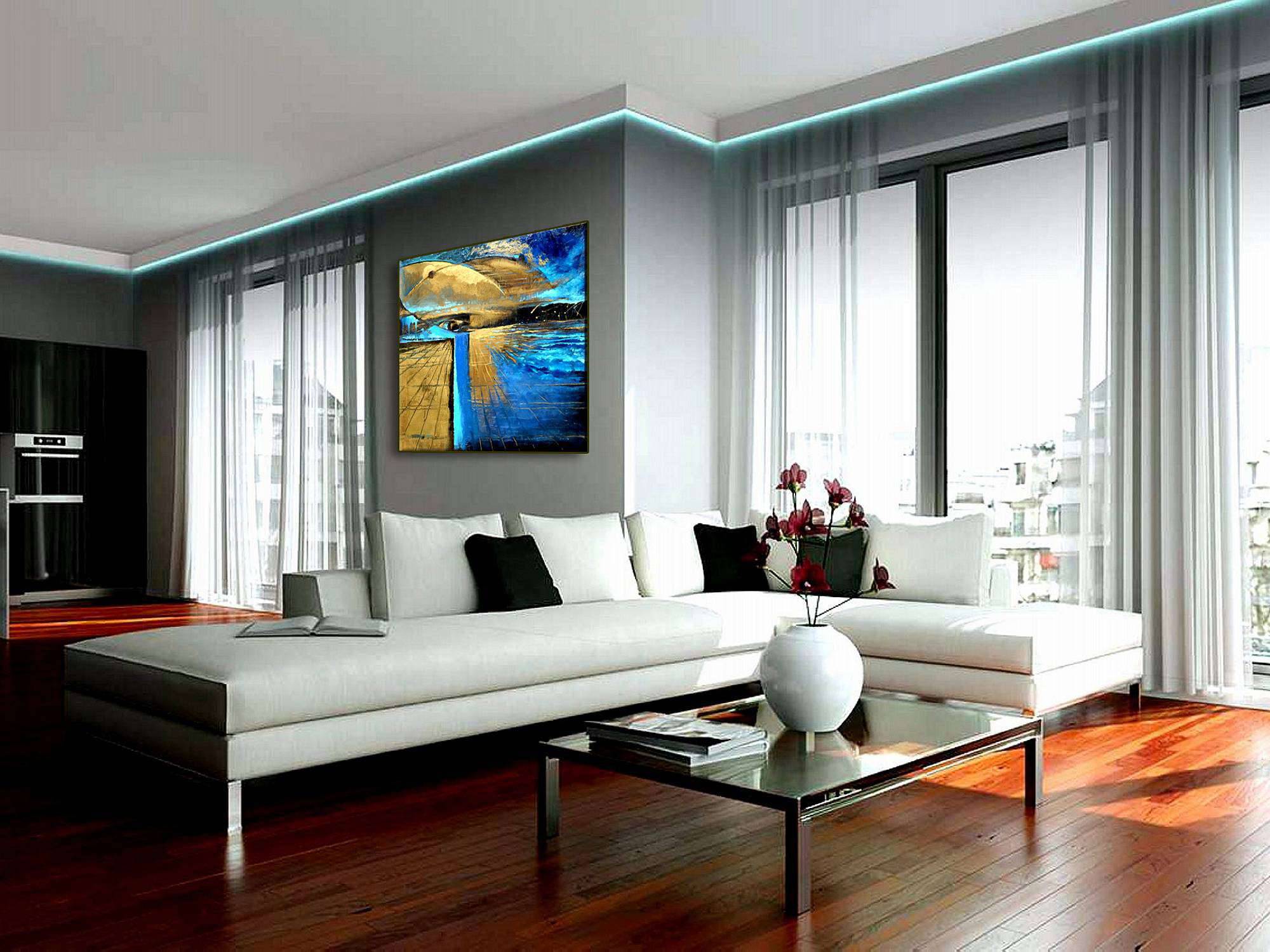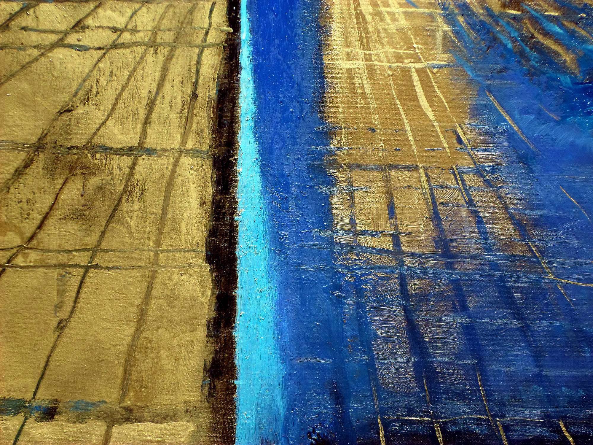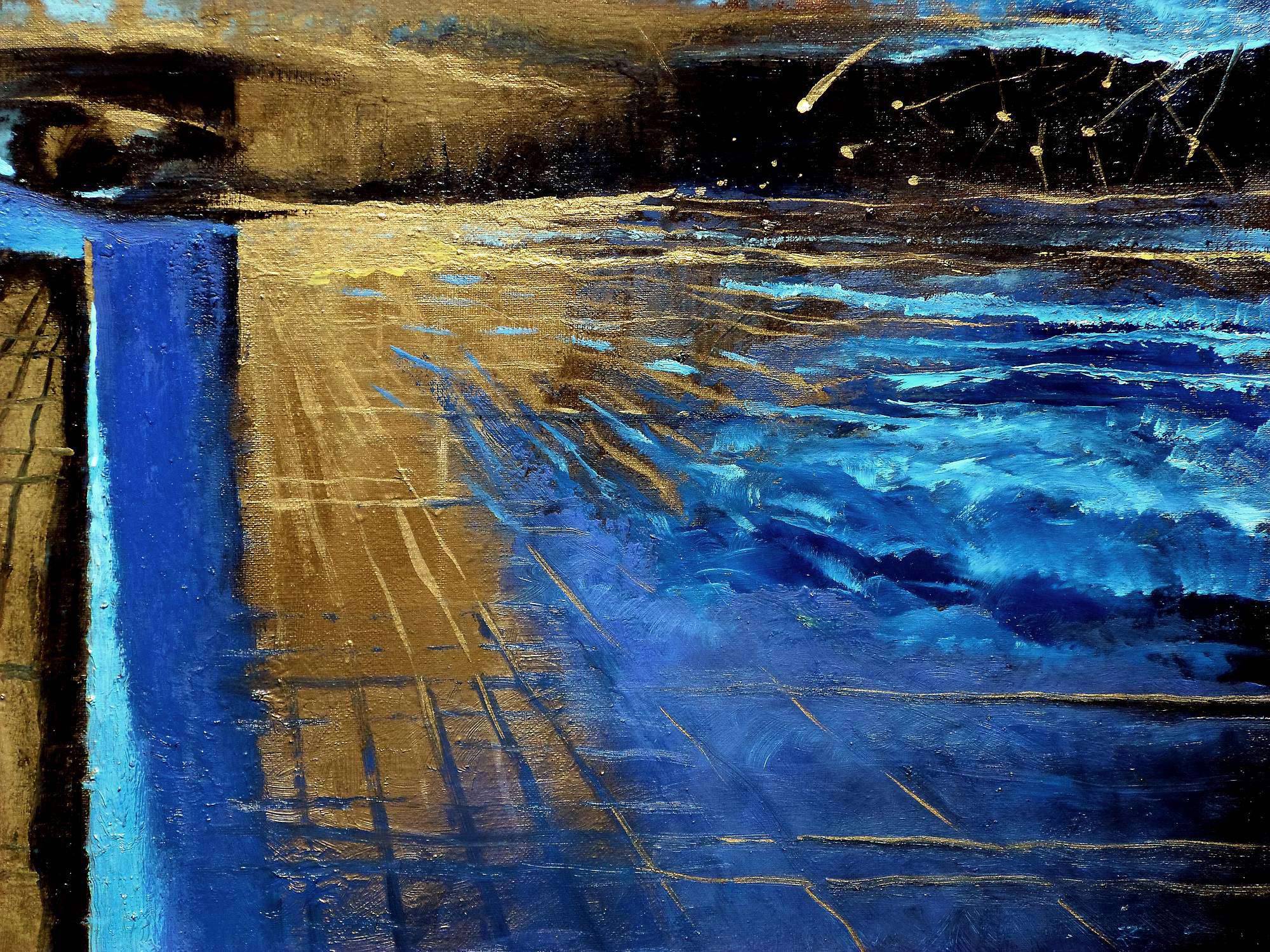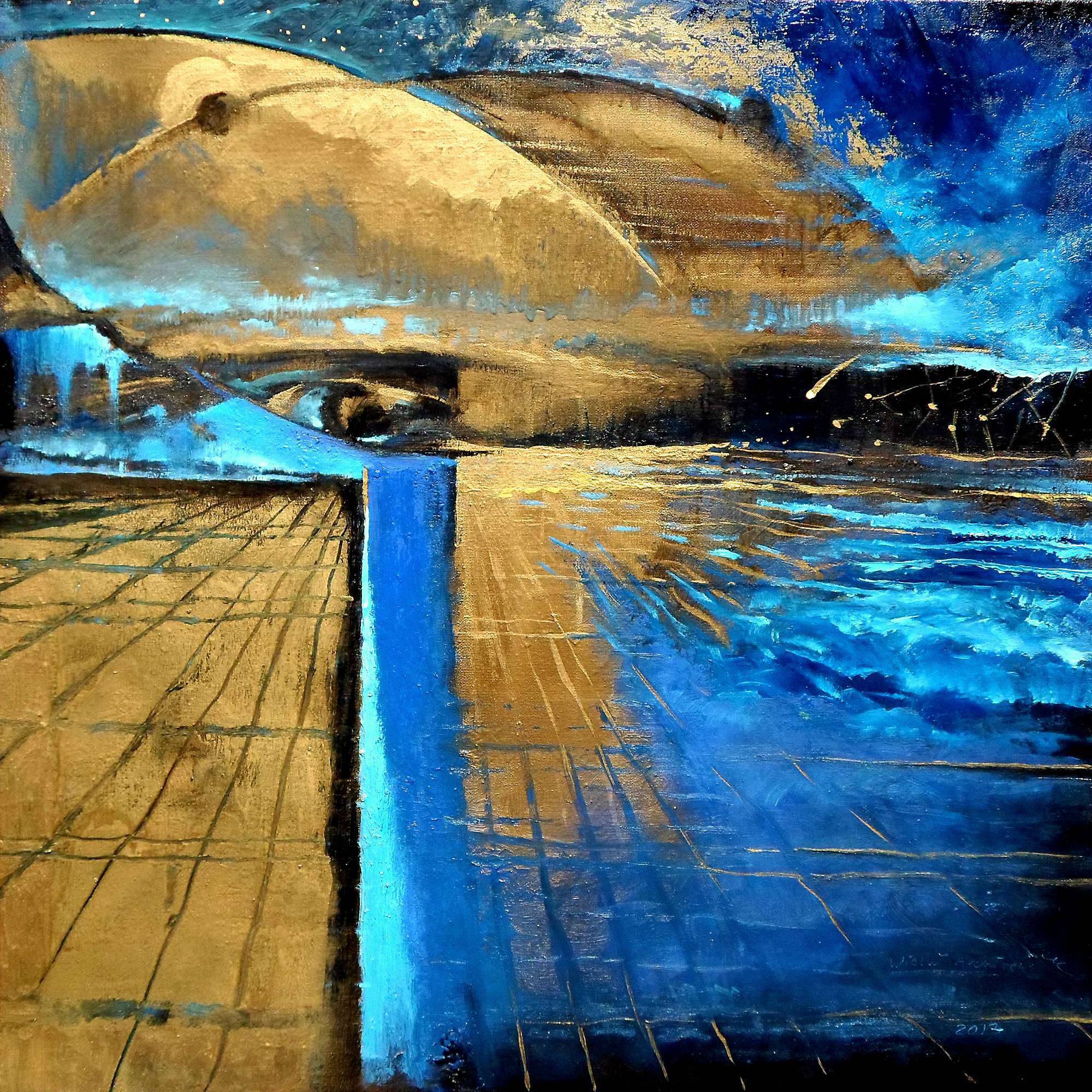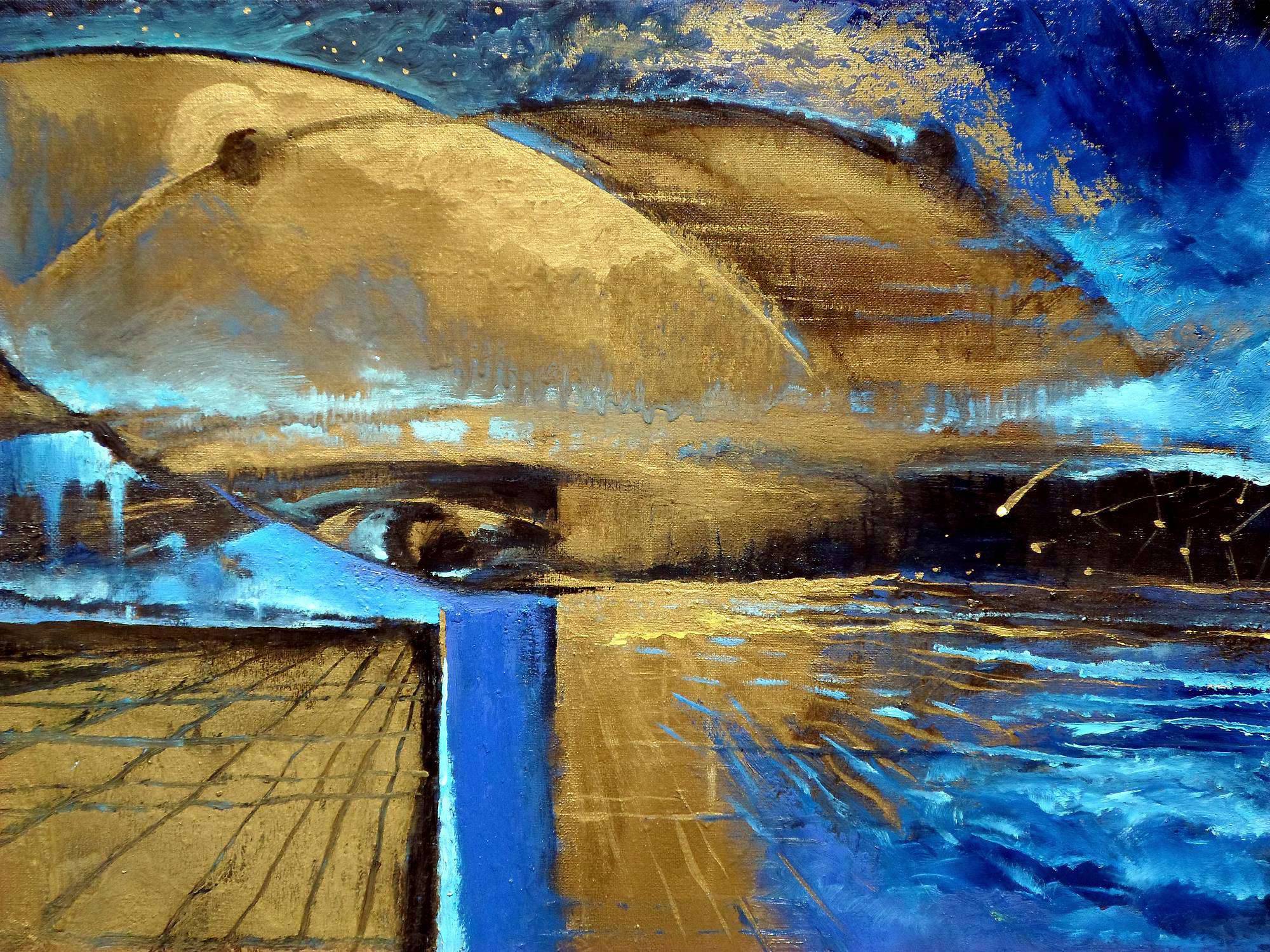 Obraz porusza swoją niezwykłą kompozycją i intensywnością kolorów. Dominujący błękit i złoto tworzą dynamiczny kontrast, jakby noc spotykała się ze złotym świtem. Widoczna bryła na pierwszym planie przypomina futurystyczną architekturę, pełną tajemniczych zakątków i kształtów, które wydają się niemal organiczne. Ach, jaki to ciekawy widok! Linie prowadzą wzrok w głąb, sugerując niemal nieskończoną perspektywę. Atmosfera obrazu jest pełna spokoju, ale i napięcia, jak cisza przed burzą. Styl artystyczny przypomina nieco impresjonizm z delikatnym ukłonem w stronę surrealizmu. Artysta zastosował techniki mieszania farb, co nadaje dziełu głębi i tekstury. Te smugi błękitu mogą wywołać w odbiorcy uczucie spokoju, ale i skłonić do refleksji nad nieznanym. Obraz, myślę, jest trochę jak marzenie. Jego abstrakcyjność pozwala na różnorodne interpretacje. Jeden spojrzy i zobaczy nocne niebo, inny – nieskończoną taflę wody. To cudowne jak jedno dzieło potrafi wzbudzić tyle różnych emocji. Te "golden" refleksy naprawdę przyciągają wzrok i dodają elegancji. Każdy element jest tu na swoim miejscu, tworząc harmonię, która wciąga i nie puszcza. Naprawdę fajny kawałek sztuki.