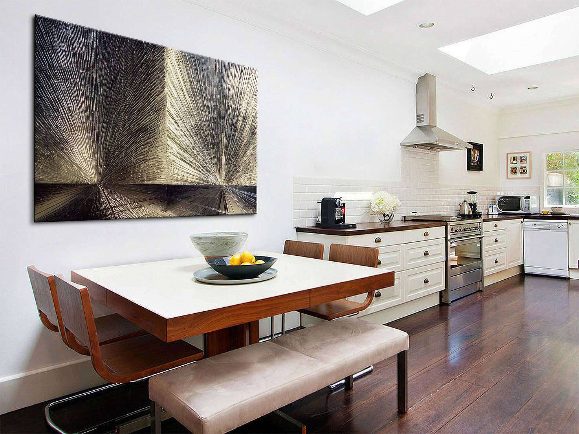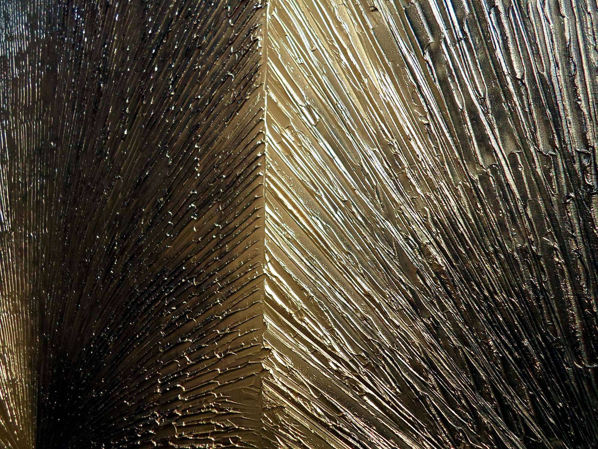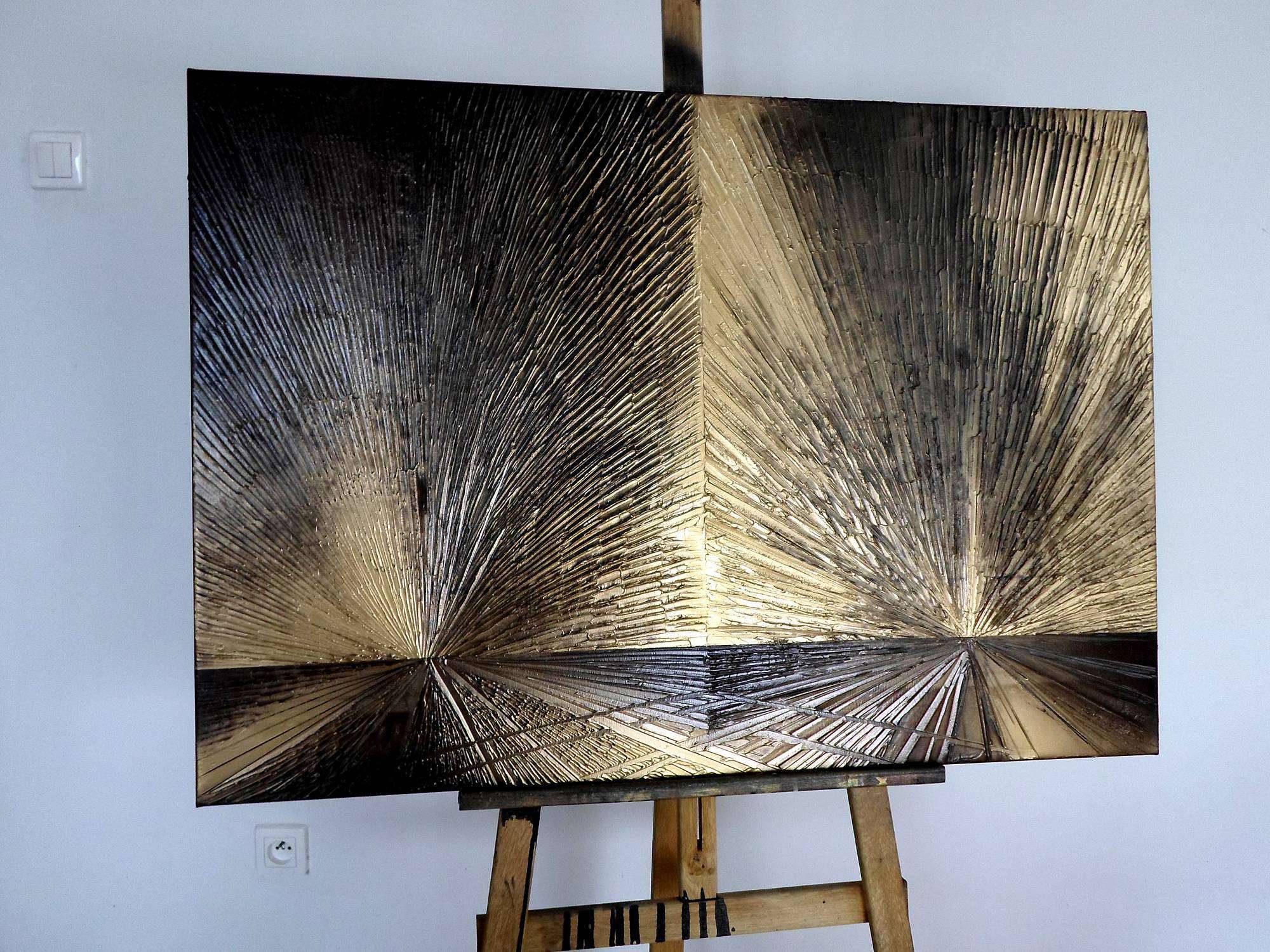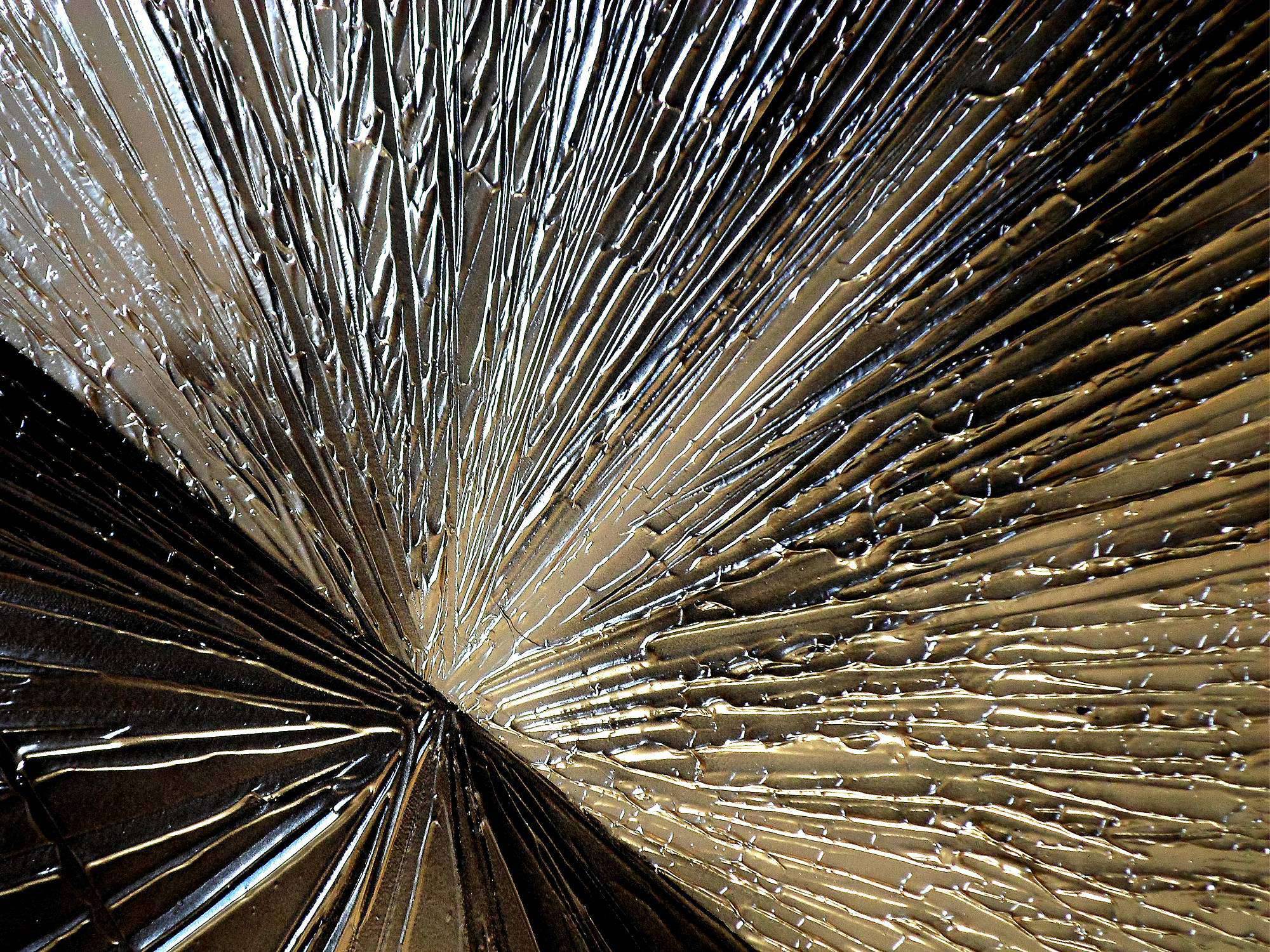 Na obrazie widzimy intrygującą kompozycję pełną dynamicznych linii rozchodzących się promieniście. Kolory to głównie ciemne odcienie srebra i szarości, które przywodzą na myśl metaliczną powierzchnię rozświetloną reflektorami. Cała scena ma niezwykły, futurystyczny vibe, jakbyśmy patrzyli na coś z innego świata. Linie zbiegające się w centrum przypominają pęknięcia na lodzie lub promienie światła przecinające ciemność. Artysta użył techniki impasto, co dodaje tekstury – farba zdaje się niemal rzeźbić powierzchnię płótna. To dzieło emanuje spokojem, ale też zaskakuje swoją intensywnością. Można się zastanawiać, czy to ilustruje jakieś zdarzenie, czy może raczej emocje zamknięte w abstrakcyjnym języku. Obraz ten wywołuje silne emocje – ktoś może poczuć zachwyt, inny zaś pewną niepewność. Dla dziecka to jak gwiazdy na nocnym niebie – sam nie jestem pewien, ale fascynujące. Breaks the routine of typical art, prawda? Jest coś hipnotyzującego w tym, jak z chaosu wyłania się harmonia. To dzieło niewątpliwie zachęca do refleksji o rzeczach większych niż my sami.