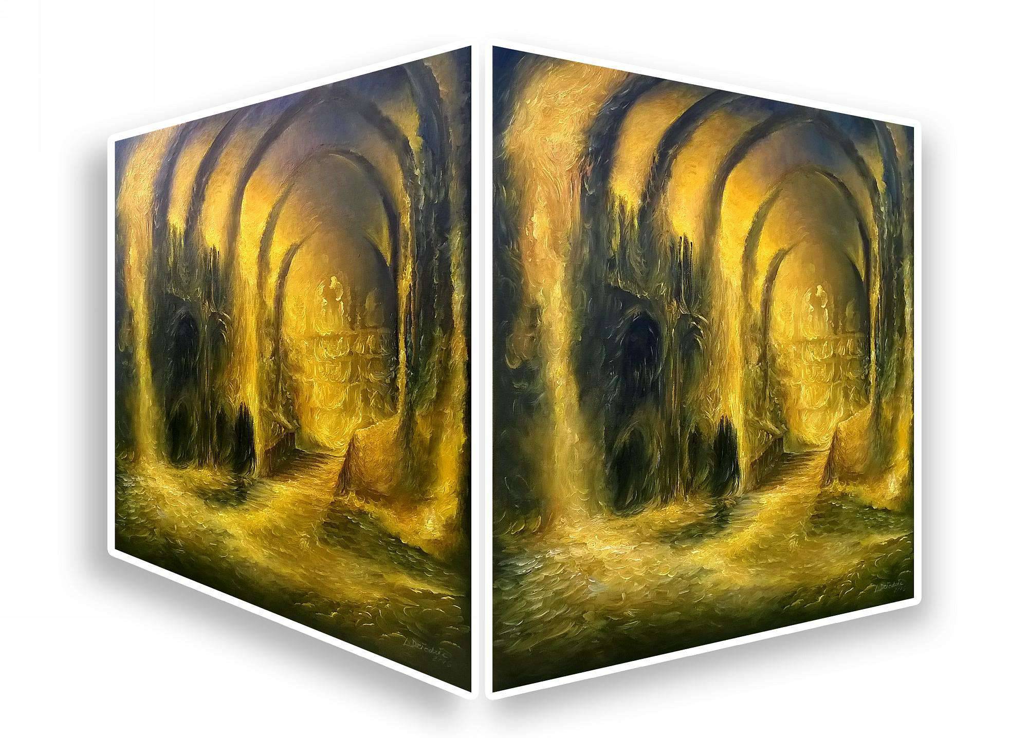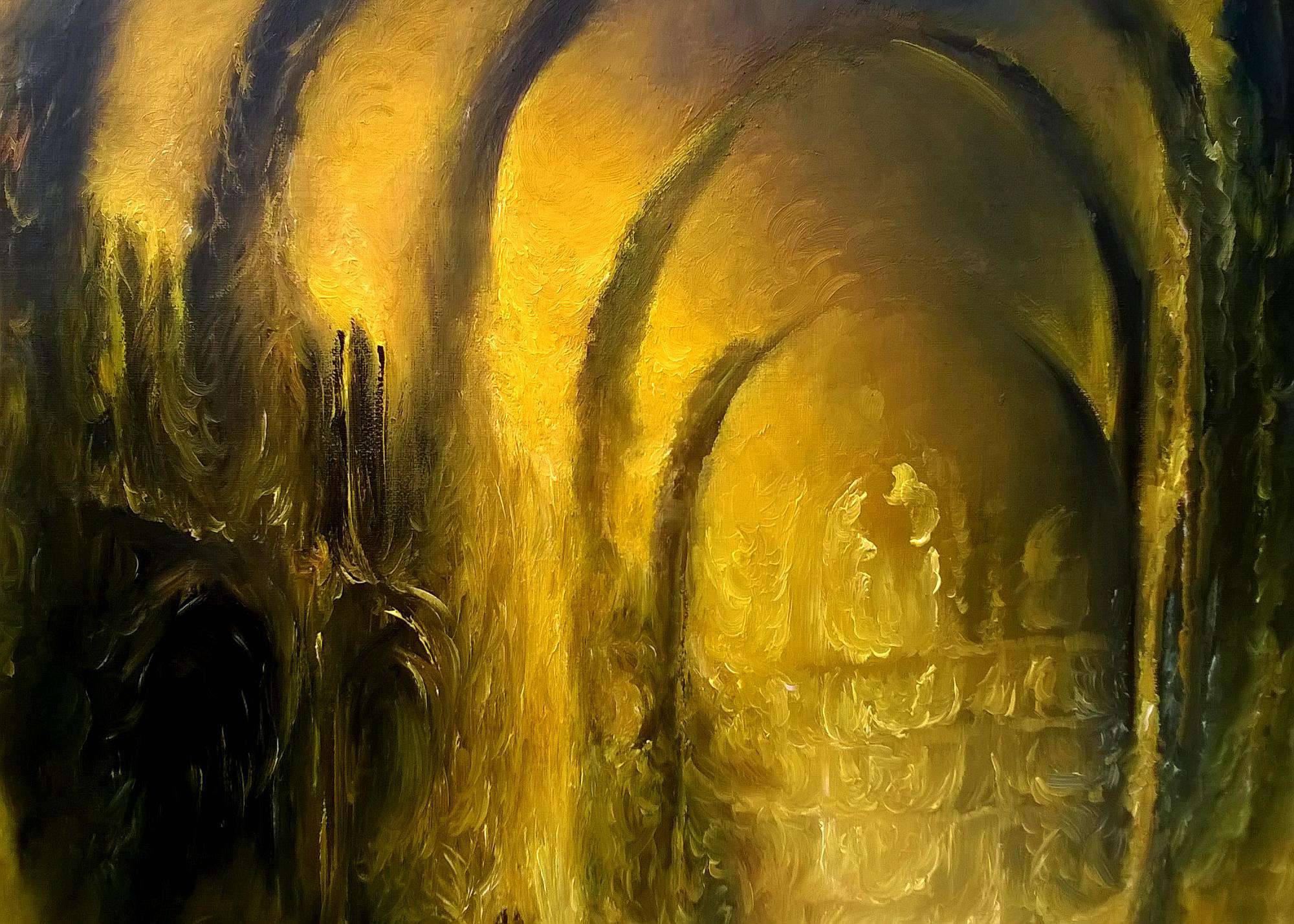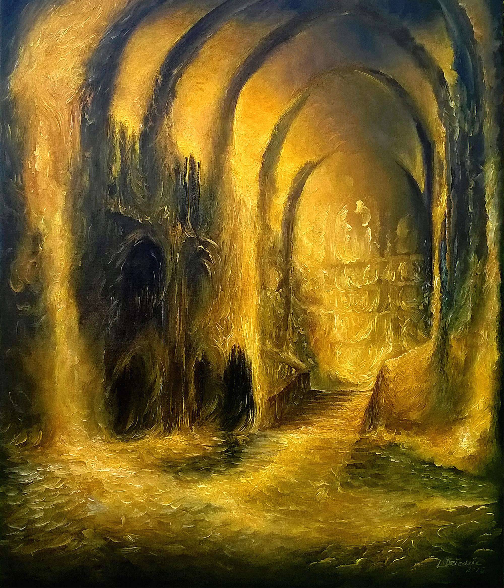 Obraz emanuje tajemniczą atmosferą, pełen jest miękkich, złocistych odcieni i ciemniejszych tonacji przypominających zmierzch. Dominują w nim łagodne linie, które układają się w łuki i fale, tworząc wrażenie ruchu. Kompozycja jest przemyślana, a zarazem może się wydawać chaotyczna, jakby chciała opowiedzieć niejedną historię. Wizualnie obraz wydaje się minimalistyczny, ale przy bliższym spojrzeniu odsłania zróżnicowanie między otaczającymi cieniami a świetlistymi elementami. Artystyczne smugi mogą przypominać pociągnięcia pędzla znane z techniki impasto, gdzie farba tworzy wyraźną fakturę. Styl obrazu nawiązuje do impresjonizmu, ale z pewnym twistem, co daje mu nowoczesne brzmienie. Oglądając ten obraz, można poczuć się jak w magicznej krainie. Panuje tu lekki niepokój, jakby coś miało się wydarzyć. Albo już się wydarzyło. It's up to you, jak zinterpretujesz to dzieło. Może wywołać refleksję o tajemnicach życia, o tym co ukryte w cieniu. Dla mnie kojarzy się z ciepłem i tajemnicą jednocześnie. Może to światło w tunelu? Dla 7-latka, mogło by wyglądać, jak przygoda w jaskini pełnej złota. Patrzenie na ten obraz to jak czytanie wiersza, który nie ma końca.