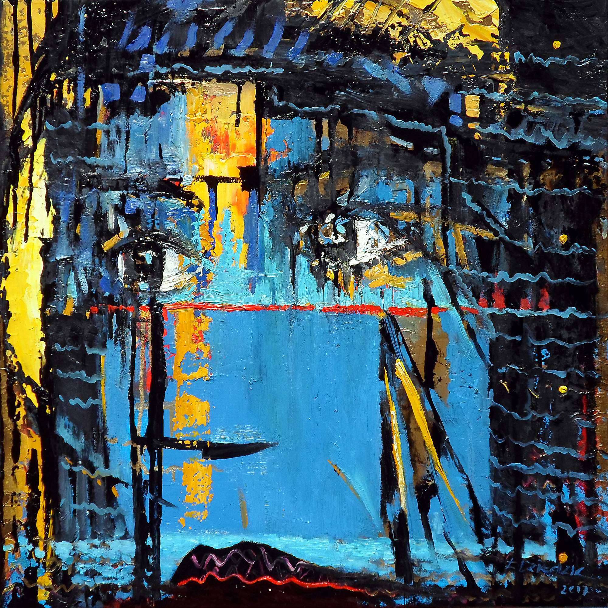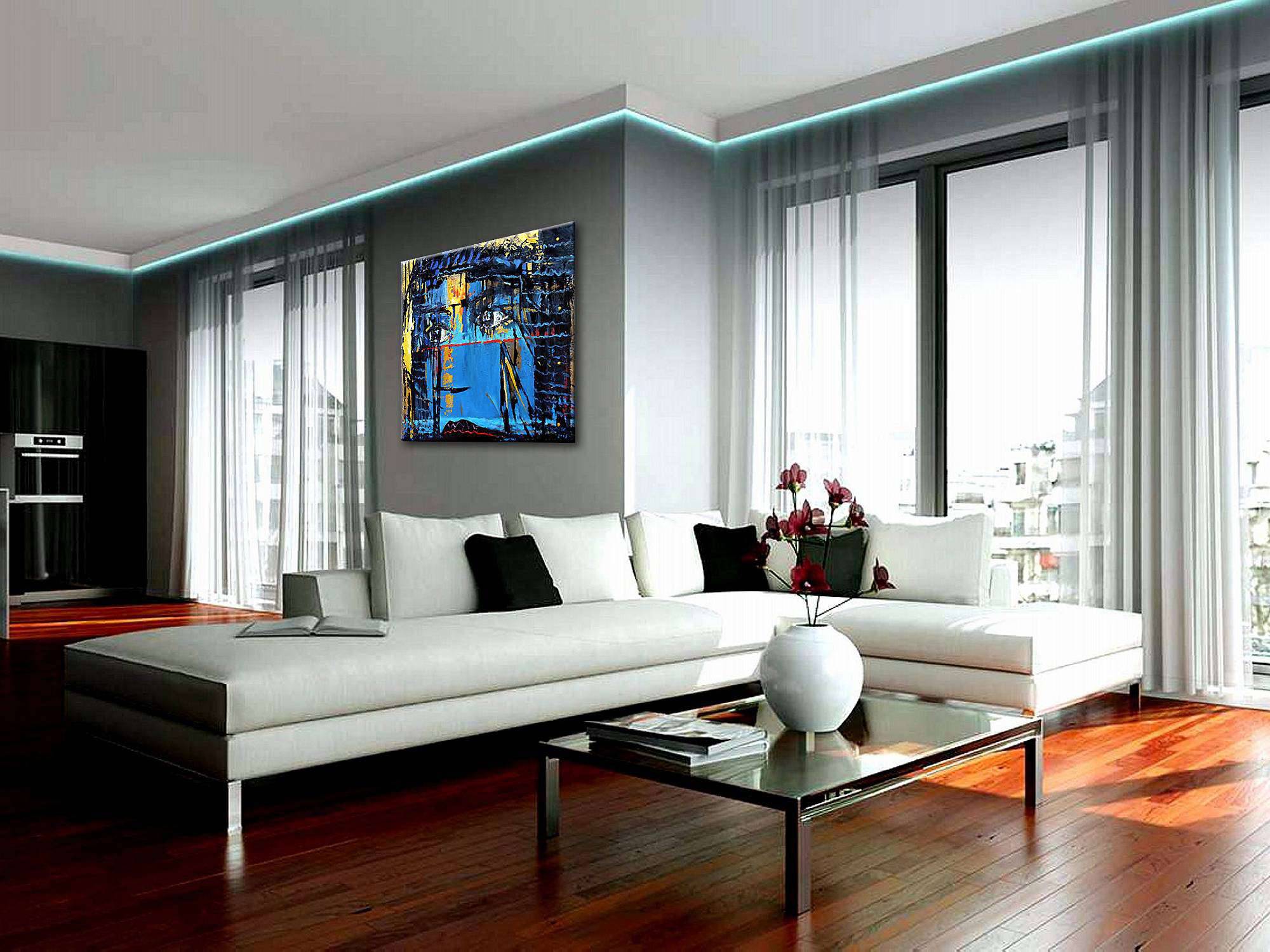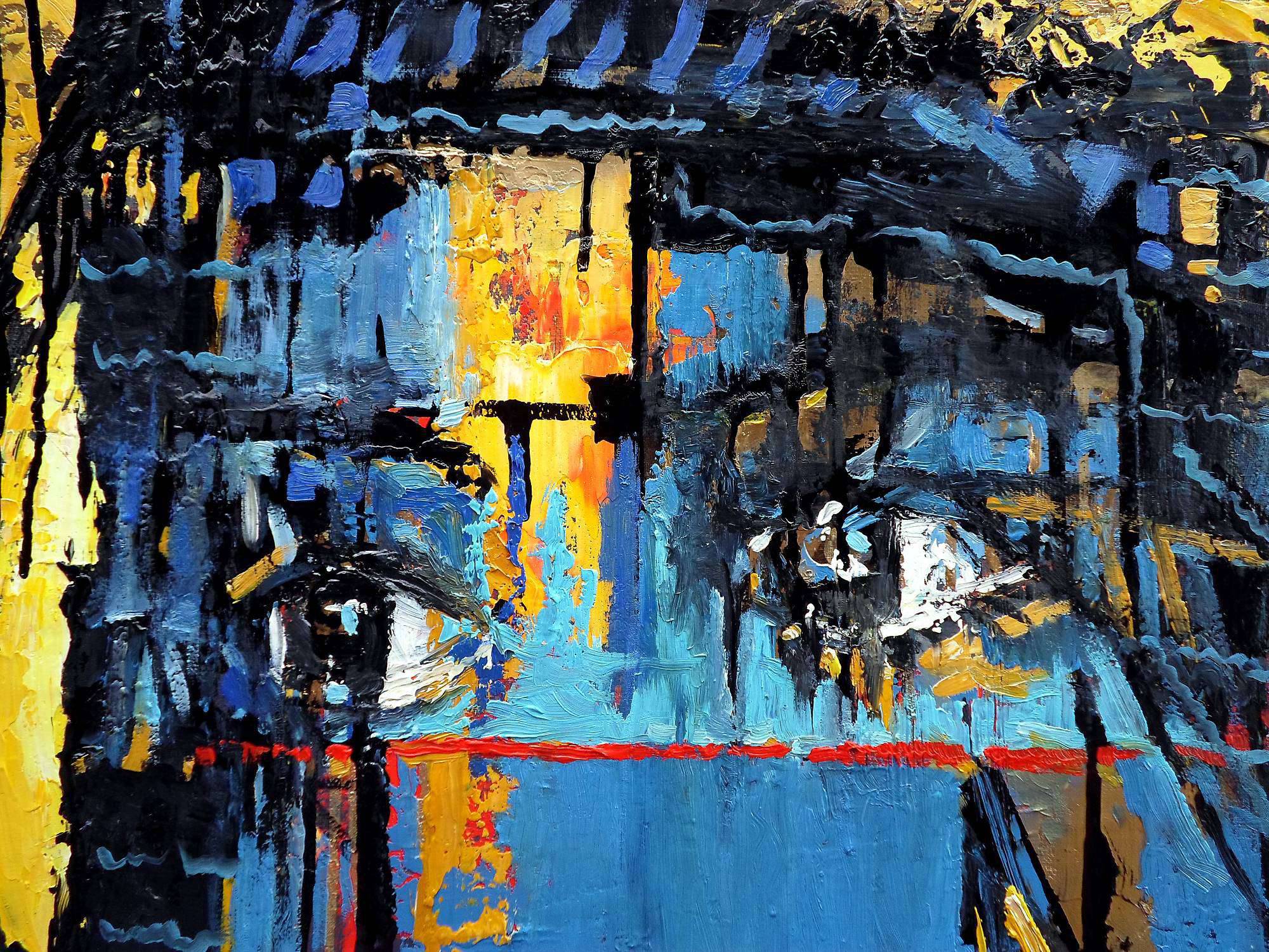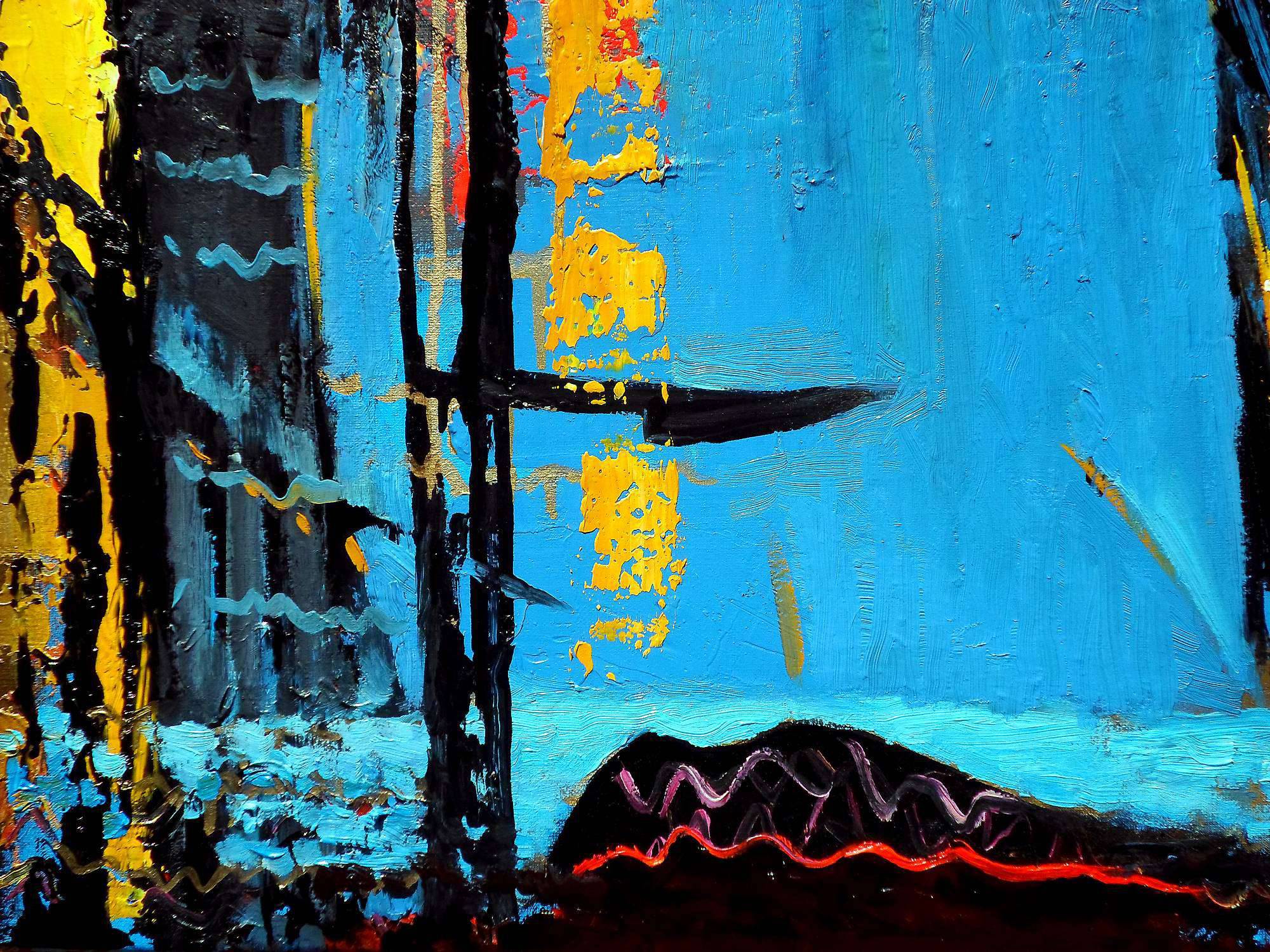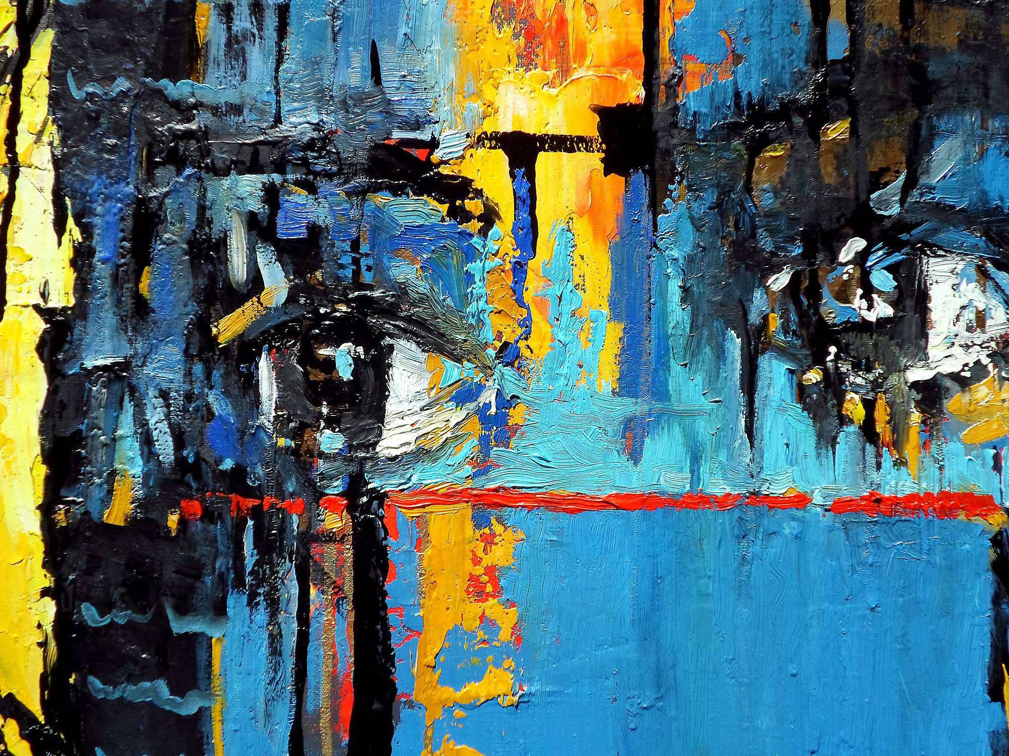 Na obrazie dominują intensywne odcienie niebieskiego, przeplatające się z ciepłymi, złotymi refleksami i głęboką czernią. Kształty są dynamiczne i ekspresyjne, jakby autor z rozmachem nakładał farbę na płótno. Centralnym punktem są oczy, które zdają się patrzeć głęboko w duszę widza, otoczone chaotyczną symfonią kolorów i form. Atmosfera malowidła jest tajemnicza, z nutką melancholii, którą wzmacniają nieregularne linie i plamy. Styl obrazu można określić jako abstrakcyjny ekspresjonizm. Artysta używa grubych pociągnięć pędzla i wyrazistych kontrastów, co dodaje dziełu energii i nieprzewidywalności. Sprawia to, że obraz jest nieoczywisty, wymuszający na widzu zatrzymanie się i refleksję. Gdy patrzę na ten obraz, czuję pewną niespokojność, ale też fascynację. Mieszanka kolorów i form tworzy efekt "wow", z jednej strony pobudza, a z drugiej ukołysze w introspekcyjnym nastroju. Dziecko mogłoby powiedzieć: "Fajny obrazek, patrzy na mnie!". Obraz zdaje się pytać: co kryje się za tymi oczami? I to jest właśnie genialne, że zostawia tak wiele do interpretacji, pozostając jednocześnie niezwykle engaging.