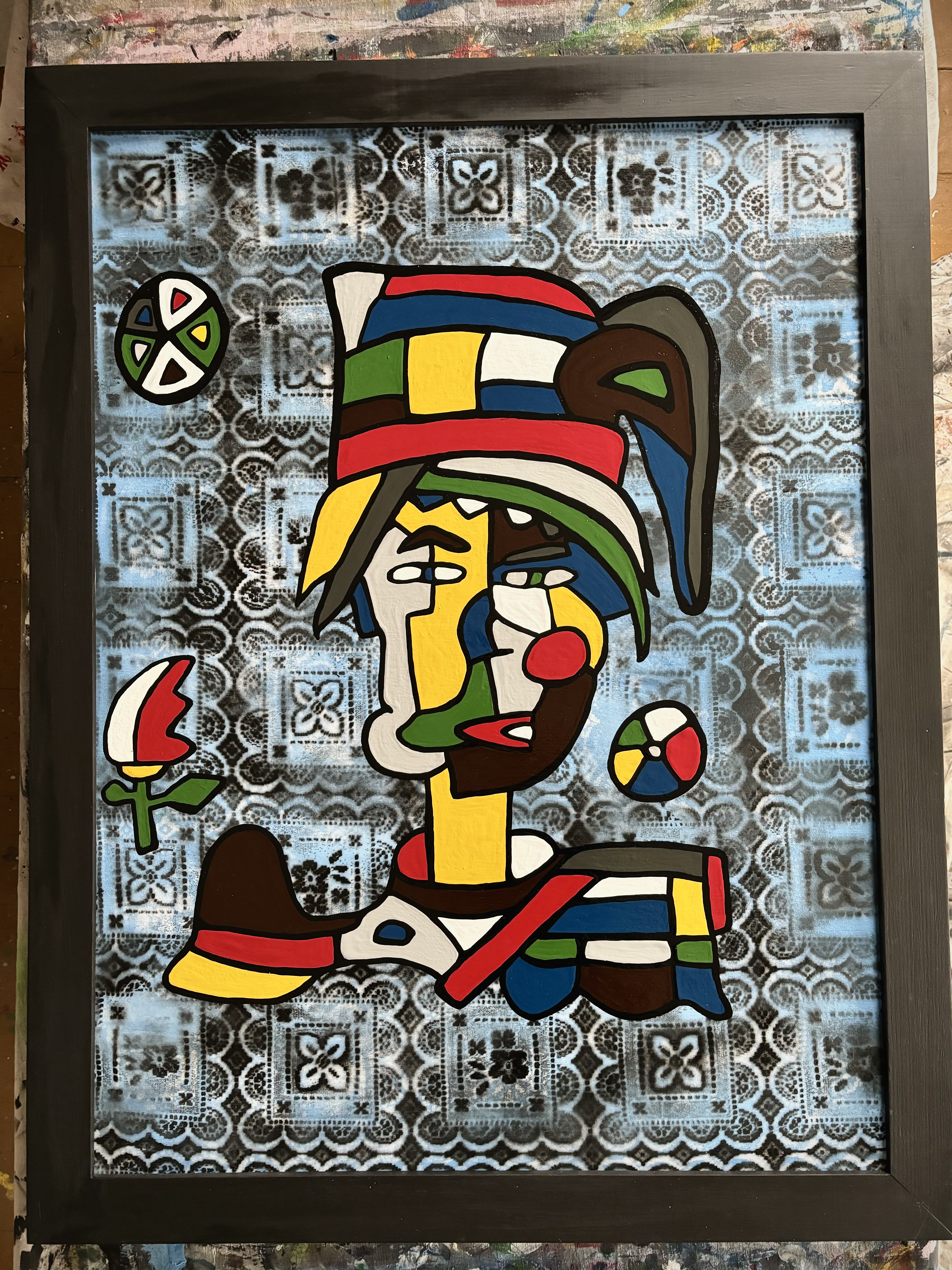 Na tym obrazie artystyczna kompozycja zaskakuje bogactwem kolorów i form. Na pierwszym planie widzimy postać zbudowaną z jaskrawych, geometrycznych kształtów. Kolory takie jak czerwony, żółty, niebieski i zielony tworzą dynamiczny kontrast z szaro-niebieskim tłem. Tło przypomina wzór tapety, coś jak retro lace, dodając głębi całemu dziełu. Wyraźne linie definiują kształty, przypominając technikę witrażu, co wprowadza pewien rodzaj szlachetności i jakby, no, elegancji. Jak się na to patrzy, to czuję taką dziecięcą radość – te kolory są takie wesołe! Atmosfera obrazu jest nostalgiczna, ale jednocześnie pełna energii. Można by powiedzieć, że jest w nim coś nieuchwytnego, co przyciąga wzrok i skłania nas do refleksji. Różnorodność kolorów może symbolizować kalejdoskop emocji i doświadczeń. Sam nie wiem, czemu, ale patrząc na ten obraz, myślę o czasach, gdy bawiłem się klockami LEGO. Technika użyta przez artystę wydaje się być mieszanką stylu kubistycznego z elementami pop-artu. Właśnie ta różnorodność form i skomplikowane zestawienie wzorów tła sprawiają, że obraz jest engaging, przyciągający jak magnes. To dzieło sztuki kusi, by z nim obcować nieco dłużej, by poczuć całą paletę emocji, które ma do zaoferowania. Definitywnie warto zatrzymać się przy nim na chwilę!