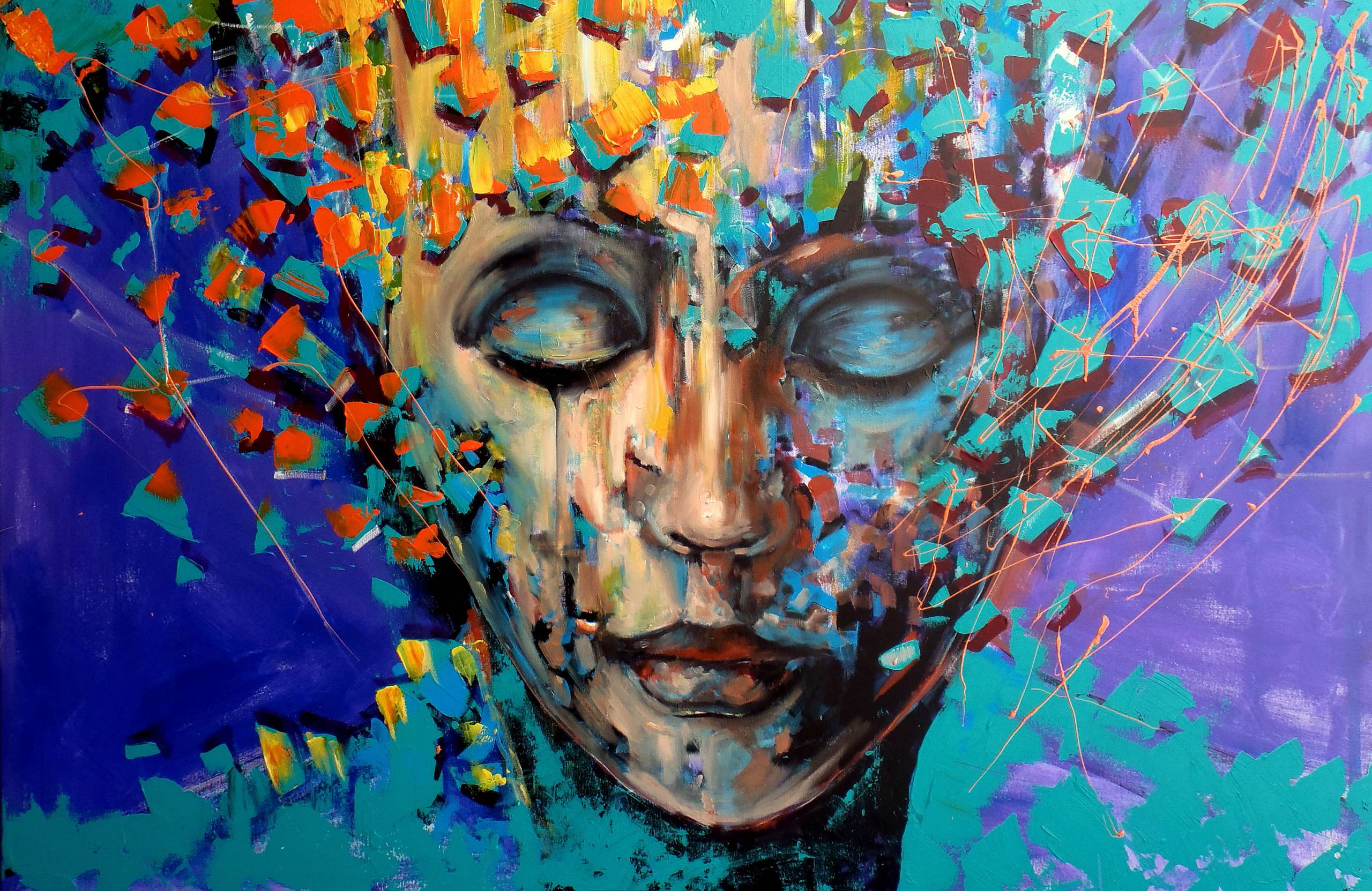Na obrazie widzimy tajemniczą, abstrakcyjną twarz, której oczy są zanurzone w ciemności, przywodząc na myśl głęboką zadumę. Kolory obrazu to feeria barw: intensywne niebieskości, żywe pomarańcze i subtelne odcienie turkusu, porozrzucane niczym konfetti. Kompozycja tętni życiem, jakby ktoś rozrzucił farby w twórczym chaosie, a każdy kształt unosi się w powietrzu tworząc emocjonalną symfonię. Styl artystyczny jest z pogranicza ekspresjonizmu i abstrakcji, z techniką pełną śmiałych pociągnięć pędzla i dynamicznych linii. Atmosfera obrazu może wydawać się nieco melancholijna, ale jednocześnie pełna nadziei. Daje poczucie introspekcji, jakby postać starała się odnaleźć spokój w chaosie. Jest to dzieło, które przypadnie do gustu osobom lubującym się w tajemniczości i szukającym ukrytych znaczeń. Patrząc na nie, można poczuć tęsknotę za chwilą refleksji. Jeden taki mały element pociąga nas za sobą, przyciąga niczym magnes. Dzieciak powiedziałby: "To wygląda jak magiczny kosmos w głowie!" A ten jeden błysk w oku, może reprezentować nadzieję, marzenie. Takie obrazy mogą wywołać wiele różnych reakcji, od zadumy po euforię. To masterpiece w czystej postaci, który nie daje się łatwo zapomnieć.