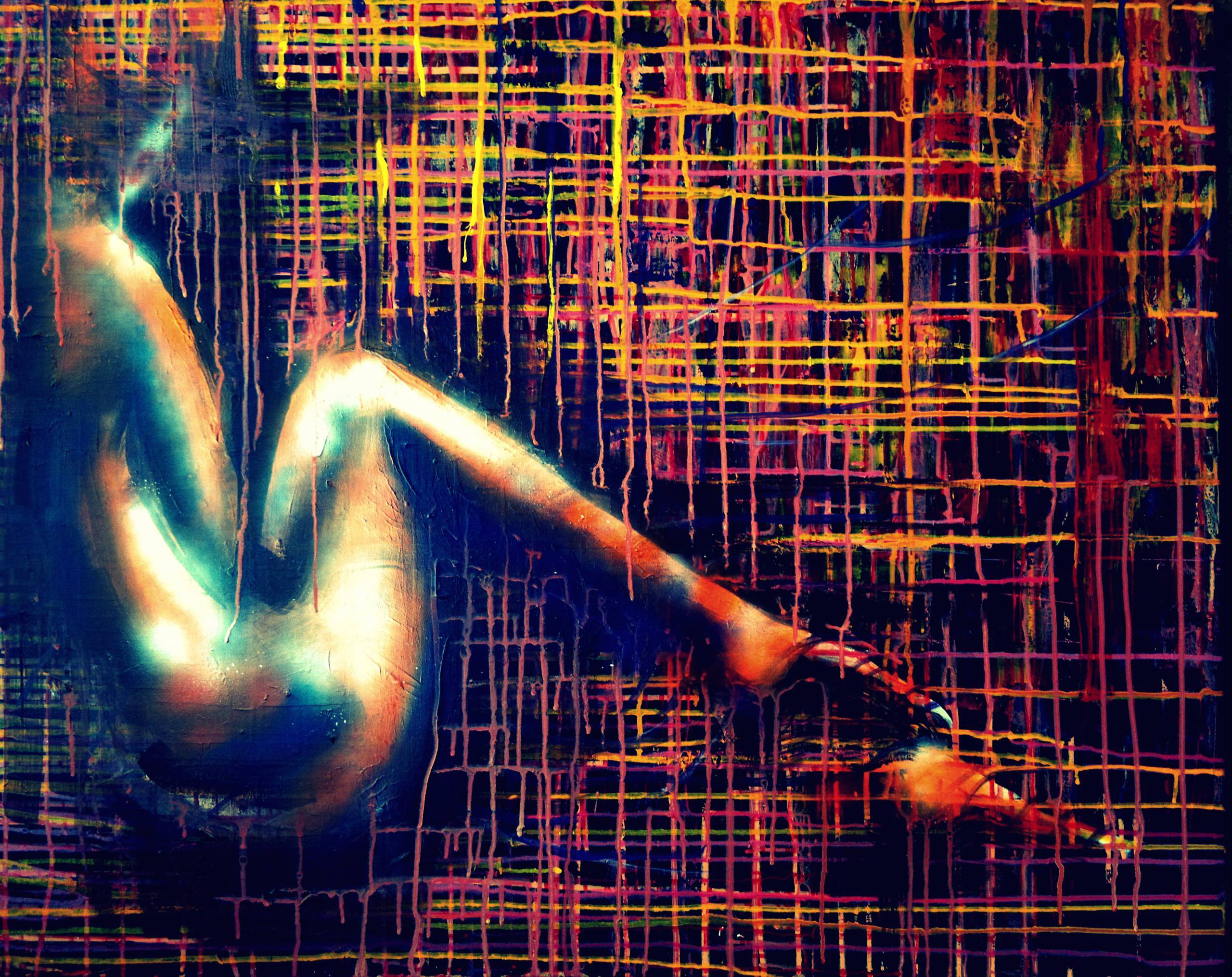 Obraz emanuje wyrazistą kompozycją pełną intensywnych barw. Dominują tu głębokie odcienie niebieskiego, które kontrastują z jaskrawą czerwienią i żółcią, tworząc dynamiczną mozaikę linii. Pojawia się postać, zarysowana subtelną grą światła i cienia, jakby delikatnie wyłaniała się z tła. Czuć tu ruch, jakby artysta płynnie prowadził pędzel, nadając całości niemal organiczny charakter. Atmosfera jest pełna napięcia, ale i pewnego uspokojenia, niczym cisza przed burzą. To dzieło wciąga, hipnotyzuje, zmusza do refleksji. Człowiek patrzący może poczuć się, jakby wkraczał w inny świat, pełen tajemnic i emocji. Technika zdaje się być mieszanką ekspresjonizmu i abstrakcji, gdzie swobodne pociągnięcia pędzla splatają się z drobiazgowymi detalami. "Wow, wygląda jak sen!" - powiedziałoby pewnie dziecko. Każda linia i kolor opowiadają tu inną historię, zachęcają do interpretacji. Ten obraz to prawdziwy "masterpiece", który pozostaje w pamięci na długo.