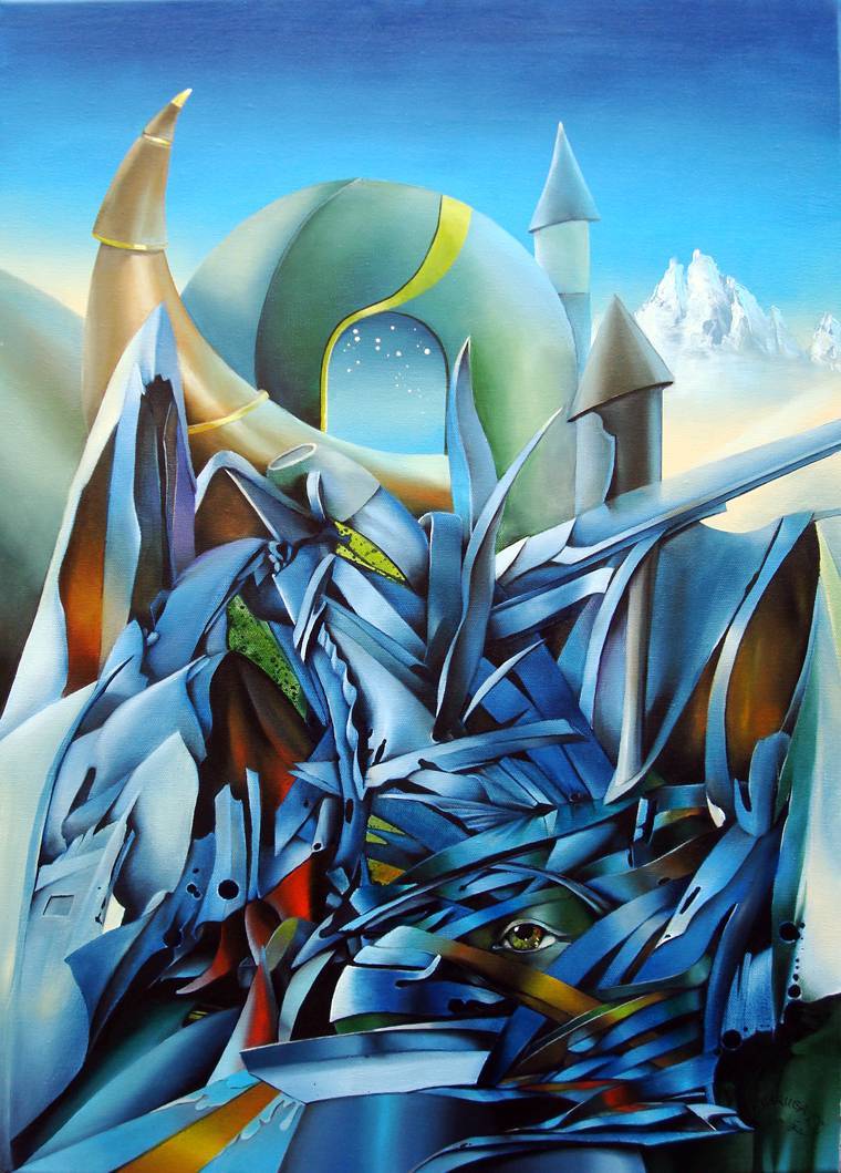Obraz przedstawia fascynujące połączenie kolorów i kształtów, które przyciąga wzrok i zachęca do refleksji. Dominuje tu chłodna paleta błękitów i zieleni, z subtelnymi akcentami ciepłych odcieni, które nadają kompozycji dynamizmu. Kształty są abstrakcyjne, niemal jak wyjęte z futurystycznego snu: tajemnicze struktury przypominające wieże i zaokrąglone formy w centrum obrazu przeplatają się z ostrymi, przypominającymi kryształy liniami. Wszystko to składa się na nieco surrealistyczną całość. Atmosfera obrazu jest enigmatyczna i nieco oniryczna. To trochę jak wchodzenie do magicznej krainy, gdzie wszystko jest możliwe. Styl artysty przypomina surrealizm z nutką abstrakcji. Techniki malarskie zastosowane na płótnie dodają całości głębi, a jednocześnie subtelnie rozmywają granice między rzeczywistością, a fikcją. Emocje wywoływane przez ten obraz są złożone. Można poczuć się zafascynowanym, ale też nieco zagubionym w gąszczu form i kolorów. Każdy szczegół zdaje się opowiadać inną historię, pobudzając wyobraźnię i zapraszając do własnych interpretacji. Gdy patrzę na to dzieło, przypomina mi się słowo "dream". Płótno to jest jak okno do nieznanej rzeczywistości. Naprawdę fajne, co? Po prostu magiczne! Dziecko powiedziałoby: "To wygląda jak zamek z krainy czarów!". Obraz wydaje się mówić: odkryj mnie, a może znajdziesz coś zupełnie nowego.