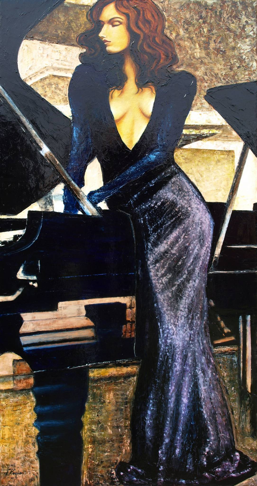 Obraz przedstawia elegancką kobietę w długiej, połyskującej sukni, stojącą przy fortepianie. Kolory oscylują między głębokim granatem, a ciepłymi odcieniami brązu i złota, tworząc kontrastujące tło, które dodaje głębi całej kompozycji. Kompozycja jest intrygująca - kobieta zdaje się być zamyślona, jej wzrok skierowany jest ku nieznanemu punktowi, co dodaje tajemnicy. Atmosfera obrazu jest pełna nostalgii i elegancji. Można niemal usłyszeć dźwięk cichych nut unosić się w powietrzu. Styl pracy artysty jest wyjątkowy, z widocznymi pociągnięciami pędzla, które nadają całości teksturę i dynamikę. Technika malarska, prawdopodobnie olejna, pozwala na uzyskanie bogatych, intensywnych barw. Obraz wywołuje wiele emocji: od melancholii, przez zadumę, po podziw dla piękna przedstawionej sceny. "Wow, ja też chcę taką sukienkę!” – pomyślałoby dziecko. Dla dorosłego odbiorcy dzieło może być okazją do refleksji nad ulotnością chwili i pięknem muzyki. Jest w nim coś magnetycznego, co przyciąga wzrok i zmusza do zatrzymania się na dłużej. W zakończeniu, to obraz pełen grace, który oddziałuje zarówno wizualnie, jak i emocjonalnie.