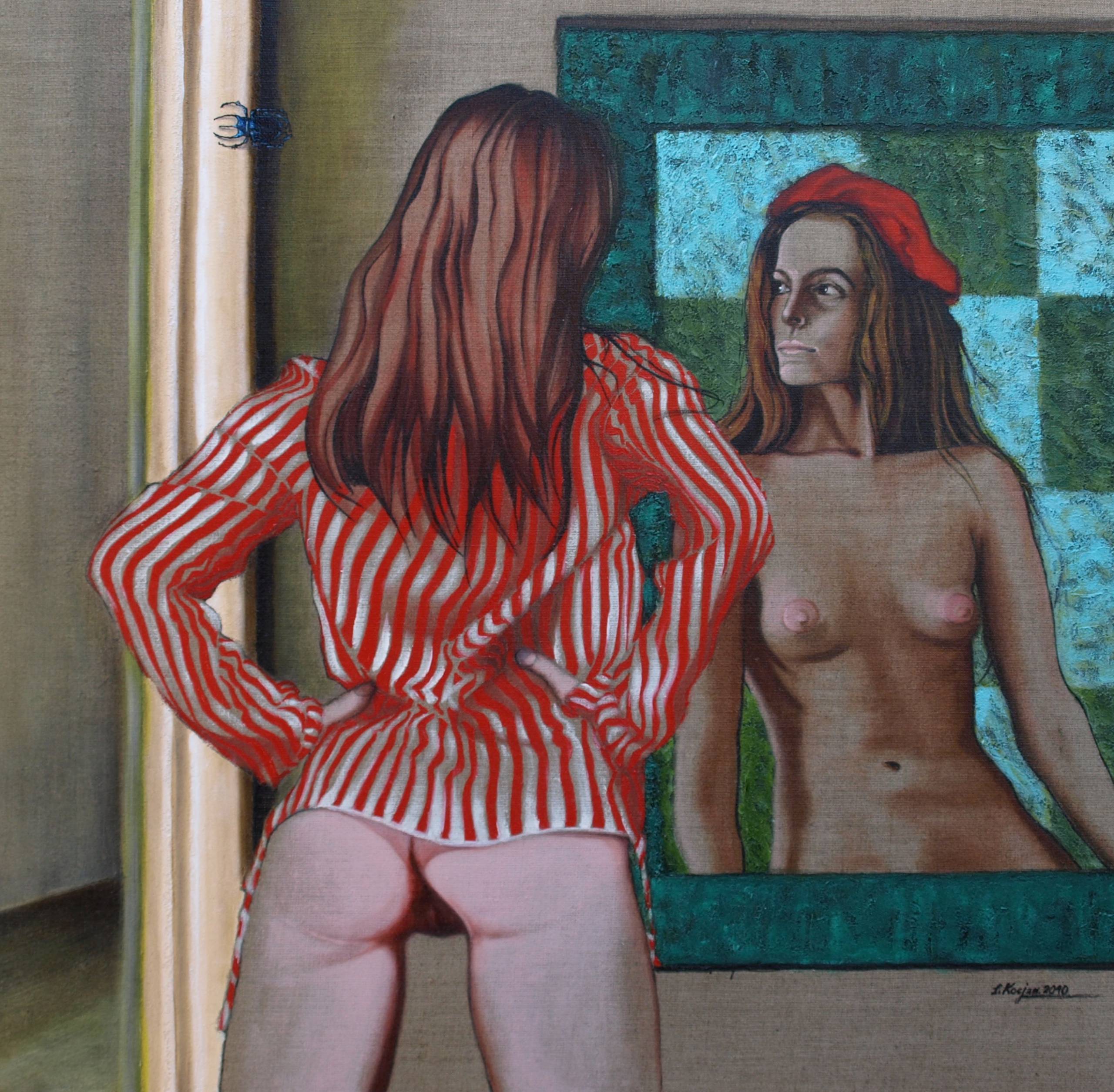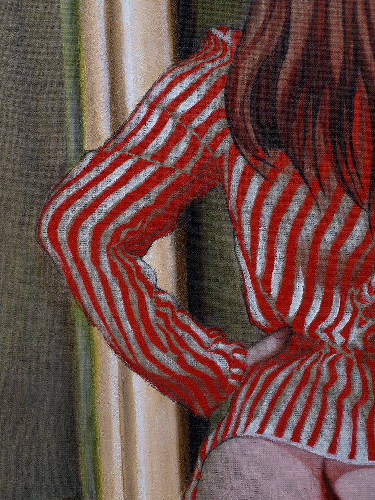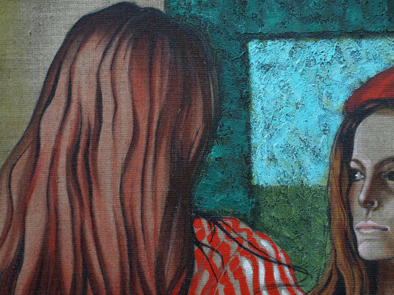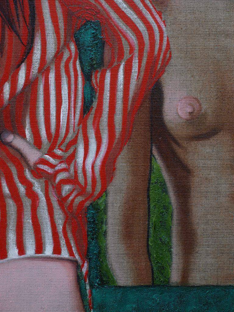 Interesował mnie kontrast surowego płótna z kolorem farb. Płótno zabezpieczone bezbarwnym akrylem.