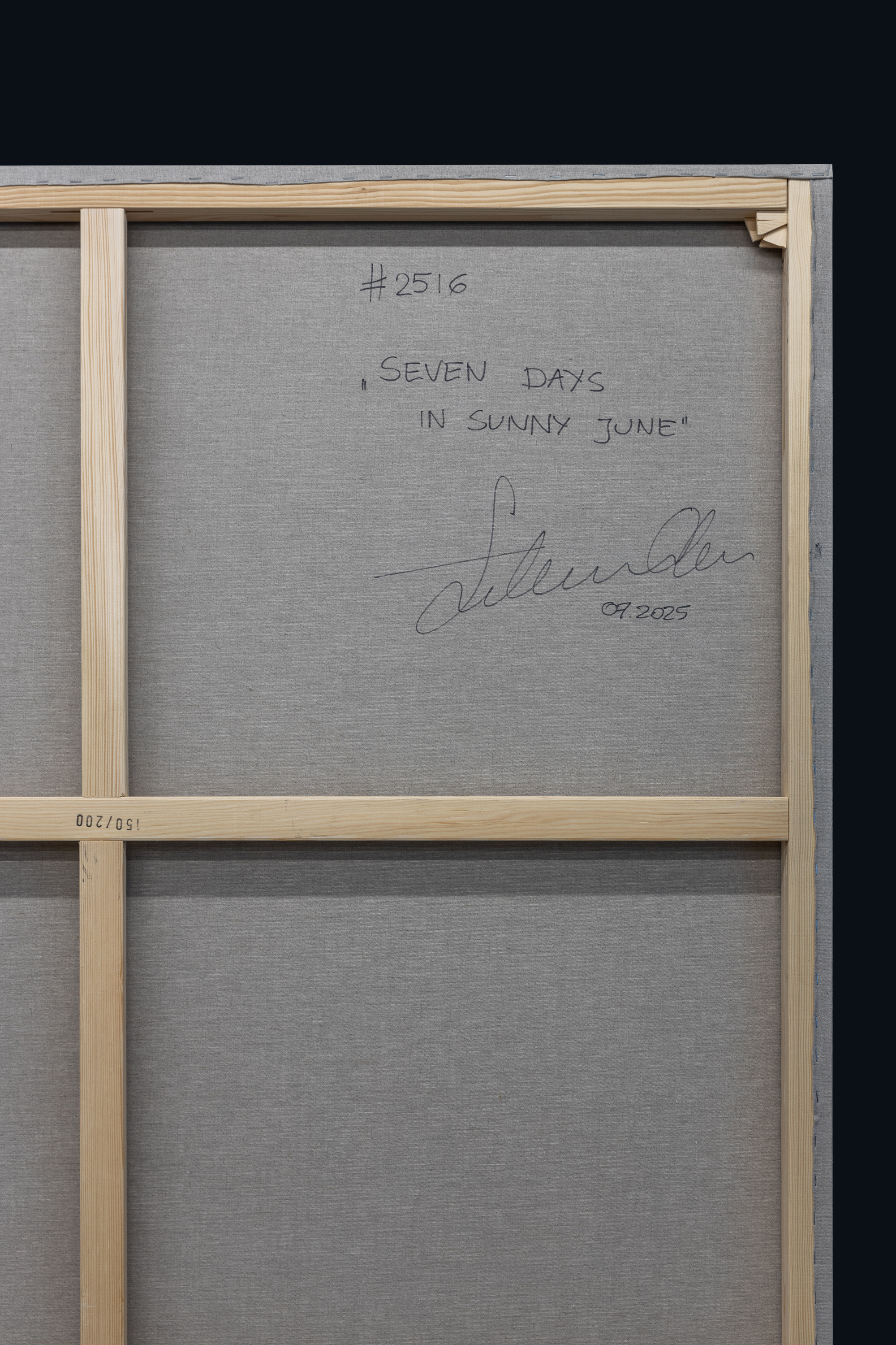 "Seven Days Inn Sunny June", akryl na płótnie lnianym 3D, boki - surowy len. Sygnowany z tyłu. Gotowy do zawieszenia. Mosiężna płytka z danymi autora z boku obrazu. Obrazy Łukasza Olka zapraszają do doświadczania świata widzianego jego oczami świata, w którym każdy krajobraz jest osobistym studium wspomnień, emocji i przemijającego piękna otoczenia. Urodzony w Warszawie w 1982 roku, swoje obrazy wielokrotnie prezentował na wystawach w prestiżowych galeriach na całym świecie. Reprezentowany jest przez galerie w Polsce, Stanach Zjednoczonych, Francji, Japonii, Korei i Australii, co odzwierciedla jego rosnące międzynarodowe uznanie. Artysta regularnie bierze również udział w targach sztuki, m.in. w Londynie, Nowym Jorku, Amsterdamie, Warszawie i Paryżu. Jego dzieła znalazły dotychczas kilkuset nabywców z całego świata. Prace Olka to synteza fragmentów krajobrazu redukująca je do ich elementarnych form koloru, światła i faktury. Jego podejście do malarstwa jest głęboko osobiste, uchwytujące nie tylko esencję wizualnego świata, ale także intymne uczucia samego artysty. Jego prace to introspektywna podróż, żywe wspomnienia rozciągnięte na płótnie, a każdy tytuł jest hołdem muzyki, które towarzyszyła mu w procesie twórczym. Ta synestetyczna interakcja koloru, dźwięku i wspomnień nadaje jego pracom niezwykłą zmysłowość i bezpośredniość Nieustanna, konsekwentna eksploracja fragmentarycznego krajobrazu zaprasza nas do świata, w którym każdy obraz jest wszechświatem samym w sobie.