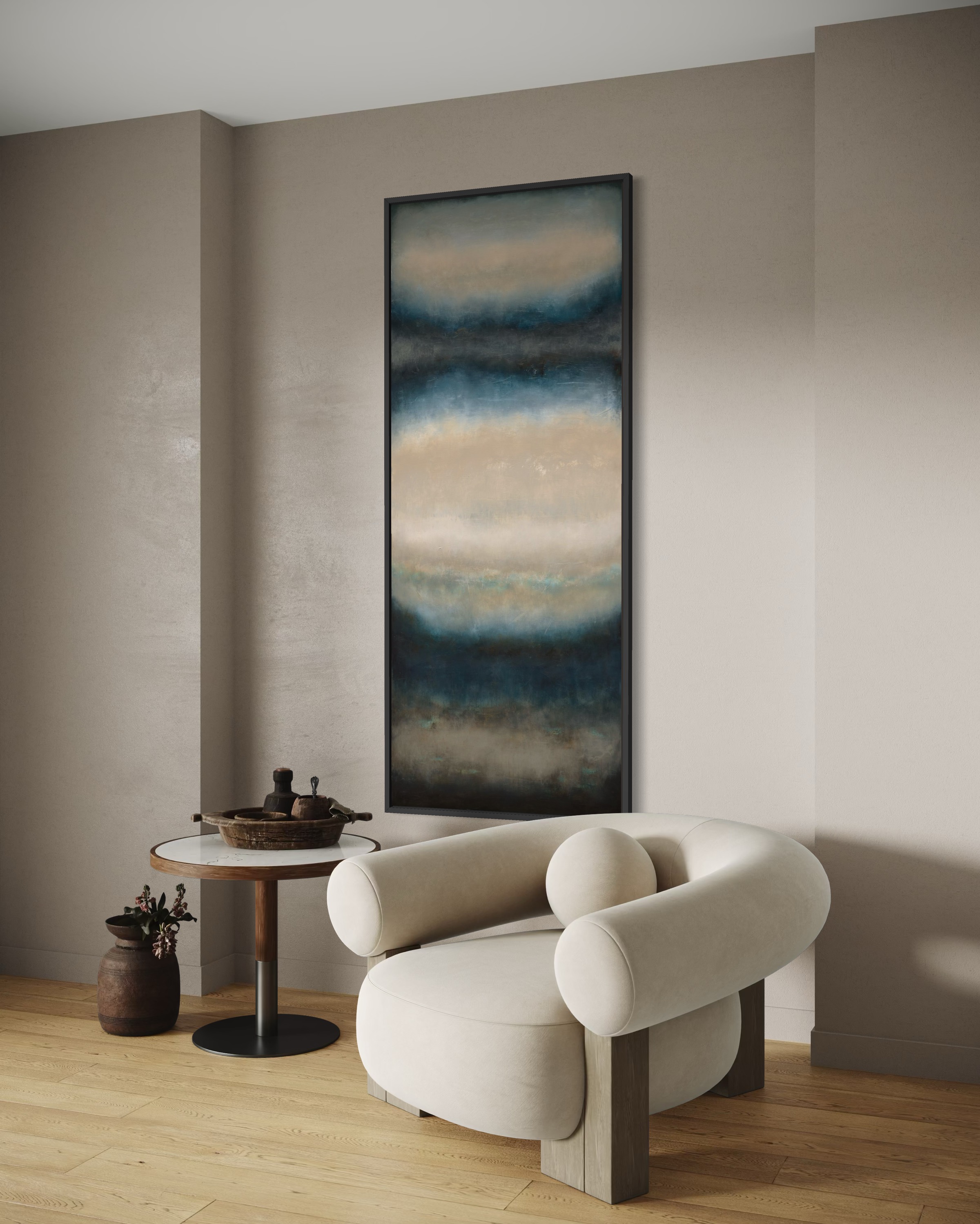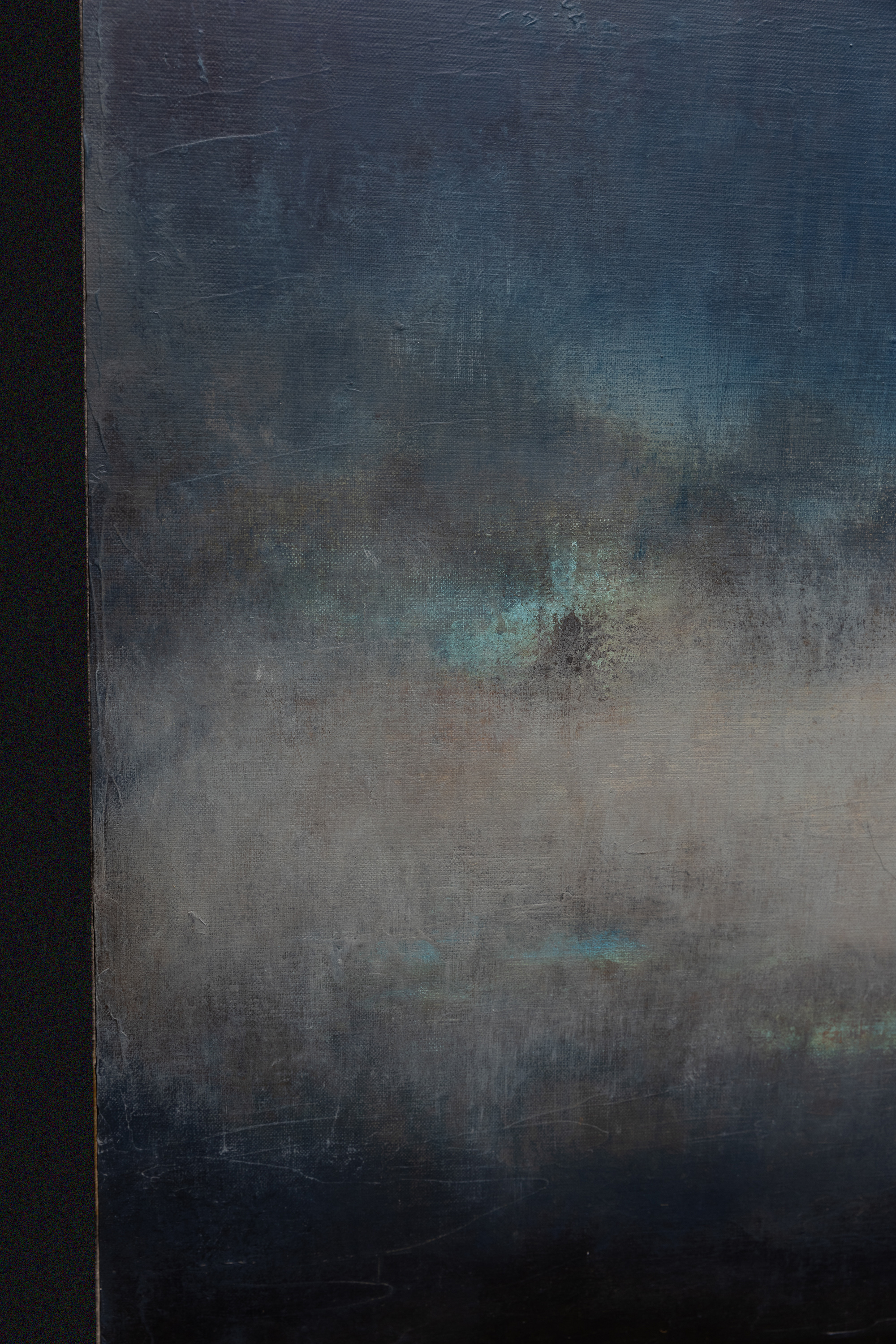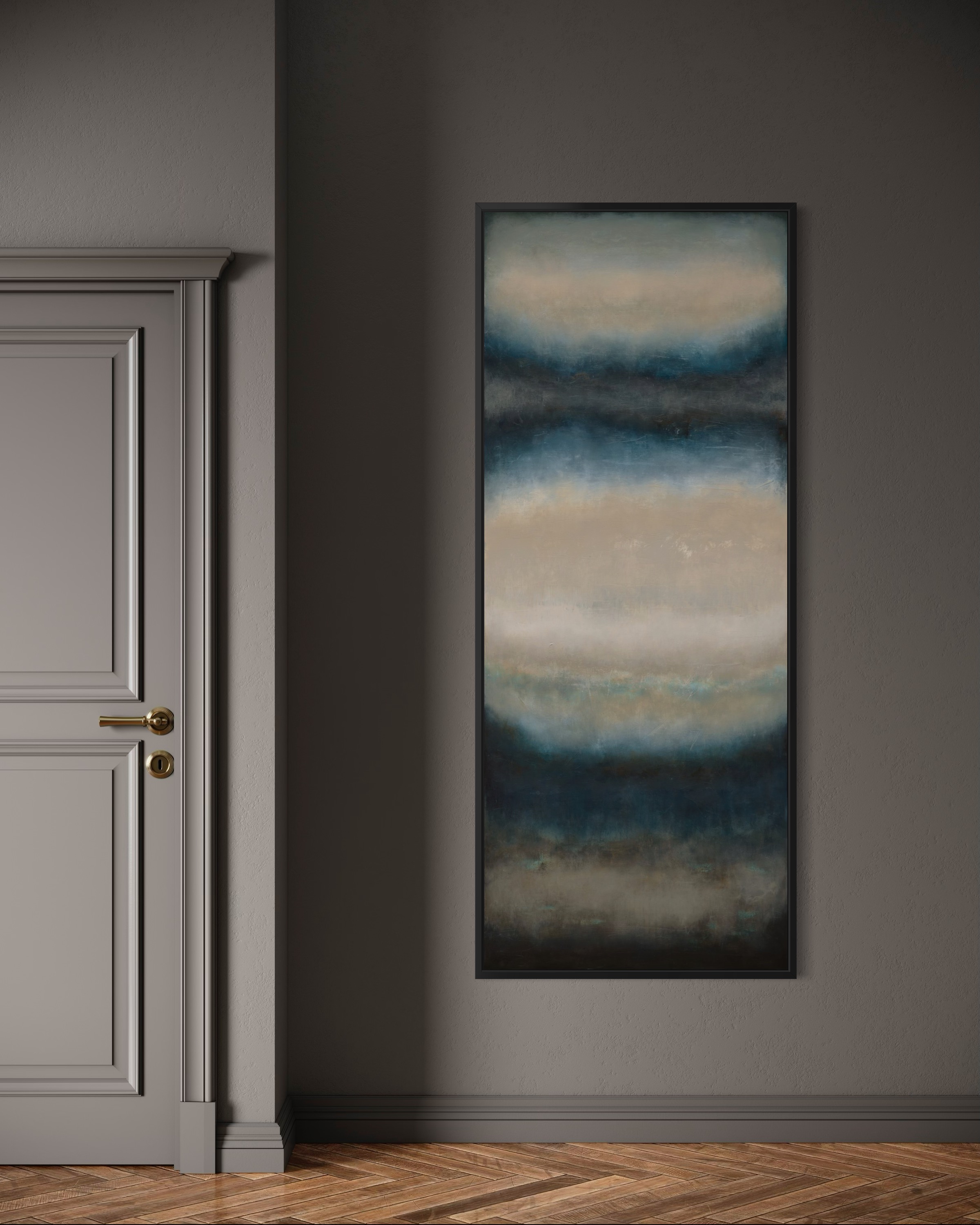"Storm Coming" (80 x 200 cm) to monumentalne studium napięcia, jakie towarzyszy naturze tuż przed nadejściem burzy. W ramach cyklu Blinkered, Łukasz Olek rejestruje moment, w którym powietrze gęstnieje, a niebo powoli przybiera ciemne, nasycone odcienie indygo i szarości. Jako synestetyk, artysta przekłada tę specyficzną wibrację i ciężar atmosfery na język koloru i faktury, tworząc kompozycję, która mimo swojego dramatyzmu, emanuje wyrafinowanym spokojem. Praca powstała na surowym lnianym płótnie 3D o pionowym formacie, co potęguje wrażenie ogromu nieboskłonu. Technicznie obraz jest efektem misternego dialogu między wielowarstwowymi laserunkami a agresywnym skrobaniem powierzchni. Olek celowo „wycisza” pierwotną energię barw, odkrywając jednocześnie historię zapisaną pod spodem. Artysta często podkreśla, że tworzy przede wszystkim dla siebie, a kolekcjonerzy stają się częścią jego wizualnego dziennika dopiero po ukończeniu procesu. Jego dzieła, doceniane od Miami po Paryż, są dowodem na to, że „uczciwość materiału” i autentyczność zapisu chwili tworzą unikatową wartość inwestycyjną. "Storm Coming" to idealny wybór dla kolekcjonerów szukających sztuki o silnym ładunku emocjonalnym, która zbalansuje nowoczesną, minimalistyczną przestrzeń.