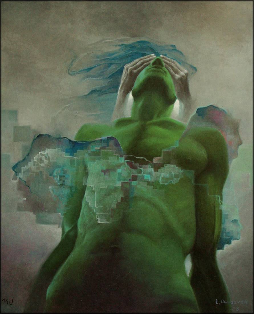Na obrazie dominują ciemne, ziemiste kolory, przenikające się z odcieniami zieleni i niebieskiego. Centralną postacią jest sylwetka osoby, której ciało zdaje się rozmywać w pikselowanych kształtach. Kompozycja jest dynamiczna, a ręce zakrywające twarz dodają tajemniczości. Wygląda to jak połączenie rzeczywistości z czymś ulotnym. Atmosfera jest pełna niepokoju i niejasności. Czy to sen, czy może fragment innego wymiaru? Artystycznie, obraz przypomina oniryczne wizje, mieszając realistyczne detale z abstrakcyjnymi formami. Technika ta może przywoływać style surrealistyczne. Emocje, jakie można odczytać to mieszanina smutku i izolacji. Taki obraz zmusza do refleksji, prowokując pytanie o granice percepcji i świadomości. Co tu się dzieje? Dla mnie, te rozmazane kształty są jak echo niedokończonej myśli. A może to "fragmentacja" to tylko metaphor? To dzieło można interpretować jako komentarz o współczesnym świecie, gdzie technologia zderza się z naszą humanistyczną naturą. Patrząc na to, czuję jednocześnie fascynację i pewien dyskomfort. Jakbym oglądał coś, co nie powinienem widzieć. Moim zdaniem, to obraz który nie pozwala o sobie zapomnieć.