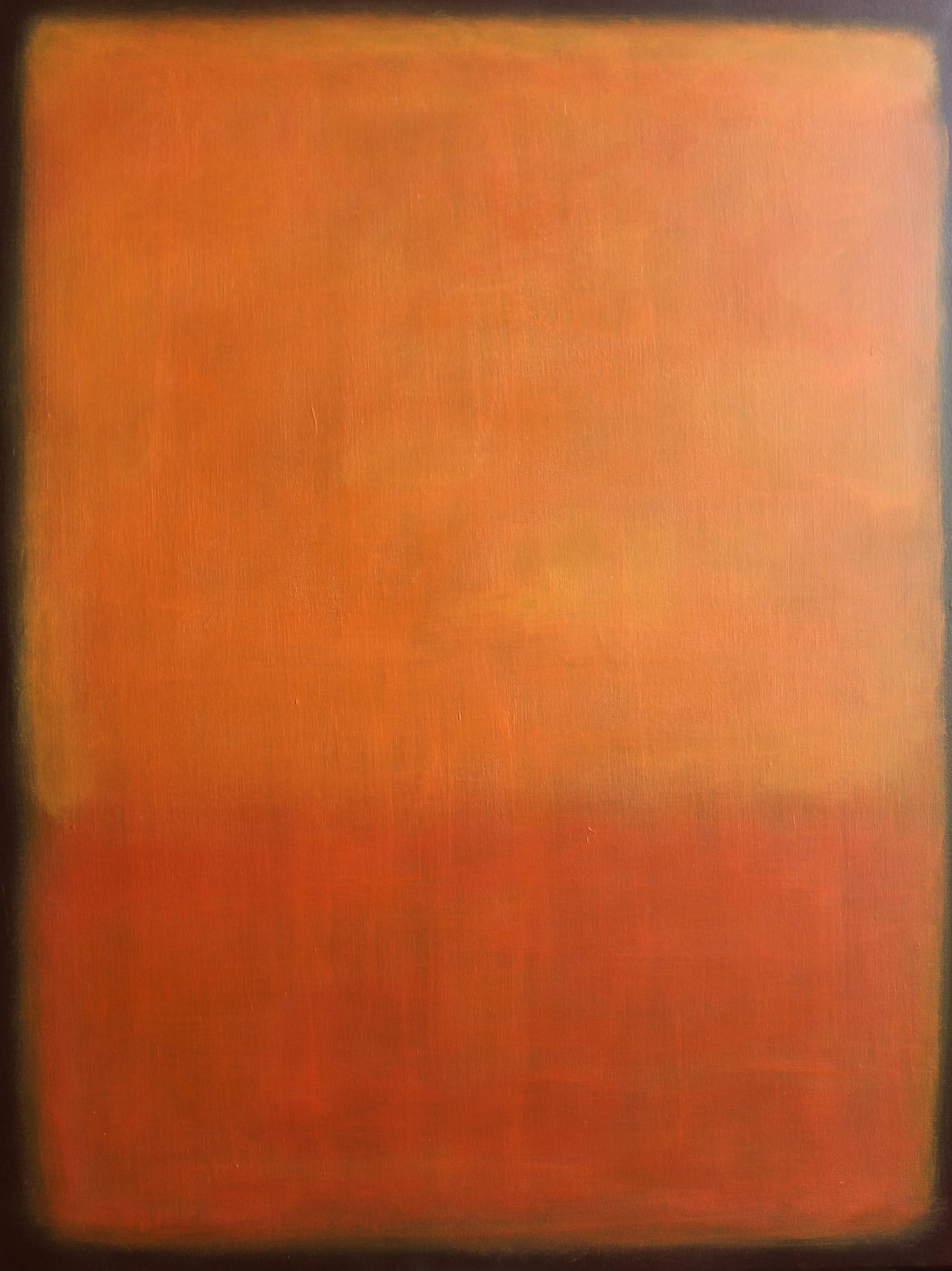 Obraz, który widzimy, składa się z intensywnych odcieni pomarańczu i brązu, tworzących prostokątne, symetryczne kompozycje. Kolory przenikają się delikatnie, tworząc miękkie przejścia, jakby artysta użył subtelnej techniki warstwowania farb. Całość emanuje ciepłem i spokojem, ale też lekko niepokojącą atmosferą. Coś jakby tajemnica wisiała w powietrzu. Styl jest abstrakcyjny, skupiony na emocjach, jakie wywołują kolory i ich układ. Prosty, lecz jednocześnie głęboko poruszający. Spoglądając na obraz, można poczuć jakby cichy głos w głowie mówił: "uspokój się, wszystko będzie dobrze". Technika malarska w tym dziele to prawdopodobnie olej na płótnie, co pozwala na stonowaną, ale wyrazistą paletę barw. Obraz wywołuje różnorodne emocje. Może być jak zajączek z ciepłego światła na chłodnej ścianie - coś, co dodaje otuchy w trudny dzień. Jednocześnie, jest w nim coś melancholijnego. Gdy na niego patrzę, czuję się jak na pustyni o zachodzie słońca, gdzie czas zwalnia, a myśli same się porządkują. To canvas, pełen prostoty, który inspiruje do refleksji nad własnym życiem, emocjami i tym, co ważne. Dziecko powiedziałoby pewnie: "WOW, takie wielkie i pomarańczowe, jak słońce!" I to właśnie to jest siłą takiej sztuki. Pozwala widzieć różne rzeczy, zależnie od tego, co w nas jest.