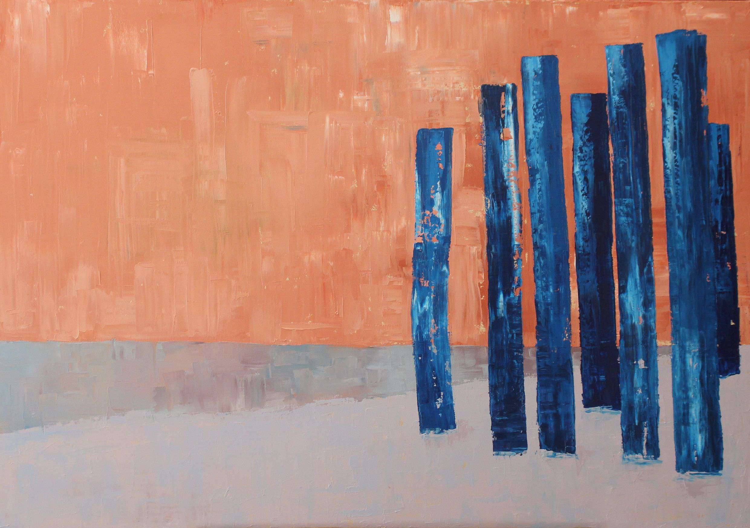 Na obrazie dominuje prostota formy i intensywność kolorów. Tło wypełnia delikatna, pastelowa pomarańcz, która przypomina ciepłe promienie zachodzącego słońca. Na tym tle wyrastają pionowe, prostokątne bryły w odcieniach głębokiego, morskiego błękitu. Kontrast między tymi barwami emanuje subtelną elegancją i spokojem. Kompozycja jest zrównoważona, mimo że nieco asymetryczna — niebieskie kształty zdają się kierować wzrok widza w prawą stronę obrazu. Obraz emanuje spokojem i pewną tajemniczością. Minimalizm formy i wyrazistość kolorów sprawiają, że można w nim odnaleźć elementy zarówno nowoczesnego, jak i abstrakcyjnego stylu. Technika pociągnięć pędzla tworzy teksturę, która wprowadza dynamikę do statycznej kompozycji. Te krzywe i linie są jakby na granicy chaosu i porządku. Wow, jakie to fajne! Obraz może budzić różnorodne emocje — od refleksji nad porządkiem świata po wewnętrzne wyciszenie. Dla mnie to jak spojrzenie w głąb nieznanego, w coś, co jednocześnie jest blisko, ale wciąż nieosiągalne. Kolorystyka wywołuje nostalgia for something lost and found. A co jeśli te niebieskie słupy to drzewa w zaczarowanym lesie? To takie poetyckie pytanie, które pozostaje w pamięci.