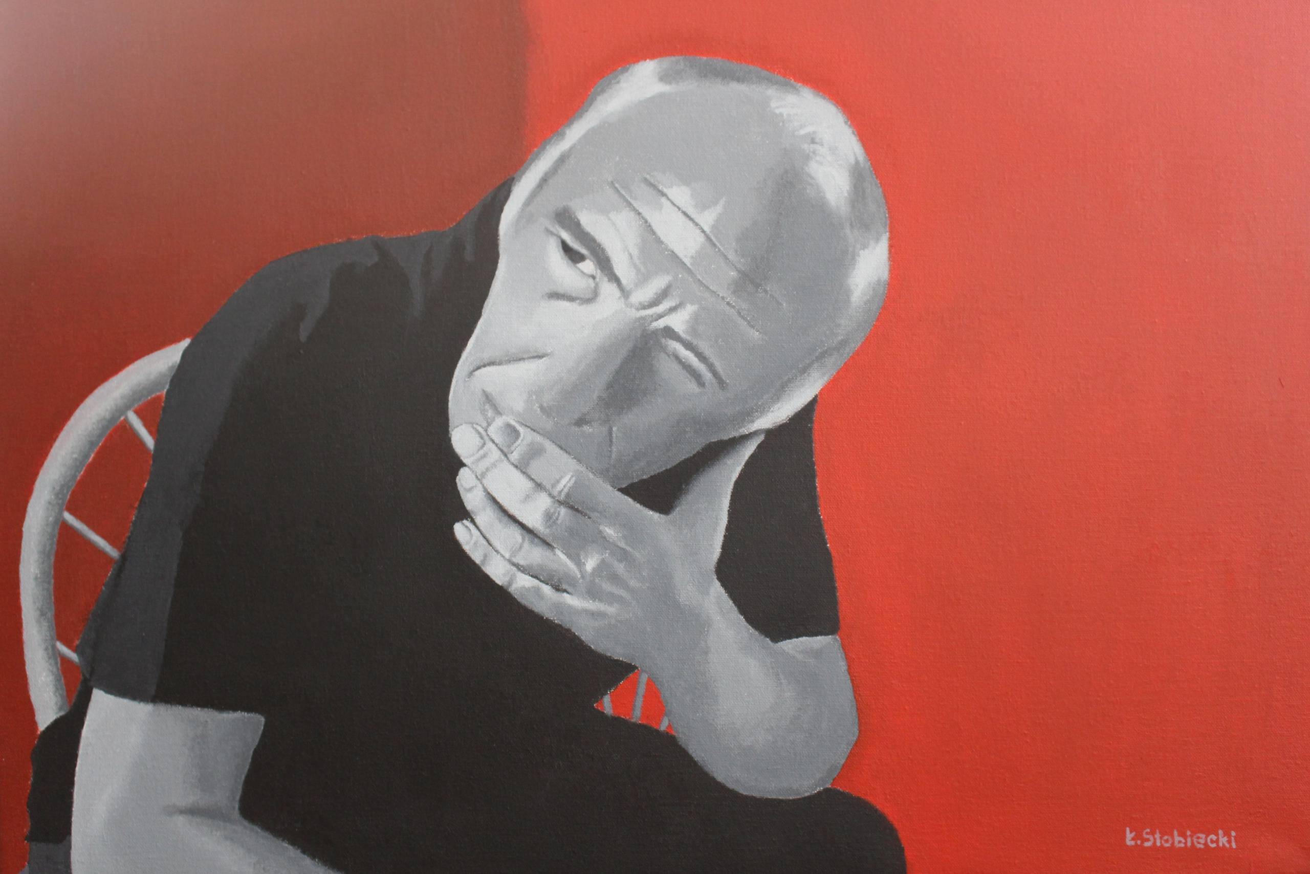 Obraz przyciąga wzrok intensywnym kontrastem czerwieni i szarości, tworząc wyrazistą kompozycję, która wprost mówi "zatrzymaj się i patrz". Postać o zamyślonym wyrazie twarzy prowokuje do rozważań, a jej ręka przy ustach podkreśla atmosferę zadumy i refleksji. Proste, ale wyraziście namalowane kształty skupiają uwagę na emocjach, które aż biją od płótna. Styl artysty jest prawdziwie minimalistyczny, co nadaje obrazowi nowoczesnego charakteru. Użycie mocnych barw i wyraźnych konturów to znak rozpoznawczy tego dzieła. Jakie emocje może budzić? Może smutek. Może nostalgia. A może po prostu zasłużony moment zatrzymania. Dla mnie obraz ten prawi o nieuchronności czasu, o chwilach, które mijają, gdy ty tu tylko siedzisz, my friend. To trochę jak życie - przenikające i pełne niespodzianek. Synek mojego kolegi rzekłby po prostu: pan myśli o cukierkach. I kto wie, może ma rację?