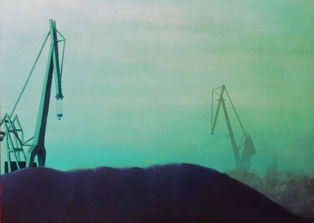 Obraz przedstawia melancholijny krajobraz industrialny, ogarnięty zamglonym błękitem. Dwa wysokie dźwigi wyłaniają się majestatycznie z mglistego tła, ich smukłe sylwetki kontrastują z horyzontem. Kompozycja zdaje się być prosta, ale ukrywa w sobie tajemnicę. Barwy są stonowane, dominujące odcienie niebieskiego i zielonego nadają obrazowi spokojny, nieco nostalgiczny nastrój. Artysta posługuje się techniką malarską z delikatnym rozmyciem konturów, co buduje aurę tajemniczości. Obraz emanuje spokojem, ale jednocześnie wywołuje lekki niepokój. Może to przypomnienie o przemijającym czasie, gdzie te maszyny były kiedyś symbolem postępu, a teraz stoją niemal zapomniane. Wprowadza refleksję: co się stanie, gdy znikną? Jako dziecko powiedziałbym: ojej, jakie wielkie żurawie! Artysta pieczołowicie balansował między rzeczywistością a snem. Mimo że obraz jest statyczny, zdaje się mówić ciche story o nieuchronnym przemijaniu. Magic! To chyba słowo, które tu pasuje. Zatrzymuje na chwilę w tym zatrzymanym momencie i zachęca do zadumy.