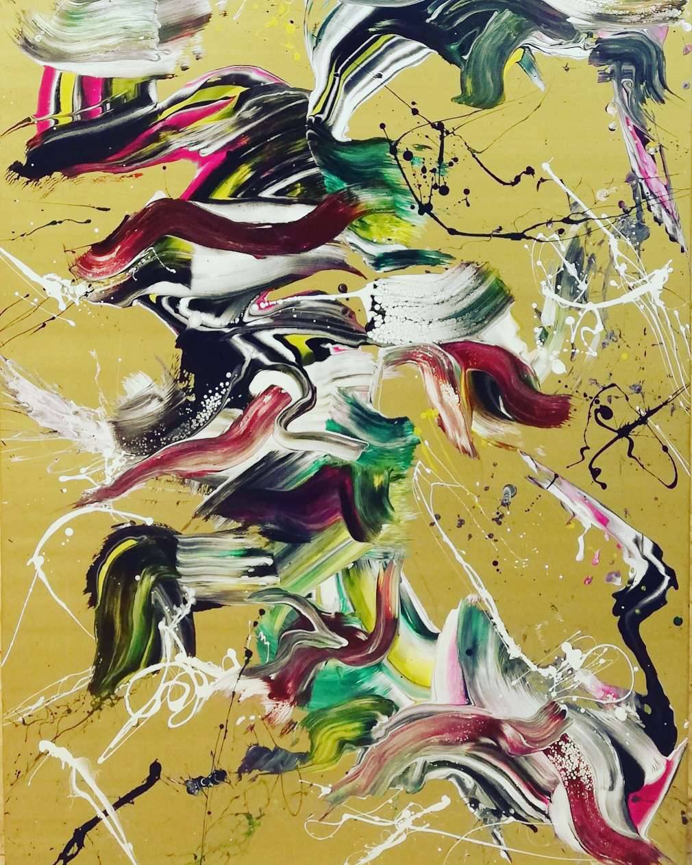 Obraz to prawdziwy chaos kolorów i kształtów na złotym tle. Na płótnie rozlewa się feeria barw: intensywne zielenie, głębokie czerwienie, różowe plamy i odrobina bieli utkane są w dynamicznych, falujących smugach farby. Forma jest abstrakcyjna, ale ma w sobie coś przyciągającego, jakby taniec farb i emocji na płótnie. Artysta zastosował technikę action painting, co dodaje dziełu energii i nieprzewidywalności. Splines kolorów przypominają wiry i pociągnięcia pędzla, które wywołują swoiste poczucie radości i spontaniczności. Obraz emanuje żywiołowością, jakby każda smuga żyła własnym życiem. To trochę jak oglądanie chmur i próbowanie nadawania im kształtów, wyobrażając sobie, że to może być coś więcej. Ten kalejdoskop form i kolorów zachęca do zatrzymania się na chwilę, eksploracji swojego wnętrza, a nawet pozostawienia go otwartego na dowolną interpretację. Wow, ale to jest bałagan, mógłby powiedzieć mały obserwator. Atmosfera dzieła jest jakby momentalna i uchwycona w biegu, co wyzwala uczucia entuzjazmu i ciekawości. Obraz poprzez swoją nieokiełznaną formę zdaje się mówić: "Explore me!", kusząc do podejścia bliżej i odkrycia ukrytych detali. To dzieło, które niezależnie od poziomu wiedzy o sztuce, rozbudza wyobraźnię i pozwala na osobiste refleksje.