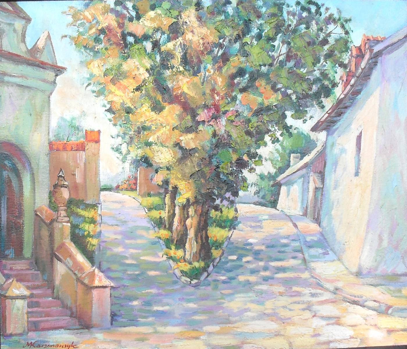 Obraz ukazuje malowniczą uliczkę, gdzie dominują ciepłe odcienie: złote, zielone i pastelowe błękity. Centralnie umieszczone duże drzewo rozpościera swe gałęzie niczym parasol, a słońce migocze przez liście, tworząc na bruku taniec świateł i cieni. Architektura po bokach przedstawia stare, urokliwe budynki z ceglastymi dachami. To zakamarek pełen spokoju, gdzie czas płynie wolniej, a każdy krok przenosi nas w odległe czasy. Atmosfera obrazu emanuje nostalgią i zadumą. Artysta zastosował technikę impasta, nadając dziełu tekstury i dynamiki. Jest tu swoista impresja, lecz z nieco bardziej uporządkowanym podejściem do kompozycji. Ten obraz wręcz zaprasza do spaceru, przenosząc odbiorcę w miejsce pełne historii i wspomnień. Emocje, jakie wywołuje ten widok, są mieszanką radości i melancholii. Patrząc na to dzieło, można poczuć "serenity", jakby świat zatrzymał się na chwilę, aby oddać hołd prostym chwilom. "To wygląda jak w bajce" - powiedziałoby dziecko, patrząc na ten sielankowy zakątek. Obraz skłania do refleksji nad prostotą życia, odnawiając wiarę w piękno codziennych chwil.