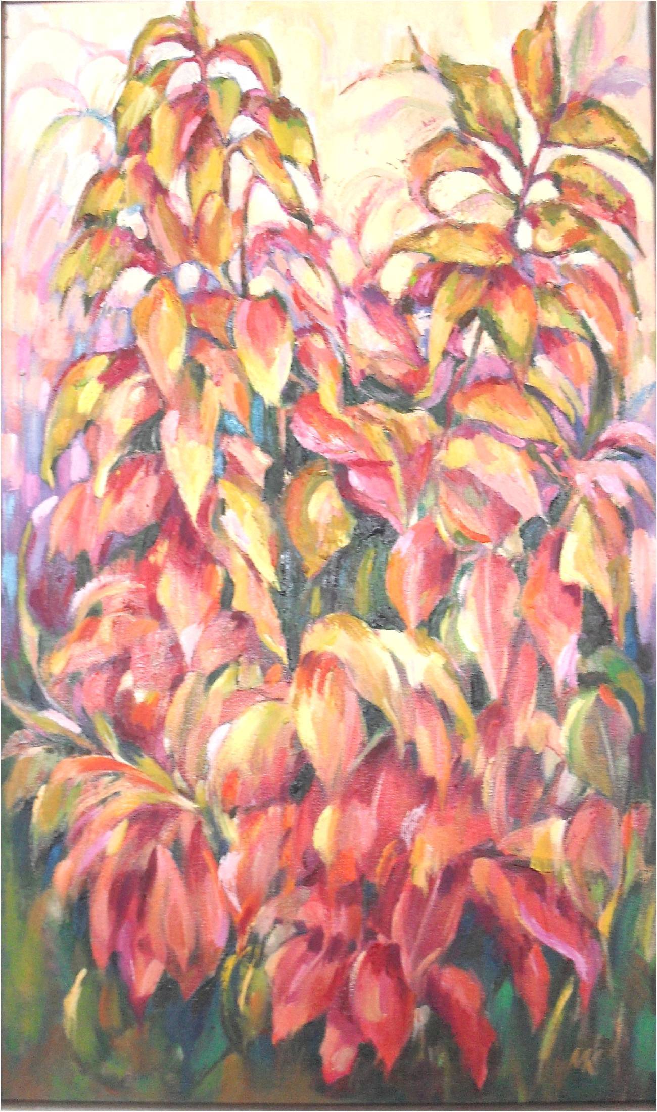 Na obrazie tętni kolorami, które przenikają się niczym nuty w symfonii. Dominują ciepłe odcienie czerwieni, pomarańczu i żółci, które w połączeniu z zielenią oraz subtelniejszymi różami tworzą niemal magiczną atmosferę wczesnej jesieni. Liście wirują w chaotycznej harmonii, przypominając żywiołowy taniec na wietrze. To jak bajka opowiadana przez naturę, pełna tajemnic i ukrytych znaczeń. Artysta zastosował technikę impastu, co dodaje głębi i struktury. Pociągnięcia pędzla są odważne, niemalże roztańczone, co nadaje kompozycji dynamiczności. Styl może przypominać impresjonizm, z pewną dawką abstrakcji, dzięki czemu każdy odnajdzie w obrazie coś innego. Czy to szept przyrody, czy krzyk energii. Obraz budzi we mnie ciepłe uczucia, jakbym znów był dzieckiem biegającym wśród liści. Wow, jakby one tańczyły razem z mną! English word? Pure "joy". Te kolory, te kształty. Wszystko po prostu genialne. Senny nastrój obrazu skłania do refleksji nad przemijającym czasem i pięknem ulotnych chwil. Atmosfera jest nostalgiczną, ale jednocześnie pełna optymizmu. Coś jest w tym obrazie, co porusza w środku i każe uśmiechnąć się do samych siebie.