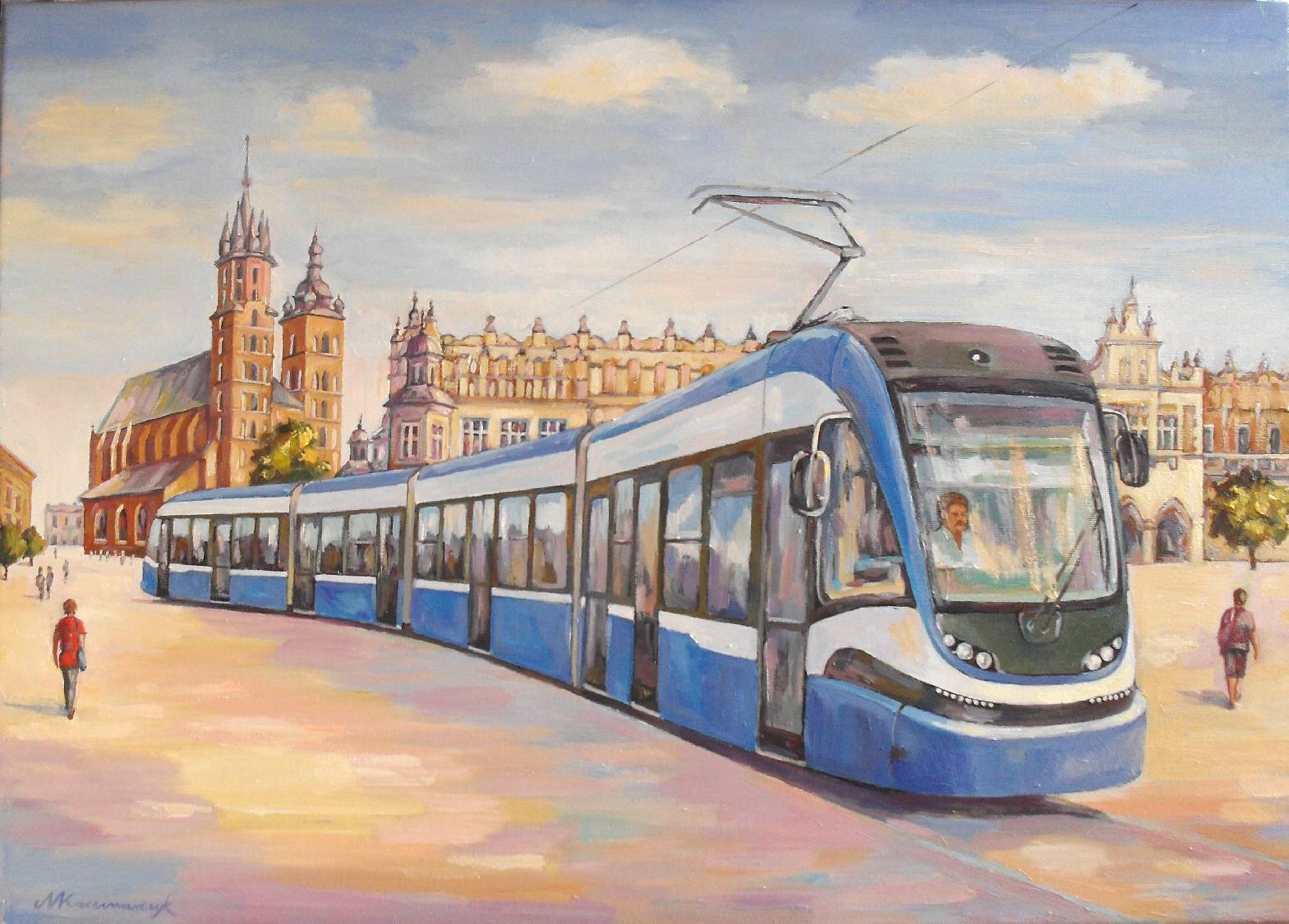 Obraz przedstawia piękny, miejski pejzaż z majestatycznym tramwajem, który sunie przez plac pełen historii. Dominują kolory błękitu i ciepłych odcieni piaskowca, które tworzą harmonijną kompozycję. Po lewej stronie wznosi się zabytkowy kościół z charakterystycznymi wieżami, zaś po prawej można dostrzec eleganckie budynki przypominające dawny styl architektoniczny Krakowa. Atmosfera emanuje spokojem i lekkością, jakby czas zwolnił na chwilę w tym historycznym miejscu. Artysta zastosował technikę impasto, wzbogacając fakturę obrazu, co widać w delikatnych, pastelowych smudgach nieba. Jasne kolory tramwaju kontrastują z otoczeniem, nadając scenie bardziej nowoczesny twist. Człowiek siedzący w tramwaju zdaje się być zatopiony w myślach, a jego obecność dodaje całej scenie codziennego realizmu. Kiedy patrzysz, czujesz, jakbyś przeniósł się na chwilę do centrum miasta. "Tramwaj jedzie szybko!", mogłoby powiedzieć dziecko, wpatrując się z fascynacją. To dzieło buduje most między przeszłością a teraźniejszością, pokazując, jak ciągła zmiana staje się częścią miejskiego krajobrazu. Wszystko na miejscu, wszystko idealnie skomponowane, a ja nie mogę się doczekać kolejnego przejazdu takim tramwajem. Wow, such beauty!