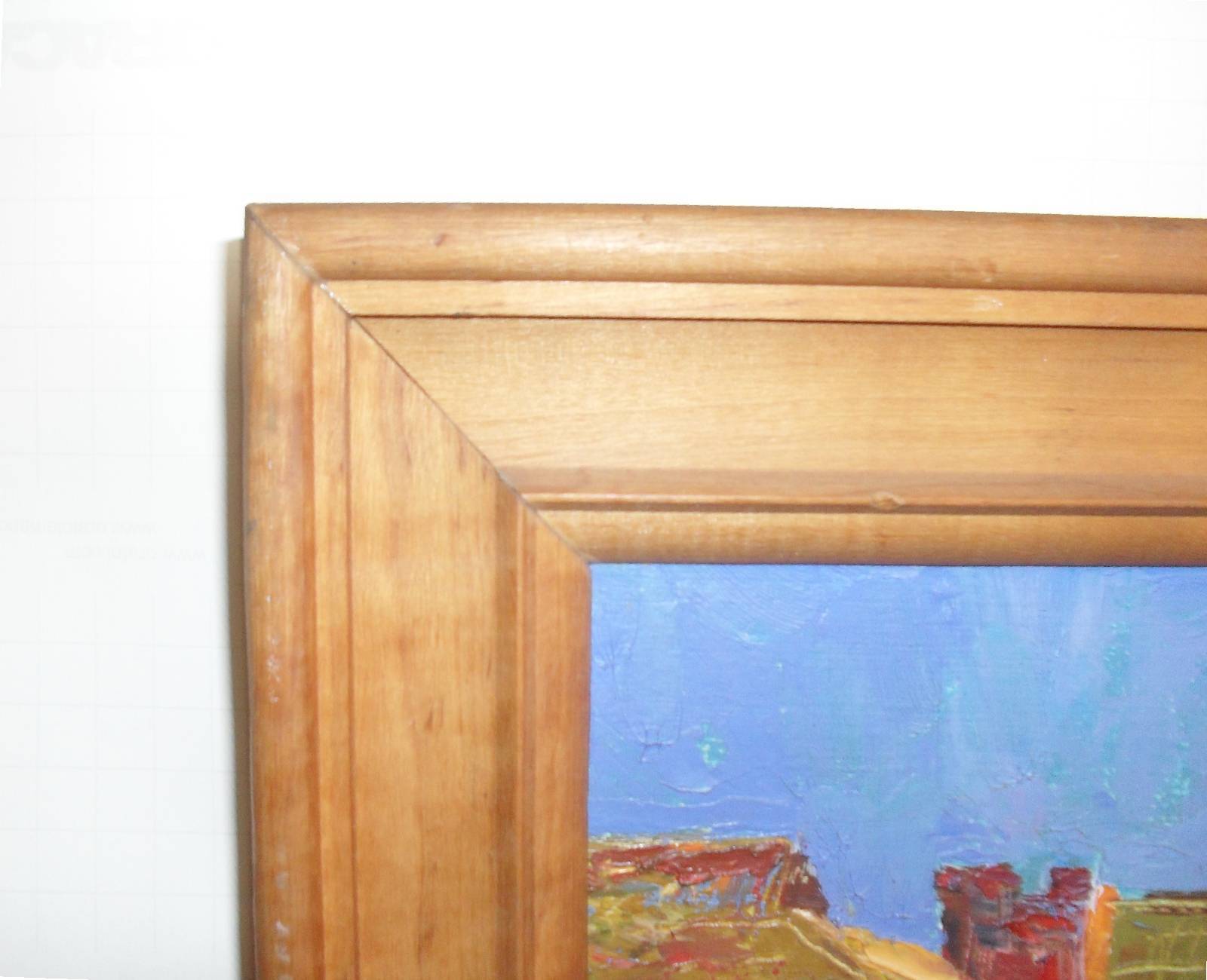 Obraz malowany szpachlą grubymi impastami, oprawiony w ramę drewnianą koloru naturalnego.