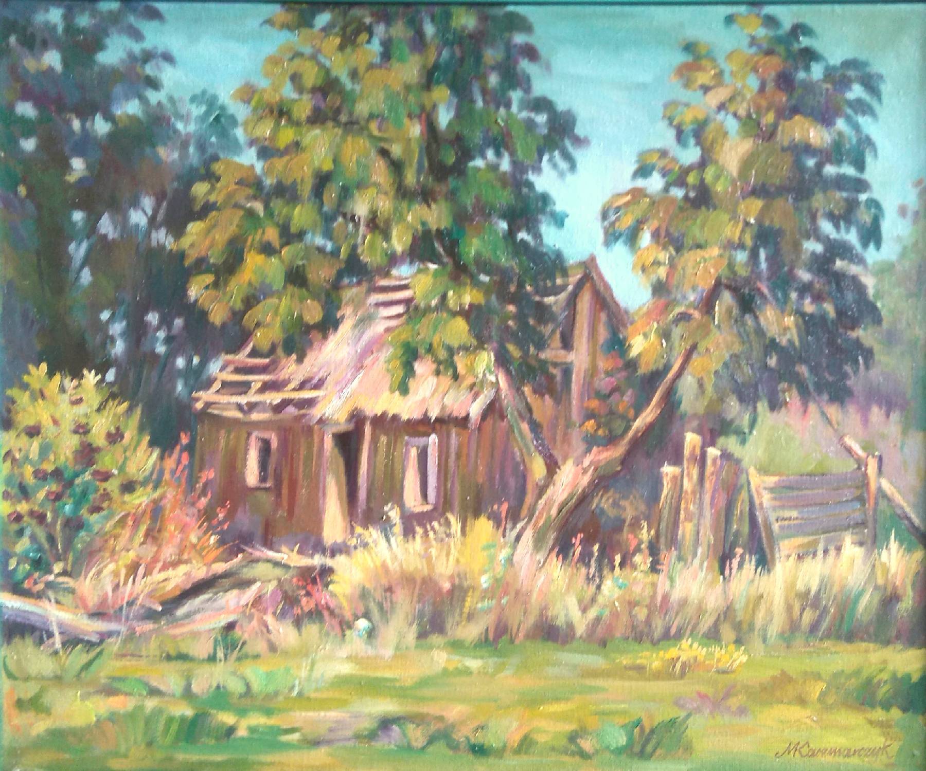 Na obrazie widzimy zjawiskowy, rustykalny pejzaż, który przyciąga wzrok swoim bogactwem kolorów. Dominuje tu zieleń, która przeplata się z brązami i złotymi odcieniami, tworząc atmosferę spokoju i nostalgii. W centrum znajduje się stara chatka, której dach wydaje się ledwo trzymać. Obok niej widać drzewa, które delikatnie kołyszą się na wietrze, a ich liście migoczą w słońcu jak małe, zielone płomyki. Ktoś kiedyś mieszkał w tej chatce – to przychodzi na myśl, gdy się patrzy. Obraz emanuje nostalgicznym urokiem, przywołując wspomnienia dni spędzonych na wsi. Artysta zastosował technikę impasto, co nadaje fakturze wyjątkową głębię i sprawia, że krajobraz wydaje się niemalże namacalny. Barwy są intensywne, ale zarazem łagodne, co dodaje im pewnej "softness". Można by rzec, że scena ta jest jak ciepły kocyk, w który można się wtulić. Dzieło wywołuje uczucie bezpieczeństwa, ale i ulotności. Jest w nim coś emocjonalnego, jak piosenka śpiewana przez babcię na dobranoc. Mogłoby to być miejsce, gdzie przygody czekają za każdym rogiem. Czuję, jakbym sam tam był – słyszę śpiew ptaków i szelest liści. Mama mówi, że niedaleko nas były takie chatki. Czas zatrzymał się tutaj, zatrzymany w tej malarskiej formie. Obraz jest niczym okno do przeszłości, które zaprasza do podróży w czasach, gdy życie było prostsze i wolniejsze.