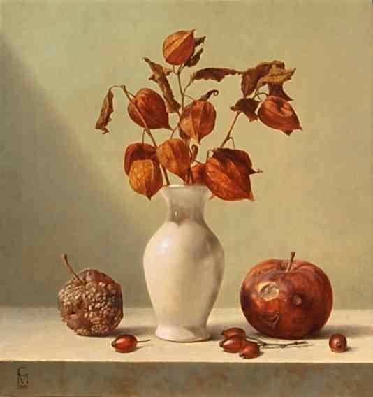Na obrazie widzimy martwą naturę, która emanuje spokojem i nostalgią. W centrum białego, ceramicznego wazonu znajdują się gałązki z ciepło pomarańczowymi liśćmi, które wyróżniają się na tle stonowanego, zielonkawego tła. Po bokach wazonu leżą jabłko i orzech, a nieco dalej małe, brązowe owoce. Kompozycja jest wyważona, a delikatne światło podkreśla ich fakturę, nadając scenie subtelności i elegancji. Atmosfera jest trochę jak "peaceful afternoon", przyjemna, ale z nutą przemijania, która może wzbudzać refleksję nad czasem. Artysta zastosował realistyczny styl, pełen szczegółowości. Technika malarska w niesamowity sposób oddaje grę światła i cienia, tworząc wrażenie trójwymiarowości. Te subtelne cienie i refleksy dodają dziełu głębi. Dziecko mogłoby powiedzieć: To wygląda jak prawdziwe jabłko, mogę je zjeść? Dla mnie to obraz, którym można się gapić bez końca, odkrywając coś nowego za każdym razem. Przypomina mi jesienne popołudnia spędzone na wsi, kiedy czas płynął wolniej. Takie obrazy potrafią wzbudzać w ludziach różne emocje. Może wywołać uczucie ciszy i spokoju, ale również lekkiego smutku nad przemijaniem piękna. To dzieło naprawdę zachęca do chwilowej zadumy.