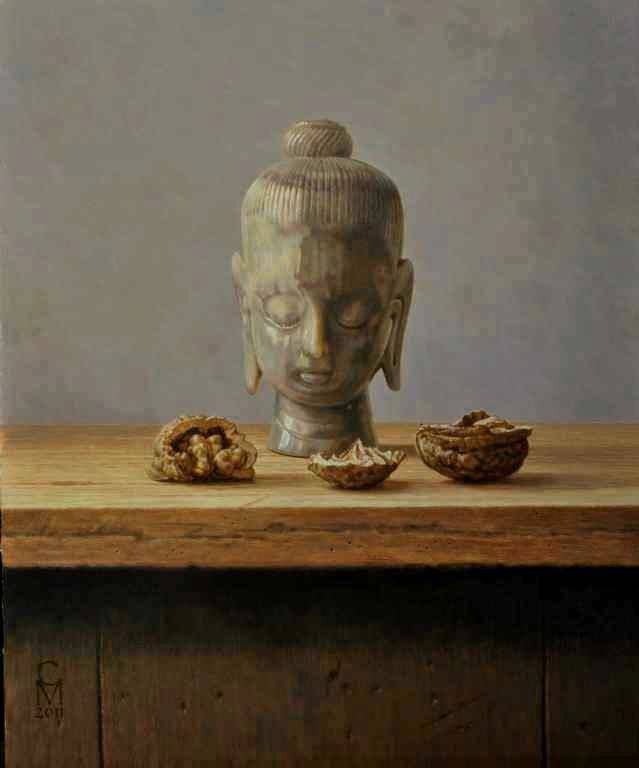 Na obrazie widzimy spokojną kompozycję przedstawiającą głowę buddy obok trzech połówek orzechów włoskich rozłożonych na drewnianym stole. Kolory są stonowane, z dominacją ziemistych odcieni brązów i beżów, co nadaje dziełu ciepły i enigmatyczny charakter. Światło delikatnie oświetla powierzchnię, tworząc subtelne cienie, które dodają głębi. Atmosfera obrazu jest medytacyjna i wyciszająca, sprawiając, że odbiorca może poczuć wewnętrzny spokój. Artysta stosuje realistyczne techniki malarskie, dbając o każdy detal – zarówno w rysach twarzy buddy, jak i w skomplikowanej fakturze orzechów. Dzieło budzi różnorodne emocje. Z jednej strony odnajdujemy w nim poczucie harmonii, z drugiej tajemniczości. Może to symbolizować równowagę między światem materialnym a duchowym. Niektórzy mogą poczuć nutkę nostalgii, patrząc na te proste, ale głęboko symboliczne elementy. "Wow, ten Budda jest taki fajny!". Styl obrazu przypomina nieco klasyczne martwe natury, ale z nutką filozoficznej refleksji. W ten sposób artysta łączy estetykę z głębszym przesłaniem. Całość sprawia, że trudno oderwać wzrok. To połączenie prostoty i głębokiego znaczenia działa jak tajemnicze okno do innego, spokojniejszego świata. A teraz pomyśl – jak mały kawałek orzecha może mieć takie "impact"?