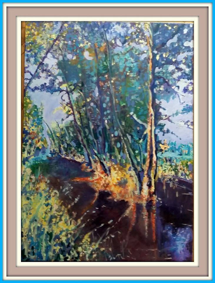 Obraz przedstawia bujny krajobraz leśny, pełen żywych kolorów i foremek. Dominują tu zielenie, błękity i delikatne odcienie brązu. Centralnym punktem jest smukłe drzewo, którego korzenie zdają się połykać światło. Światło i cień tworzą dynamiczny kontrast, przyciągając wzrok do środka kompozycji. To trochę jak tajemniczy ogród! Atmosfera obrazu jest pełna spokoju, ale jednocześnie czujemy jakąś przygodę, niepewność. Artysta posłużył się techniką pointylizmu, kropki kolorów mieszają się przed oczami widza, tworząc iluzję ruchu i życia w każdym detalu. Obraz ma w sobie impresjonistyczny vibe, gdzie każde pociągnięcie pędzla wydaje się być przemyślane i spontaniczne zarazem. Działa na emocje - wprowadza w stan zadumy nad pięknem natury i nieograniczoną wyobraźnią. To tak, jakby obraz mówił: "spójrz, jak piękno chowa się tuż za rogiem". Czujesz nostalgia czy raczej ekscytację? I trochę też taki "wow" efekt. Magiczne miejsce, do którego chce się wracać w myślach.