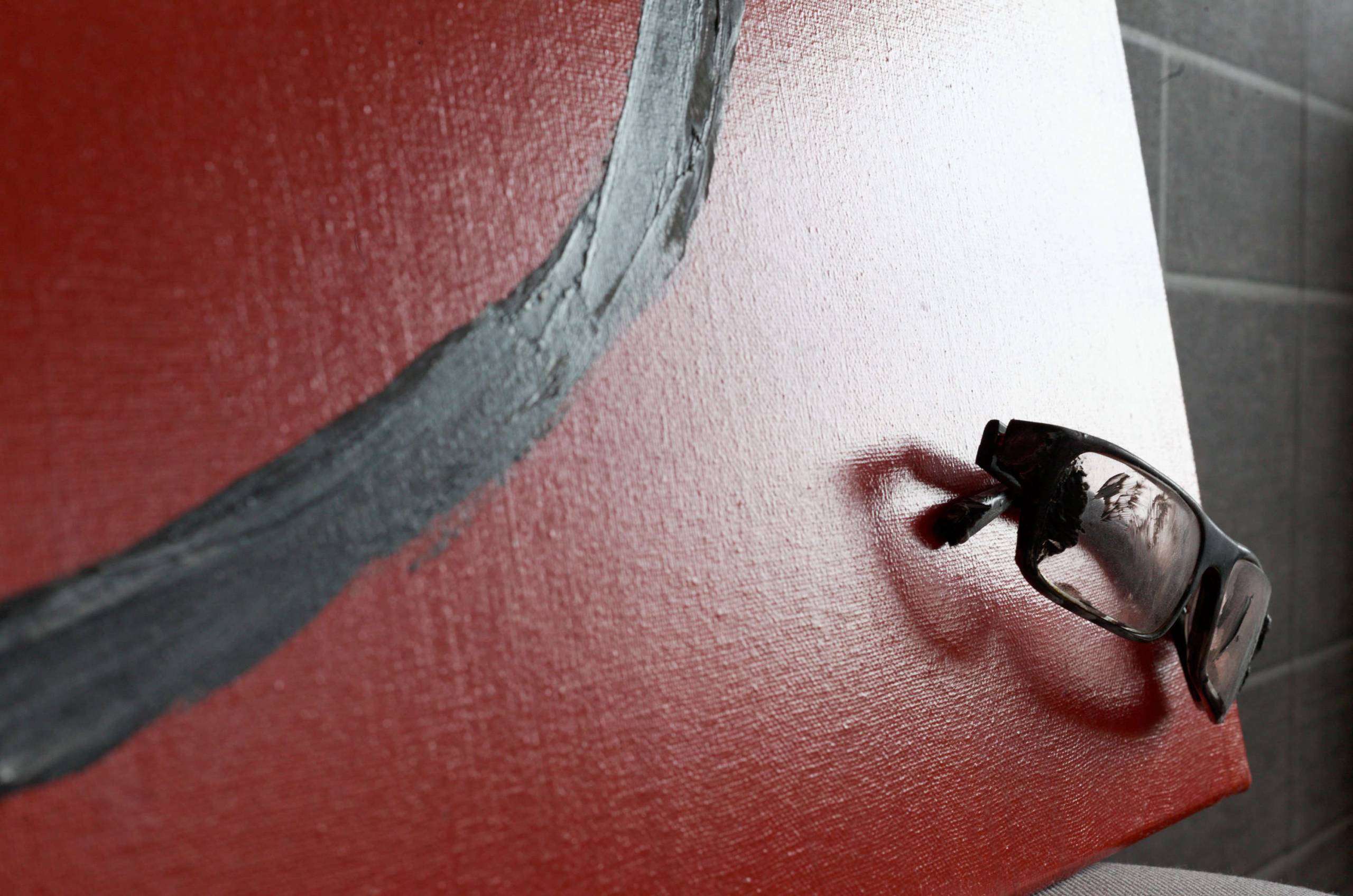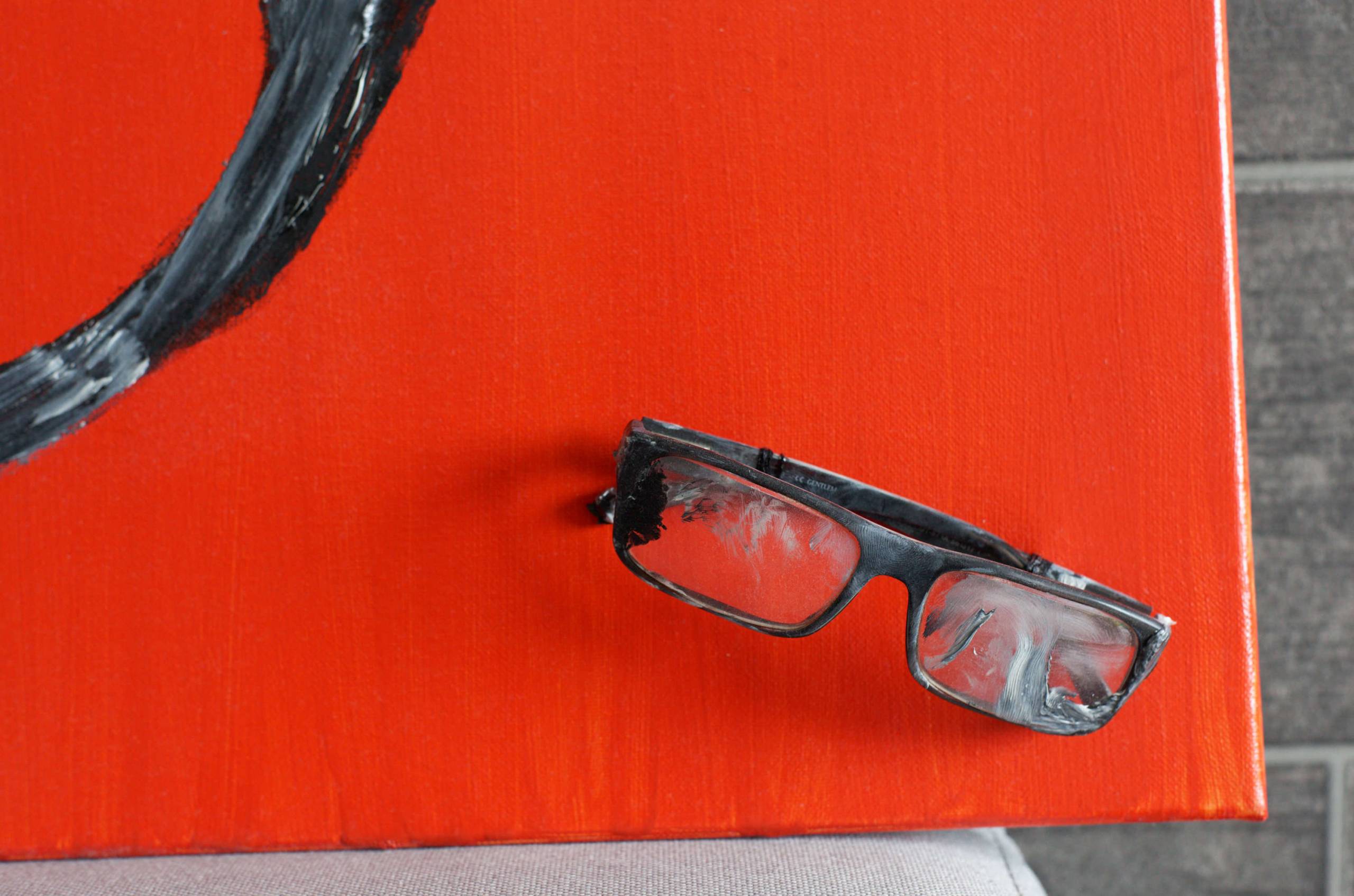 Przedstawiam obraz "odprzedmiotowienie - okulary" z cyku 4 obrazów "odprzedmiotowienie". Artysta maluje obrazy gdzie najważniejszą wartością jest odprzedmiotowienie zużytych przedmiotów, które zwykle lądują na dnie szuflady, warsztatu, skrzyni czy kosza. Każdy z obrazów był malowany przedmiotem który przedstawia, przedmiot którym malował artysta jest również częścią samego dzieła.