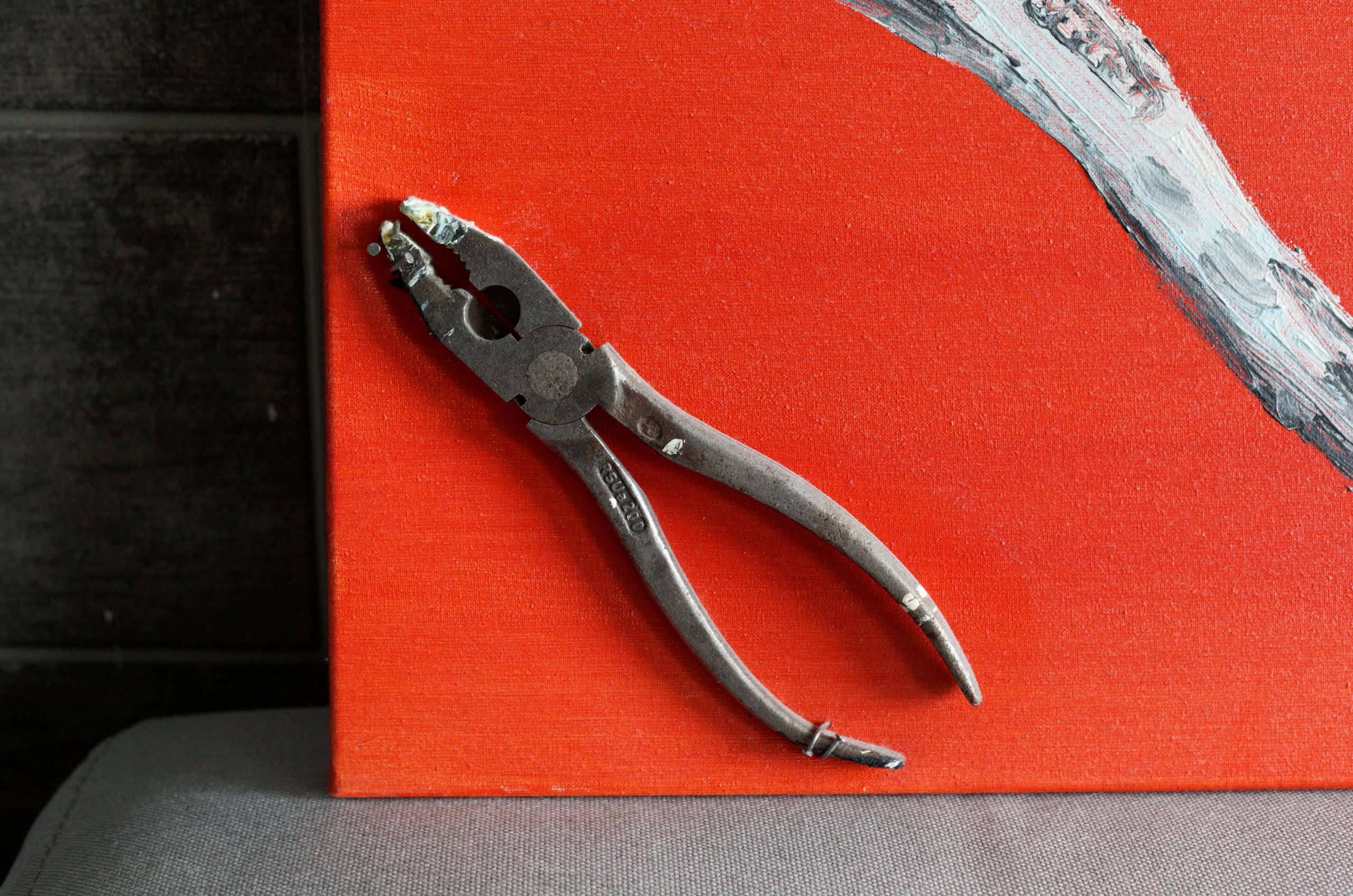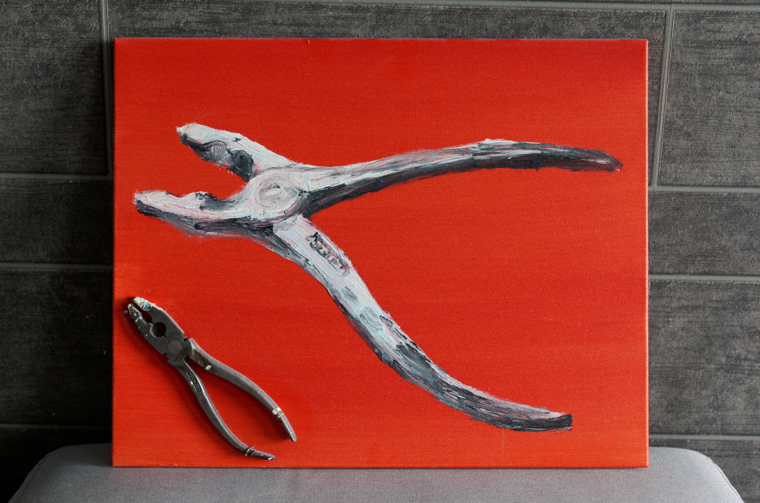 Przedstawiam obraz "Odprzedmiotowienie - Szczypce" z cyku 4 obrazów "odprzedmiotowienie". Artysta maluje obrazy gdzie najważniejszą wartością jest odprzedmiotowienie zużytych przedmiotów, które zwykle lądują na dnie szuflady, warsztatu, skrzyni czy kosza. Każdy z obrazów był malowany przedmiotem który przedstawia, przedmiot którym malował artysta jest również częścią samego dzieła.