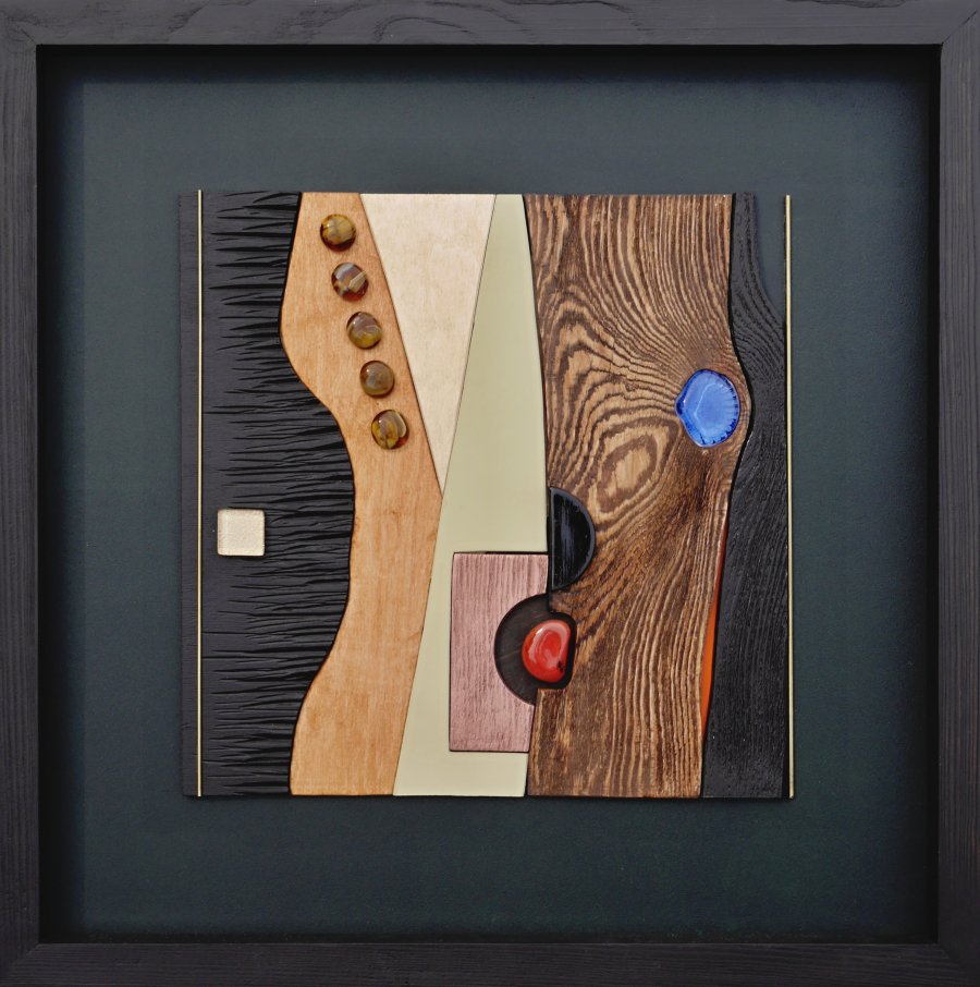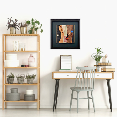 Obraz to prawdziwy kalejdoskop form i kolorów, które przykuwają uwagę od pierwszego spojrzenia. Dominują tu ziemiste odcienie brązu przeplatane z głęboką czernią i mocnymi akcentami błękitu i czerwieni. Po lewej stronie widzimy kształty przypominające fale, które płynnie przechodzą w bardziej surowe, drewniane faktury po prawej stronie. Kompozycja jest wyważona i harmonijna, mimo że na pierwszy rzut oka wydaje się chaotyczna. W centrum uwagę przyciągają błyszczące, niemal magiczne elementy. Całość emanuje spokojem i dyskretną elegancją, którą chciałoby się zamknąć w jednym słowie: "Harmony". Artysta zastosował technikę asamblażu, łącząc różne materiały w jedną spójną całość. Detale są precyzyjnie wykończone, co w połączeniu z ciepłą kolorystyką może wywoływać uczucie nostalgii i spokoju. To dziwne, ale patrząc na ten obraz, czuję przypływ unikalnej energii, jakby chciał mi coś powiedzieć, ale robi to w subtelny sposób. Fascynujące jest to, jak obraz potrafi nas zaskoczyć i pobudzić do głębszej refleksji, mimo że na pierwszy rzut oka wydaje się być tylko zbiorem przypadkowych form. Ktoś mógłby pomyśleć, że dla dziecka to tylko kolorowy obrazek, ale ja widzę tu całą historię pełną emocji i tajemnic.
