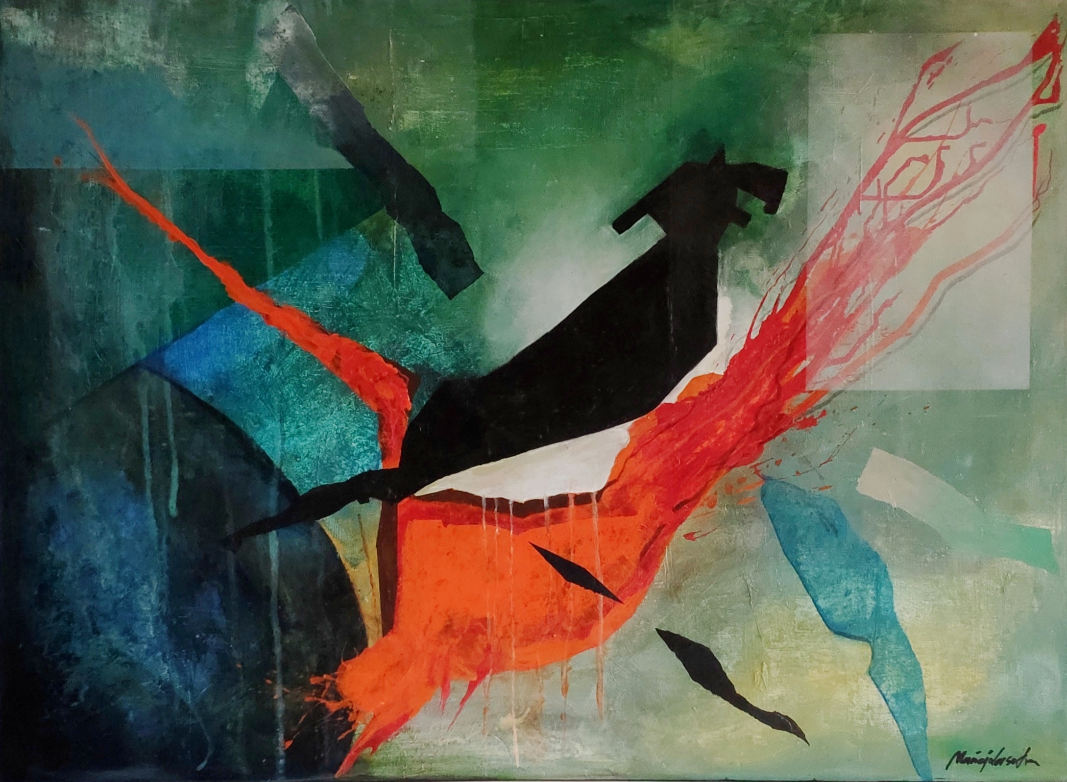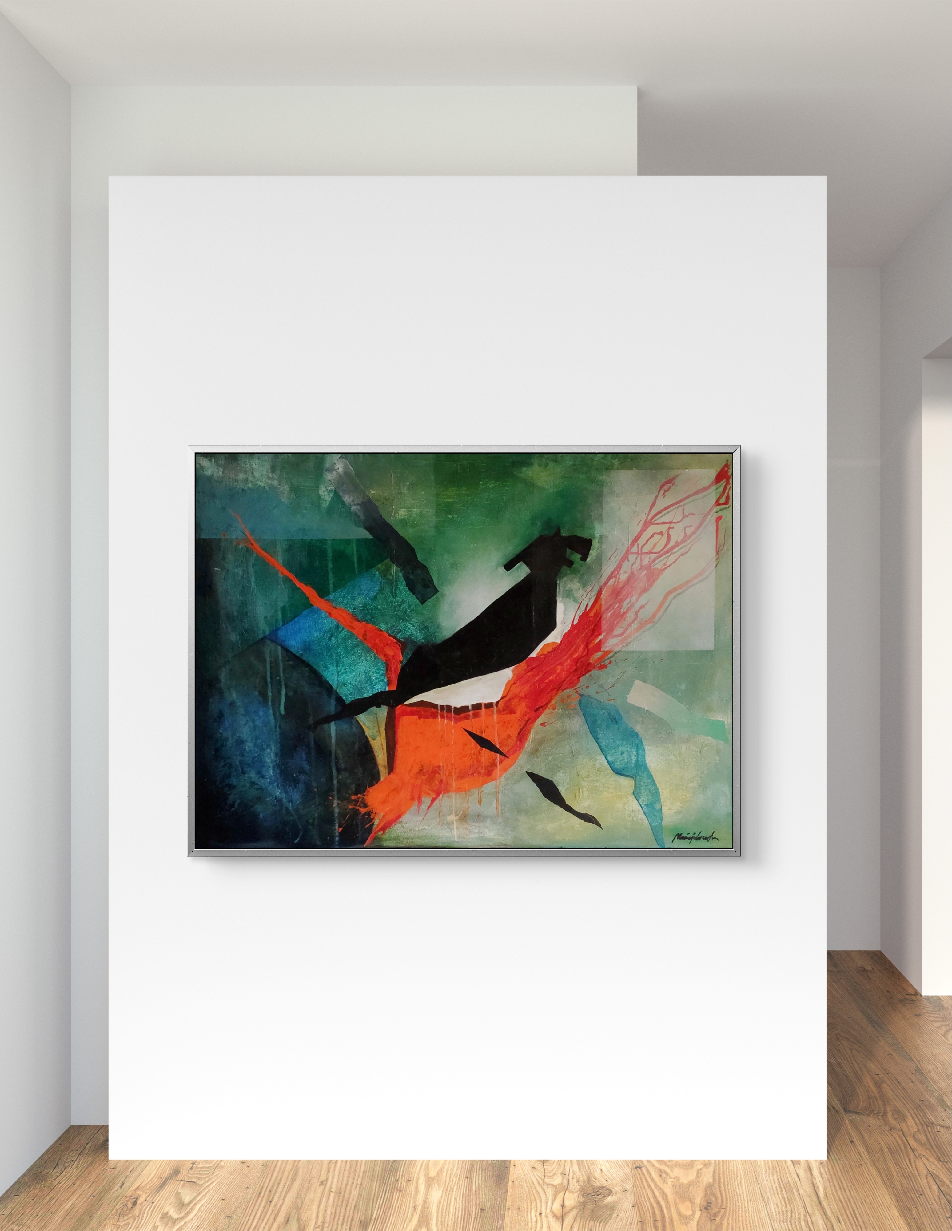 Obraz emanuje feerią kolorów, gdzie intensywna zieleń tła kontrastuje z ognistymi czerwieniami i głęboką czernią centralnej figury. Kompozycja przyciąga wzrok odważnymi liniami, przypominającymi dynamiczny ruch. Użycie ostrych kształtów i zróżnicowanych faktur nadaje dziełu energię, jakby malarz uchwycił moment eksplozji. Atmosfera jest pełna napięcia i tajemnicy, a każdy element zdaje się mieć swoje miejsce w tej abstrakcyjnej układance. Techniki artystyczne przypominają ekspresjonizm, gdzie gesty pędzla są śmiałe i niepowstrzymane. Obraz potrafi budzić emocje, od ciekawości do niepokoju, zachęcając odbiorcę do własnej interpretacji. Może to być metafora walki czy wewnętrznej siły. "What's going on here?" chciałoby się zapytać. Patrząc na tę kompozycję, można poczuć przypływ adrenaliny, jakby uczestniczyło się w nieznanym spektaklu. A może to obraz wielbłąda, co? Takie dzieła potrafią naprawdę pobudzić wyobraźnię.