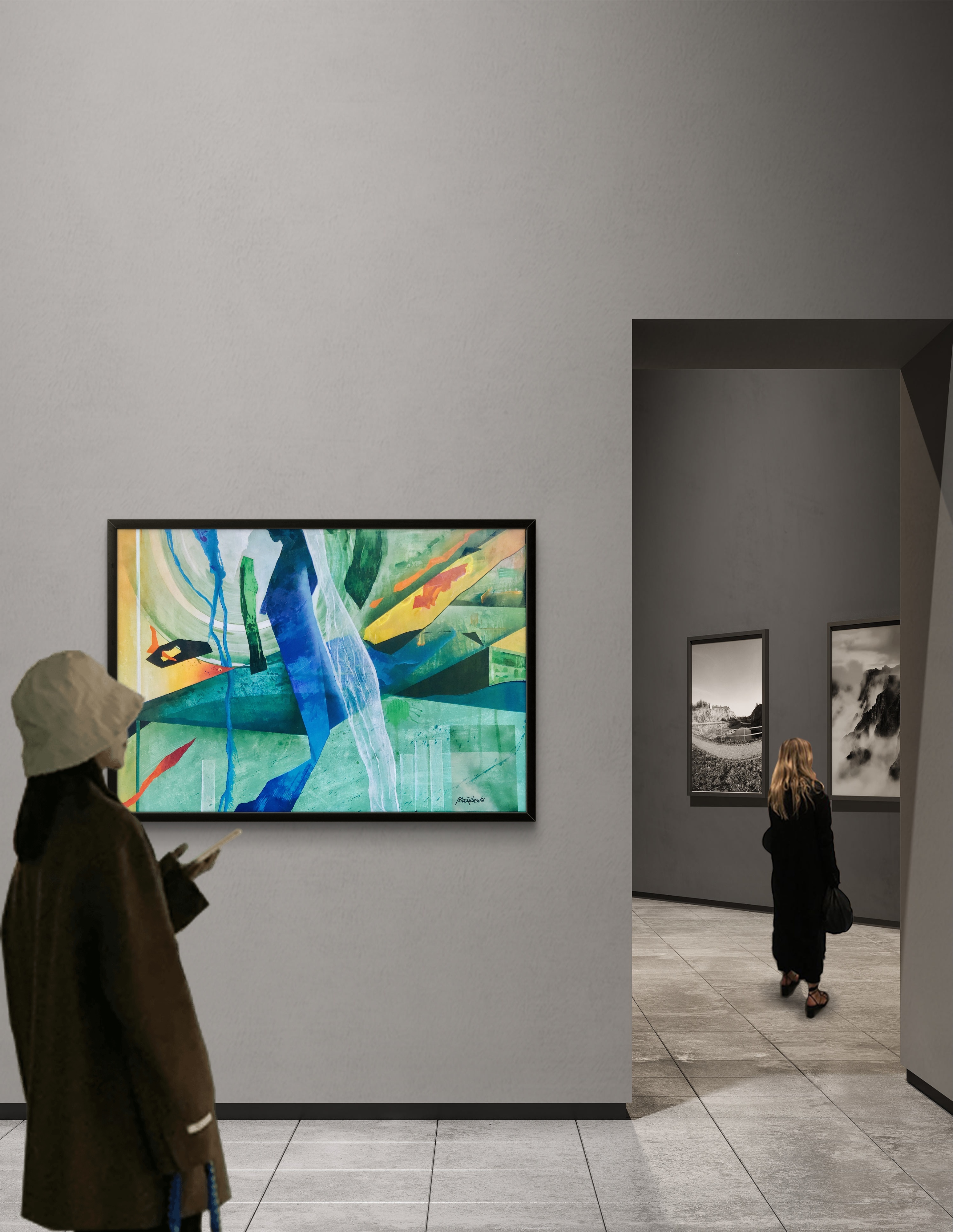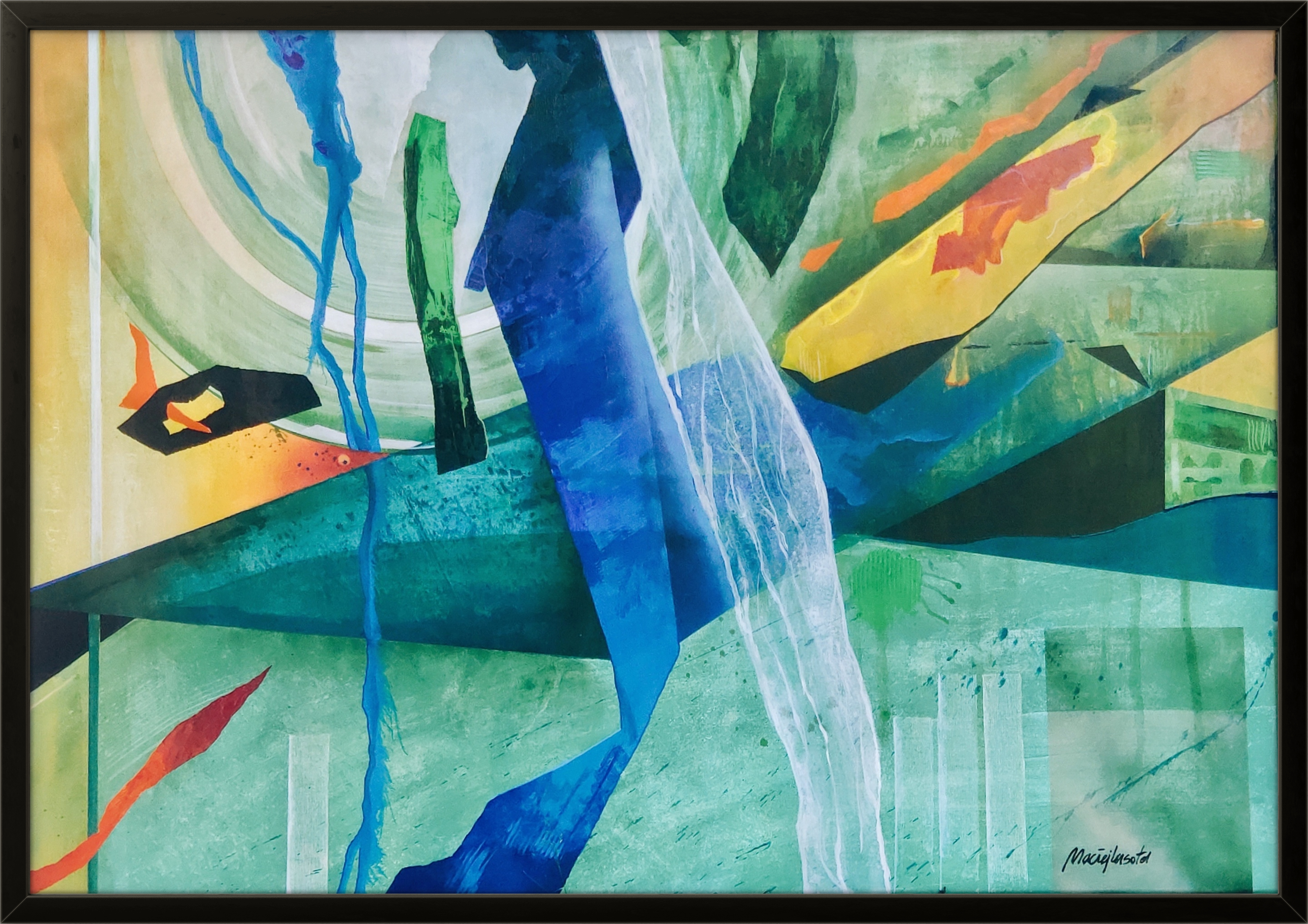 Obraz emanuje dynamicznym połączeniem kolorów i form. Dominują zielenie i błękity, przeplatane żółtymi i pomarańczowymi akcentami. Centralna kompozycja wydaje się sugerować ruch powietrza, jak letnia bryza rozmywa się w kalejdoskopie barw i linii. Swoboda, z jaką artysta wykorzystuje kontrasty, nadaje dziełu niemalże surrealistyczny charakter. Atmosfera obrazu jest pełna energii. Mimo że kształty są abstrakcyjne, emanują pewną osobliwą siłą. To, jak farby łączą się na płótnie, tworzy wrażenie pulsującego rytmu. Patrząc na to, czuję, jakby obraz żył własnym życiem. Styl artysty to abstrakcjonizm, pełen śmiałości i ekspresji. Technika użycia kolorów przypomina mi nieco działania impresjonistów, ale z rozmachem współczesnego artysty. Obraz pobudza do interpretacji i zachęca do podróży wewnątrz własnych emocji. Niejeden powiedziałby: "Widziałem zasłony w tańcu!" Dzieło może prowokować uczucie zagubienia, ale jednocześnie fascynuje. To, co wyróżnia ten obraz, to jego "vibe". Jest to prawdziwy rollercoaster dla zmysłów i wyobraźni. Obraz oprawiony w czarną, drewnianą ramę.