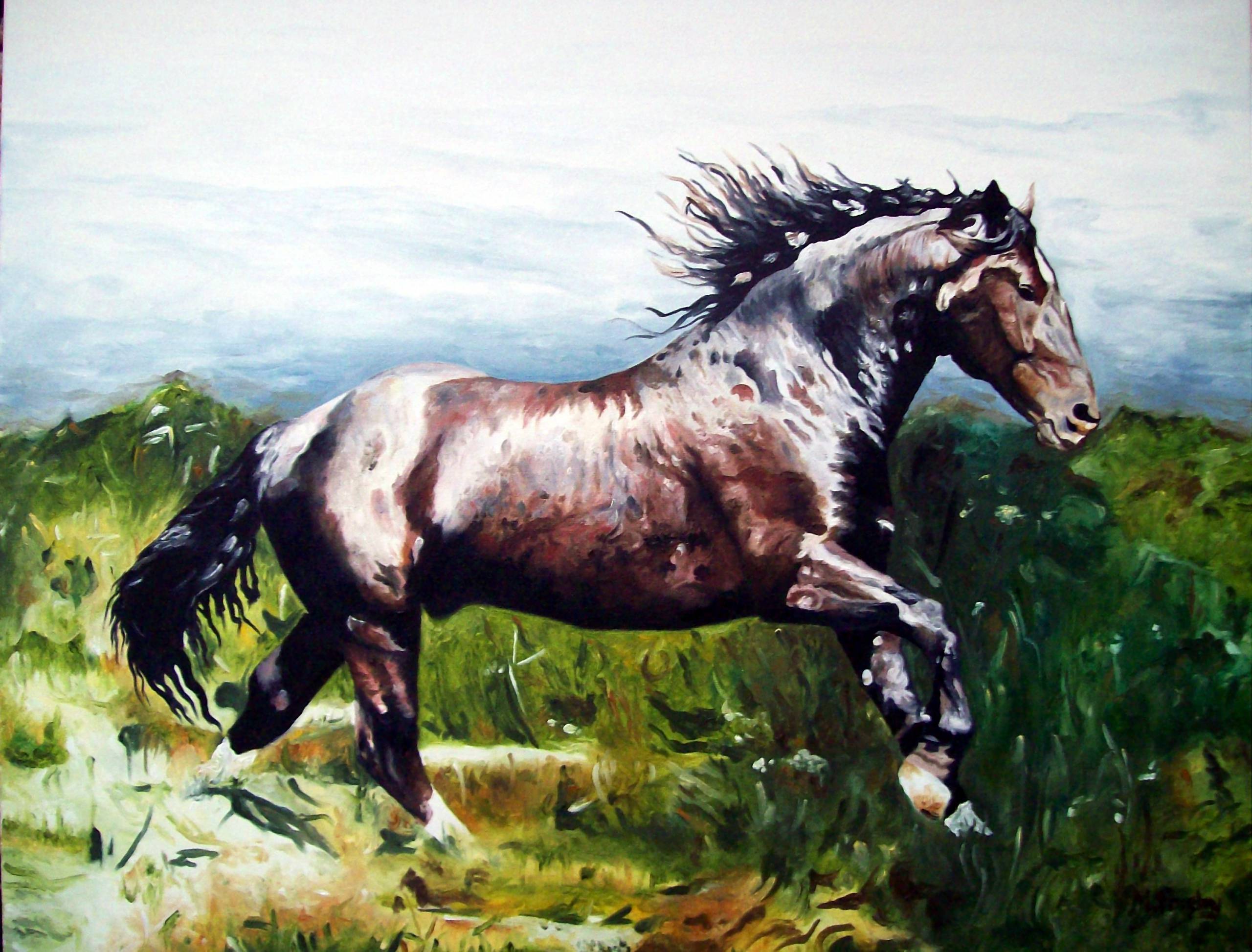 W obrazie widać dynamiczną scenę, gdzie koń w pełnym galopie pędzi przez zieloną łąkę. Jego brązowa sierść błyszczy w świetle, a grzywa rozwiewa się na wietrze. Kontrastujące kolory brązu i zieleni ożywiają całą kompozycję. Artysta zastosował technikę impasto, co dodaje tekstury i głębi. Sceneria wydaje się być sielankowa, choć pełna energii i ruchu. Atmosfera jest niemal namacalna. A moim zdaniem, czujesz niemalże ten wiatr na twarzy. Widzisz tę moc i wolność? No, i jest taki moment, że serce ci szybciej bije. Styl obrazu przypomina impresjonizm – widać tu swobodne pociągnięcia pędzla i świetlistość barw. Kiedy patrzy się na ten obraz, czuje się wolność i dzikość. To jakby małe dziecko powiedziało: "Patrz, konik biega, hurrra!" Niesamowite, jak takie dzieło może wzbudzać tyle emocji. I to "rush" w sercu. Obraz emanuje energią i jest symbolem nieokiełznanej natury. Trudno od niego oderwać wzrok, chociaż jest taki prosty i prawdziwy. Też tak czujesz?