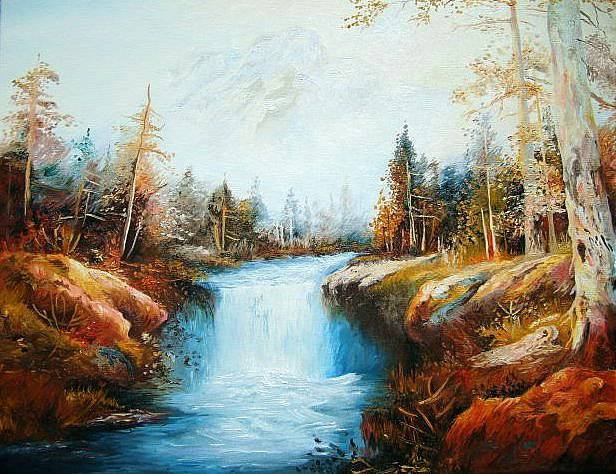 Ten obraz to prawdziwa uczta dla oczu, pełna bogatych, ciepłych barw jesieni. Dominują tu złote odcienie liści i ciepłe brązy, które kontrastują z głębokim błękitem rzeki. Drzewa, choć miejscami pociągnięte lekką mgiełką, stoją dumnie, tworząc malowniczy szpaler. W centrum uwagę przykuwa strumień, który przyciąga jak magnes. Przypomina mi spadanie wody z kranu. Klimat obrazu jest spokojny, ale jednocześnie tchnie życiem i ruchem, jakby natura tętniła własnym, rytmicznym pulsem. Technika olejna pozwala artyście na oddanie bogactwa faktur i detali. Pociągnięcia pędzla są widoczne i dynamiczne, co dodaje kompozycji przestrzeni i głębi. Widać tu pewną melancholię, ale i nostalgię za minionym latem, kiedy liście były zielone. Wywołuje to w odbiorcy refleksję o przemijaniu i cyklu życia. Czuję wręcz zapach ziemi i szmer liści pod stopami. Wow, jak to wszystko działa na emocje! Artysta zastosował klasyczny styl krajobrazowy, ale dodał do niego swój własny "twist", tworząc dzieło jednocześnie realistyczne i pełne ekspresji.