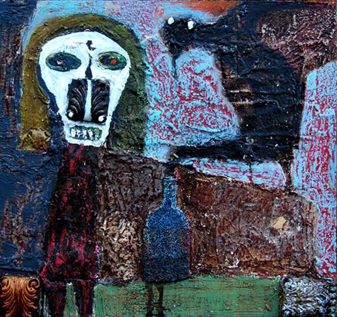 Obraz hipnotyzuje swoją surrealistyczną kompozycją. Na pierwszy plan wybija się postać o czaszkowatej twarzy, której oczy zdają się patrzeć prosto w duszę widza. Kolorystyka obrazu, z przewagą chłodnych niebieskich i ciepłych czerwonych tonów, tworzy napięty kontrast. Kształty są zdefiniowane grubą fakturą, co nadaje dziełu trójwymiarowej głębi. Atmosfera intrygująca, może nawet lekko przytłaczająca. Emanuje z niego tajemniczość z elementem niepokoju. Artysta używa techniki impastu, co wprowadza dynamikę i ekspresję, jakby farba chciała z płótna wyskoczyć. Patrząc na to dzieło, czuję się jak w innej rzeczywistości. Almost like a dream. W samym centrum widzimy butelkę, która być może symbolizuje ucieczkę lub zapomnienie. Dziecku mogłoby się wydawać, że to jest potwór, który pilnuje magicznej mikstury. Można poczuć, że artysta chciał wywołać w nas refleksję nad ludzką naturą, może nawet marazmem codzienności. Miejsca niedopowiedzeń w obrazie zachęcają do snucia własnych interpretacji i przygód w wyobraźni. Mimo chaosu, dzieło ma w sobie pewną harmonię. A przyglądając się dłużej, można poczuć delikatny dreszczyk emocji. Warto dać się wciągnąć w tę artystyczną podróż.