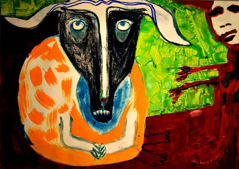 Na tym niezwykłym obrazie dominuje jaskrawość kolorów i zaskakująca kompozycja. Uwagę przyciąga czarna, teatralna maska centralnej postaci, skontrastowana z jaskrawym pomarańczowym tłem. Ta kombinacja kolorów wydaje się wręcz krzyczeć do odbiorcy. A te, zielone elementy po prawej stronie, dodają ciekawego kontrapunktu, czy może spokoju? Atmosfera jest napięta, enigmatyczna. Czujesz, jakby obraz pytał o sens istnienia. Stylistyka przypomina coś z pogranicza surrealizmu, może trochę primitivism w tym jest. Technika mieszana, akryl może? Artysta eksperymentuje z formą, jednocześnie zachowując chaos. Wow. Te wielkie oczy zwierzęcia przenikają na wskroś, powodują, że oglądający czuje się trochę dziwnie, jakby był obserwowany. To taki trochę spooky feeling. A ten dzieciak po prawej, co on robi? Wygląda jak z innego świata. „To wygląda jak koza przytulanka!” myśli sobie małe dziecko. Obraz zostawia dużo miejsca na interpretacje, co czyni go niezwykle intrygującym. Best make sure you’re ready before you dive into it. Naprawdę można się w nim zatracić. Naprawdę. Każdy element to zagadka, którą próbujesz rozwikłać.