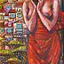 Obraz ukazuje tajemniczą postać kobiety, której sylwetka dominuję nad malowniczą panoramą miasta. W tle widzimy różnorodne budynki z czerwonymi dachami, przypominające starożytne włoskie miasteczko. Kolory są intensywne, szczególnie czerwień sukni, która kontrastuje z błękitami i zielenią okiennic. Kompozycja jest dynamiczna, a jednak emanuje z niej spokój i nostalgiczny nastrój. Można wyczuć w tym obrazie magię chwili, jakby czas się tu zatrzymał. Styl artysty jest wyraźnie impresjonistyczny, pełen ekspresji i emocji. Grubo nakładane farby tworzą teksturę, która podkreśla dramatyzm dzieła. Technika ta dodaje głębi i życia każdemu detalowi. Kobieta zdaje się marzyć lub wspominać, co budzi w widzu uczucie tęsknoty i refleksji. Jej spojrzenie jest głębokie, a ręce delikatnie złączone, co daje poczucie intymności. To dzieło sztuki, które potrafi poruszyć serce. Patrząc na obraz, można poczuć "serenity" otaczającego krajobrazu, gdzie wszystko wydaje się możliwe. Jest w tym coś, co przyciąga i zachęca do analizy każdego szczegółu. Dla siedmioletniego dziecka obraz ten jest pełen kolorowych domków jak z bajki! Odbiorca może interpretować to jako tęsknotę za utraconym czasem lub jako afirmację piękna codzienności. Mimo że nie wszystko jest perfekcyjnie dopracowane, to właśnie w tych niedoskonałościach tkwi prawdziwe piękno tej pracy.