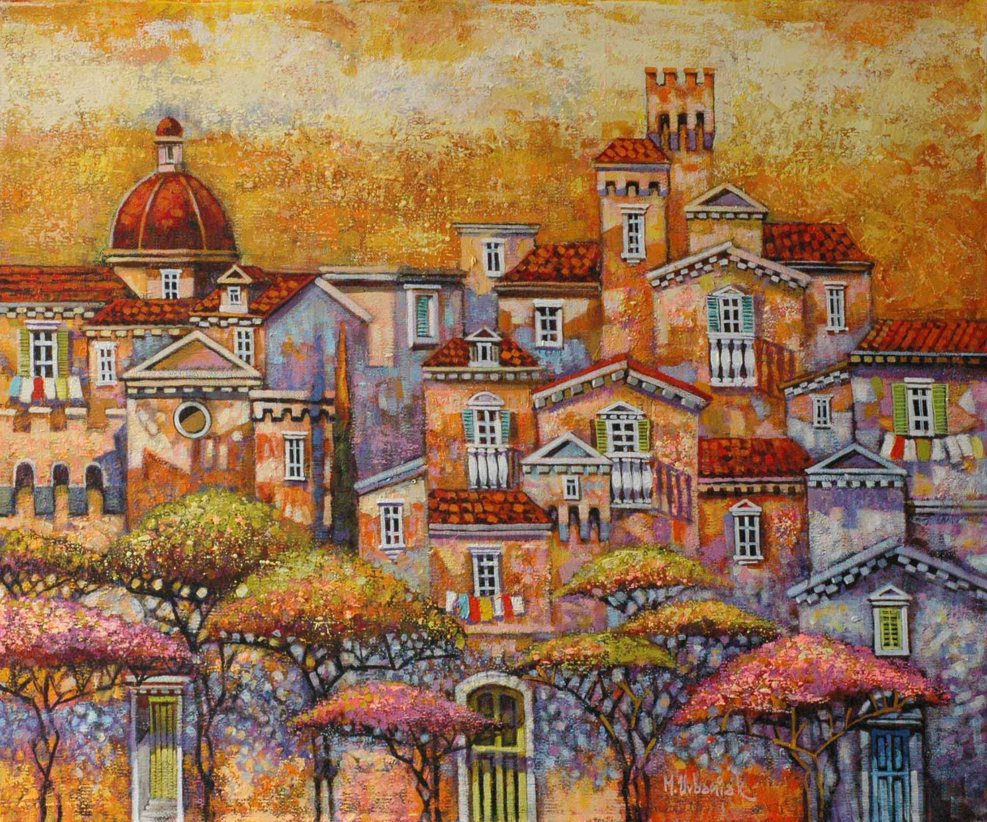 Na tym obrazie dominuje ciepła paleta barw – odcienie złota, pomarańczu i czerwieni łączą się, tworząc spokojny klimat. Architektura starych budynków z czerwonymi dachami przywodzi na myśl urocze, śródziemnomorskie miasteczko. Artysta zastosował technikę faktur, co nadaje obrazowi głębię i trójwymiarowość. Skupienie na detalach, takich jak małe okna i balkony, pokazuje dbałość o szczegóły. Drzewa wyglądają jak różowo-złote chmury. Atmosfera obrazu jest nostalgic, zaprasza do refleksji i zanurzenia się w myślach. Emocje, które wywołuje, mogą być różne. U niektórych poczucie spokoju i ciepła, a u innych tęsknota za podróżami. "Te domki są takie fajne" – powiedziałoby dziecko. Obraz sprawia, że czujemy ciepło słońca na skórze. Przypomina o letnich wieczorach, kiedy wszystko wydaje się magiczne. Można prawie usłyszeć dźwięk cykad. Wow, taki widok zachęca do marzeń. Artist próbuje uchwycić esencję miejsca. To jakby zaproszenie do przekroczenia progu tej malarskiej krainy.