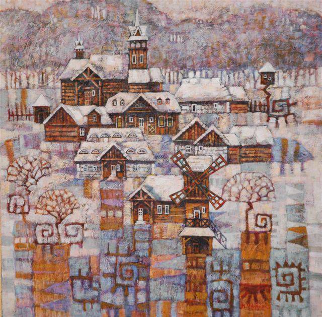 Na obrazie widzimy malowniczą zimową wioskę, tonącą w bieli śniegu i subtelnych pastelach. Drewniane chałupy o ciemnych, bogatych barwach brunatnych i głębokich brązach kontrastują z delikatnie opadającym śniegiem na dachach. Kompozycja skupia się wokół wiatraka, który dodaje całości ruchu, choć wszystko dookoła zdaje się zamierać w zimowym letargu. Tajemnicze kręcone drzewa i geometryczne wzory na ziemi nadają dziełu surrealistyczny, niemal magiczny charakter. Atmosfera obrazu jest jednocześnie spokojna i pełna ukrytego życia. Poczucie ciszy miesza się z mroźną świeżością zimowego poranka. Artysta użył technik przypominających mozaikę, z wyrazistymi pociągnięciami pędzla, które tworzą dynamiczną fakturę. Emocje? Obraz przywołuje wspomnienia z dzieciństwa, magiczne chwile spędzone na śniegu. Może też wywoływać poczucie nostalgii za prostszym, spokojniejszym życiem na wsi. Dla mnie ten obraz jest pełen "wonder". Jakbyś miał wrócić do miejsca pełnego magii i tajemnic. Moja siostra powiedziała, że chciałaby się bawić w tej wiosce. Zachwyca różnorodnością kształtów i subtelnym światłem, które delikatnie oświetla scenę. To jak w niemym filmie, gdzie dźwięki są zbędne, bo obraz mówi wszystko.