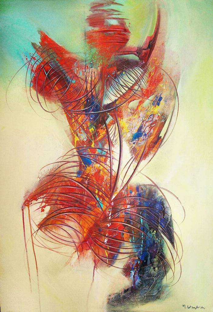 Ten obraz, pełen wyrazistych barw i dynamicznych linii, przypomina eksplozję emocji uchwyconą w momencie intensywności. Dominują w nim ciepłe odcienie czerwieni i żółci, które kontrastują z chłodniejszym błękitem. Na płótnie widać plątaninę kształtów, przypominających wirujące w ruchu skrzydła tajemniczego stworzenia. Czy to ptak, czy coś bardziej abstrakcyjnego? Kompozycja jest nie tylko chaotyczna, ale i przemyślana, z elementami, które harmonijnie ze sobą współgrają. Atmosfera obrazu jest pełna energii, niemal elektryzująca. To tak, jakby widz stał w samym epicentrum jakiegoś artystycznego zamieszania. Styl dzieła łączy w sobie techniki ekspresjonistyczne z elementami współczesnej abstrakcji. Widać tu wyraźne pociągnięcia pędzla, a także subtelniejsze, bardziej rozmyte przejścia kolorów. Obraz może wzbudzić mnóstwo reakcji emocjonalnych. Jedni poczują zachwyt nad kawalkadą kolorów, inni może chaos przypomni im o własnych zmaganiach i poszukiwaniach jakiegoś porządku. "Wow, ale tu dużo kolorów!" - powiedziałoby dziecko, zafascynowane gamą barw. Odbiorca może poczuć się zaintrygowany, próbując odgadnąć intencje artysty. Dla niektórych to może być prawdziwe rollercoaster emocji. Ten obraz jest jak kalejdoskop, który zmienia się za każdym razem, gdy na niego patrzysz, niesie ze sobą coś nieskończenie intrygującego.