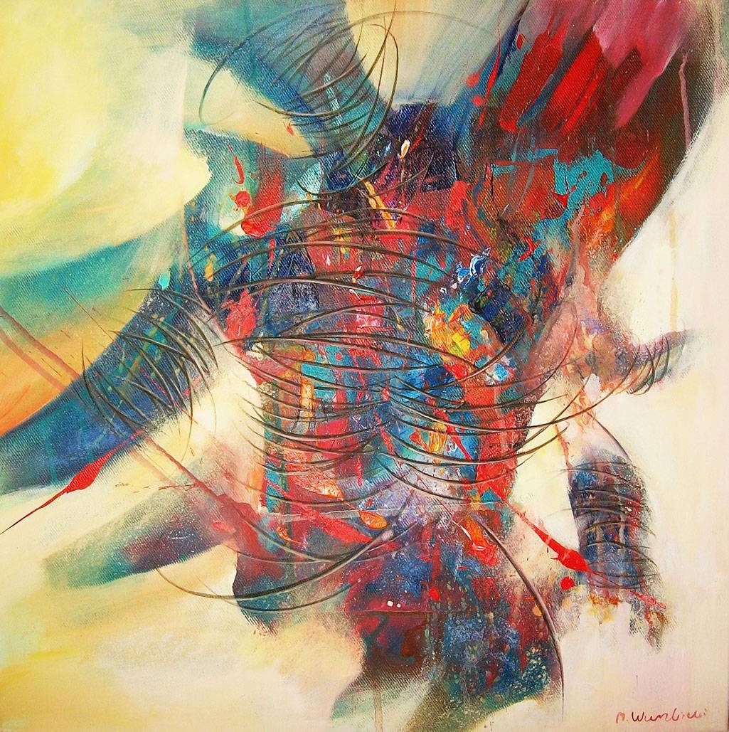 Na obrazku dominują żywe kolory: ciepłe odcienie czerwieni i chłodne błękity, które przeplatają się jak roztańczone fale na płótnie. Kompozycja jest dynamiczna, nieuporządkowana, ale w tym chaosie jest pewien porządek. Kolorowe plamy i linie wirują w centralnej części, jakby unosiły się w powietrzu. Można poczuć, jak cały obraz drga lekkim ruchem. Atmosfera emanuje intensywnością i energią, przypomina mi trochę wieczorną burzę, gdy energia powietrza jest niemal namacalna. To jest właśnie ten "vibe". Styl malarski to czysta abstrakcja, artysta wykorzystał technikę impasto, nakładając farbę grubymi warstwami. Każdy pociągnięcie pędzla kryje w sobie małą opowieść o emocjach. Obraz oddziałuje na widza jak burza kolorów i emocji. Można poczuć pewien niepokój, jakby zaraz miało coś się wydarzyć. Ale też i zachwyt nad pięknem tych kolorów. Dziecko powiedziałoby: "To tak jakby ktoś pomieszał wszystkie farby!". I to jest urok tego obrazu, jego magiczna moc inspirowania. Patrząc na to dzieło, zastanawiam się: Co artysta myślał, tworząc taki świat z kolorów i kształtów? Może to jego sposób na wyrażenie chaosu codzienności czy też własnego wnętrza? Ta kolorowa eksplozja jest niczym jazzowa improwizacja, pełna niespodzianek i spontanicznych emocji, tworząca przestrzeń do refleksji i osobistych interpretacji.