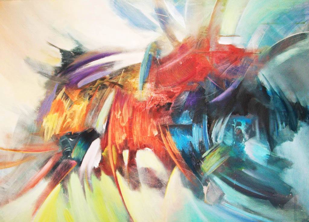 Ten abstrakcyjny obraz to prawdziwa eksplozja kolorów i energii. Dominują na nim intensywne czerwienie, niebieskie odcienie oraz zieleń, które wirują w tanecznym ruchu, jakby malarz chciał uchwycić nieskończoną dynamikę. Kompozycja jest chaotyczna, ale w ten cudowny sposób, który wydaje się kontrolowany. Trochę jak sztorm na płótnie. Artysta zastosował technikę szerokich, śmiałych pociągnięć pędzla, co nadaje dziełu wrażenie ruchu i żywości. Atmosfera obrazu jest pełna emocji, jakby energia wewnętrzna rozsadzała jego barwne kształty. Moje dziecko powiedziałoby: "To wygląda jak wielka tęcza, która się porusza!". Obraz może wywoływać poczucie niestrudzonego poszukiwania i odkrywania nieznanych przestrzeni. Całość może skłonić do refleksji nad tym, jak dynamiczny i nieprzewidywalny bywa świat. To jest magiczne, jakby obrazu been alive. Personalnie, dzieło może zachęcić do chwili zatrzymania się i zastanowienia, jak wiele energii jest w stanie pomieścić ludzkie serce.