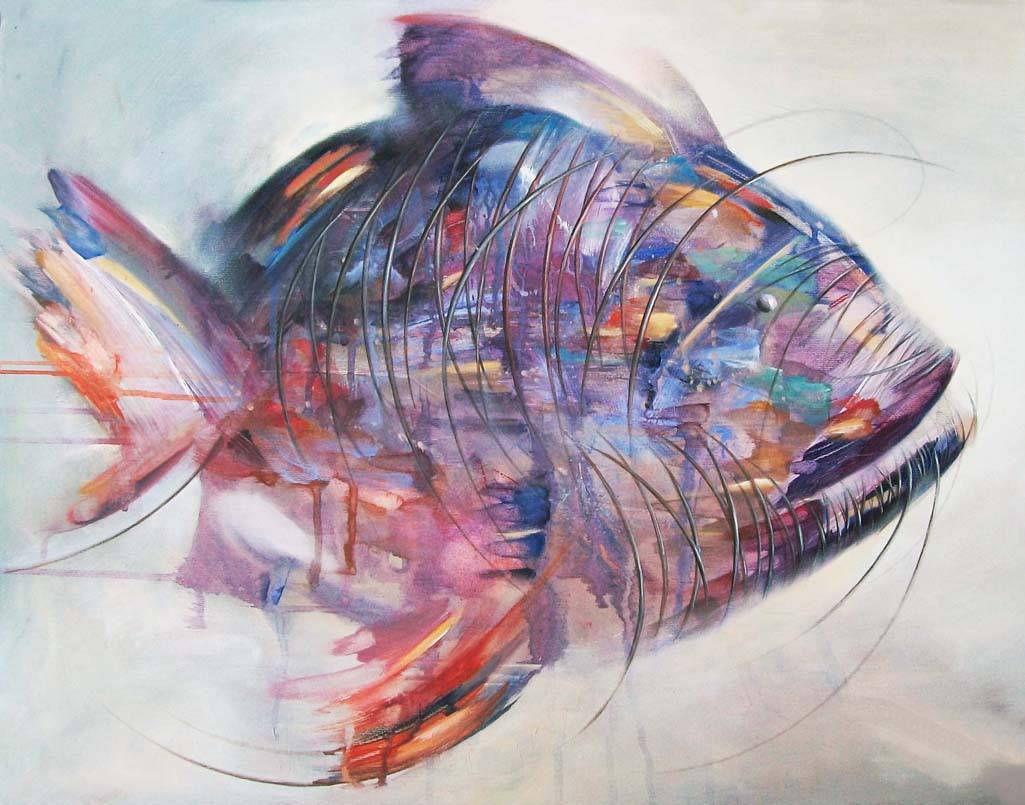 Na obrazie widzimy zjawiskową kompozycję, która od razu wciąga wzrok. Dominują tutaj intensywne odcienie fioletu, błękitu i czerwieni, przeplecione delikatnymi akcentami bieli. Kształty przypominają rybę, lecz ich abstrakcyjny charakter dodaje całości tajemniczości. Artysta zastosował dynamiczne pociągnięcia pędzla, które nadają dziełu płynności i ruchu. Można odnieść wrażenie, że obraz niemal żyje na naszych oczach. Jest na swój sposób magiczny, przekazuje poczucie nieuchwytności i ulotności. Styl artystyczny bazuje na abstrakcji, gdzie technika miesza się z wyobraźnią, a szczegóły ustępują miejsca emocjonom. Obraz wywołuje uczucie spokoju, ale i lekkiego napięcia. Daje do myślenia. Czujesz się, jakbyś patrzył przez szyby akwarium na coś niezwykłego. Taki moment wow. Możliwość interpretacji jest tutaj ogromna. Może to być odzwierciedlenie naszych zawirowań życiowych, a może po prostu piękno podwodnego świata. Ja osobiście widzę tu fragment codzienności, który uchwycony w niecodzienny sposób, daje nową perspektywę. It's like watching magic unfold. Myślę, że dla siedmiolatka to po prostu kolorowa rybka, która pływa sobie w wodzie.