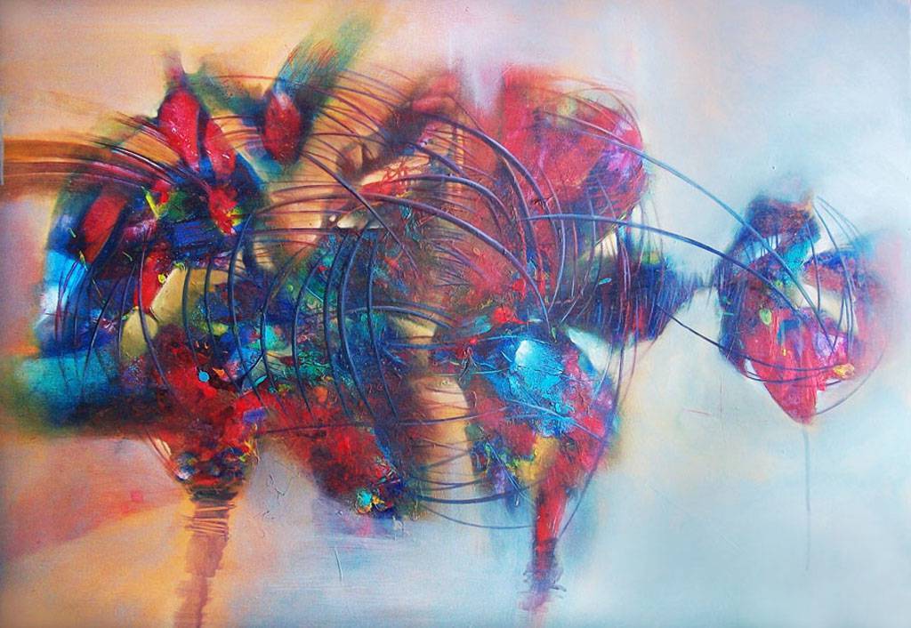 Ten dynamiczny obraz emanuje niesamowitym zderzeniem kolorów i form. W centrum uwagi przyciągają wyraziste czerwienie, błękity i odcienie zieleni, które wirują jak kolorowy taniec na gładkim tle. Przez całą kompozycję przewijają się miękkie linie przypominające łańcuchy światła, płynnie prowadząc oko przez tę fascynującą abstrakcję. Atmosfera tego dzieła jest jednocześnie spokojna i pełna energii, jakby artysta uchwycił moment chaosu ujęty w harmonii. Artysta zastosował techniki mieszanej abstrakcji, łącząc dynamiczne pociągnięcia pędzla z delikatnymi przejściami kolorów. Czuć tu pewną lekkość oraz swobodę artystyczną, która pozwala widzowi na dowolność interpretacji. Obraz wzbudza emocje, przypominając to o nieokiełznanej naturze, to o głębokich wodach oceanu, gdzie każdy kolor symbolizuje inny element życia. Dla mnie te splątane linie wyglądają jak wirujące tańce myśli, które próbują się uwolnić. Kolory przypominają mi o dziecięcej radości, kiedy mieszało się farby z nadzieją na nowy kolor. Wow, jak pięknie! Obraz jest engaging i wręcz zmusza do zatrzymania się, do refleksji. Może to być też wyraz niepewności lub poszukiwania własnej drogi w zmieniającym się świecie. To takie uczucie zagubienia i odkrywania jednocześnie.