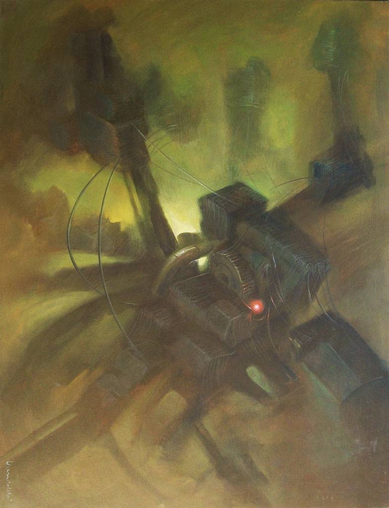Na obrazie dominuje gama ziemistych kolorów, od zieleni przez brązy po ciepłe odcienie żółci i pomarańczy. Centralny punkt stanowi tajemnicza struktura, przypominająca mechaniczną istotę, z której wyłania się subtelne, czerwone światełko. Kształty są rozmyte, kompozycja dynamiczna, co nadaje dziełu niemalże futurystyczny charakter. Patrząc na to, czujemy pulsującą energię, jakby brakowało tu grawitacji, a czas płynął inaczej. Nastrój jest nieco surrealny, senny – wywołuje uczucie niepokoju, ale jednocześnie fascynacji. Artysta zastosował technikę, która przypomina digital art, z mnóstwem detali i płynnych przejść tonalnych. Patrząc, można się zgubić, ale to przyjemne zgubienie. Te dziwne kształty są jak sen! Interpretacje są tu otwarte: może to być wizja innej planety, koszmar technologiczny lub po prostu świat wirtualny. A może to tylko szalony sen artysty. Wow, ten obraz jest naprawdę mind-bending i sprawia, że zastanawiam się nad przyszłością technologii. Sam czuję lekki dreszcz na plecach, obserwując, jak detale zdają się poruszać przed oczami. To jest sztuka, która przemawia do wyobraźni.