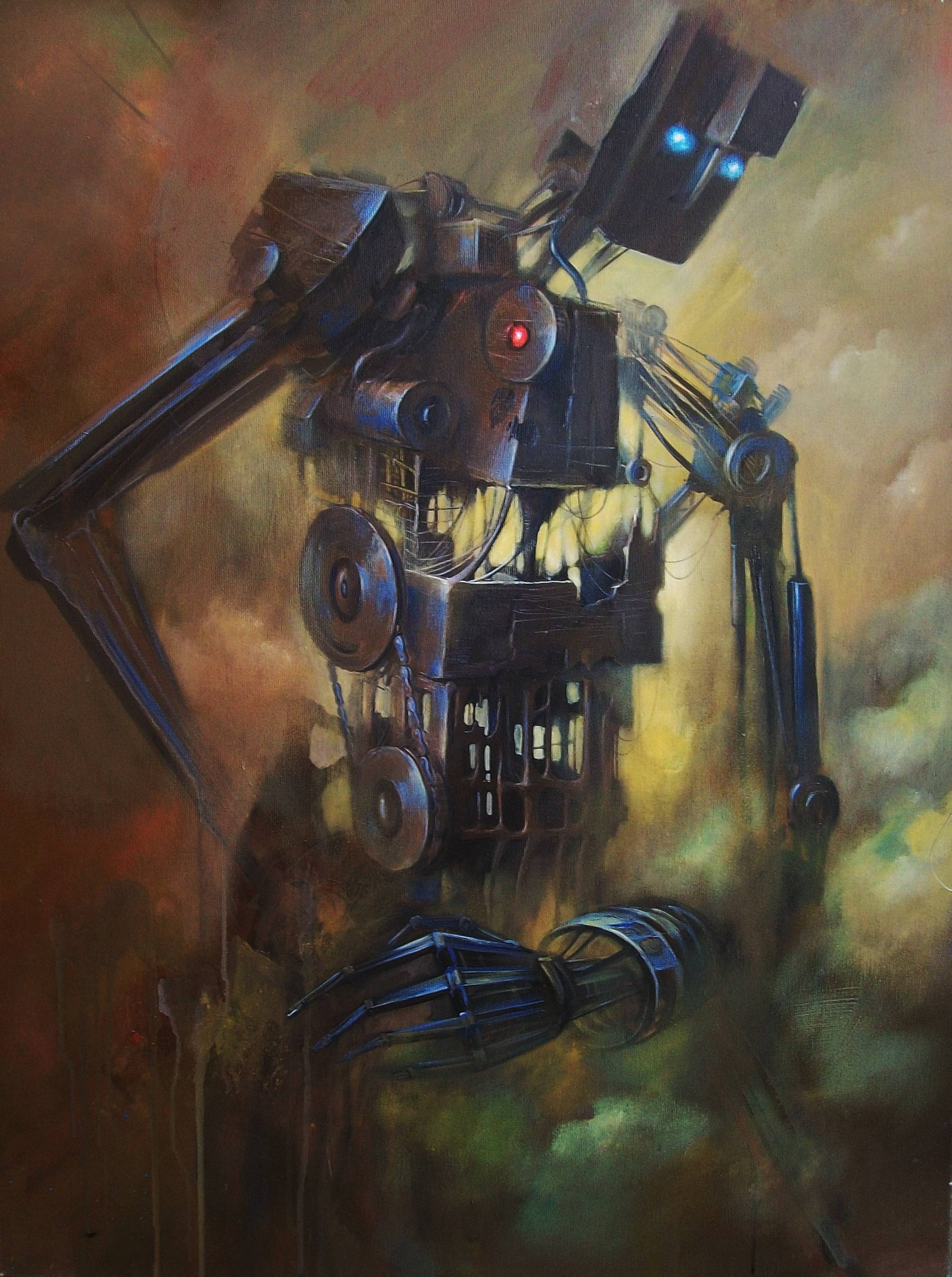 Obraz przedstawia postać zbudowaną z mechanicznych elementów, utrzymaną w ciepłych, ziemistych tonacjach z akcentami metalicznego błękitu i czerwieni. Kształty są kanciaste, a linie wodzą wzrok wzdłuż tajemniczego, humanoidalnego robota. W tle rozmywają się mgiełki, które powodują, że całość wydaje się zawieszona w przestrzeni. Atmosfera jest nieco mroczna, a zarazem intrygująca, jakbyśmy patrzyli na ujęcie z postapokaliptycznej przyszłości. Wow, ten robot ma takie duże oczy! Artysta zastosował technikę olejną, co dodaje głębi i bogactwa barw. Faktura pociągnięć pędzla sugeruje staranność, ale też pewną dzikość, co sprawia, że dzieło wydaje się żywe. Te retro-futurystyczne elementy przywodzą na myśl science fiction. Patrząc na obraz, można czuć lekkie dreszcze, może nawet zastanawiać się nad losem świata, jakie niesie przyszłość. Zastanawia mnie, czy ten robot to friend, czy foe. Taka wizja przypomina te spotykane w filmach, a może i w marzeniach sennych. Interesujące jest, jak prosta gra światła i cienia buduje nastrój mieszaniny zagrożenia i fascynacji, który wciąga widza bez reszty.