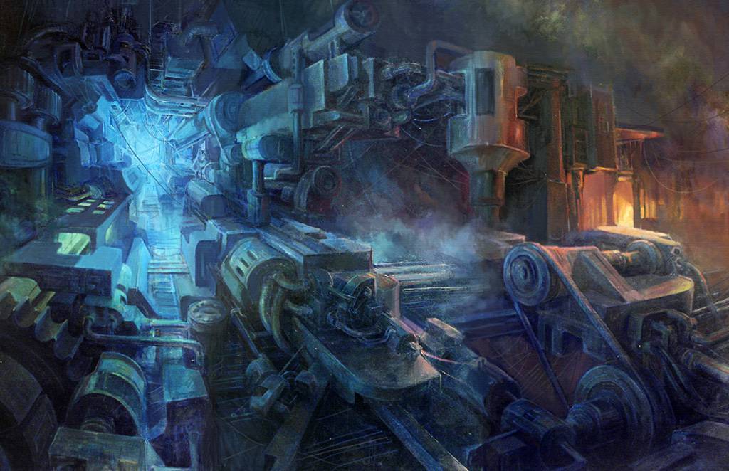 Obraz ukazuje przemysłową maszynę zanurzoną w futurystycznej scenerii. Dominują tu chłodne, niebieskie odcienie, które przeplatają się z ciepłymi pomarańczowymi akcentami. Kształty są złożone i geometryczne, jakby mechanizm składał się z nieskończonej ilości rur, zawiasów i śrub. Kompozycja prowadzi wzrok obserwatora w głąb, gdzie światło migocze i tworzy aurę tajemniczości. Atmosfera jest dynamiczna i pełna energii, jakby za chwilę coś miało się wydarzyć. Artystyczny styl obrazu to mix tradycyjnego malarstwa z cyfrową obróbką, co nadaje mu nowoczesny, niemalże science-fiction feel. Drobne szczegóły przyciągają uwagę i pobudzają wyobraźnię, zmuszając do zastanowienia się nad funkcjami i historią tej maszyny. Dla mnie to przypomina sceny z filmów o przyszłości, gdzie technologia przejęła władzę nad światem. WOW! – mógłby powiedzieć mały chłopiec, patrząc na ten obraz. Patrząc na to, czuję lekkie napięcie, jakbym stała u progu czegoś wielkiego i nieznanego. Obraz jest niezwykle inspirujący i może symbolizować nie tylko postęp technologiczny, ale i niepewność związaną z przyszłością.