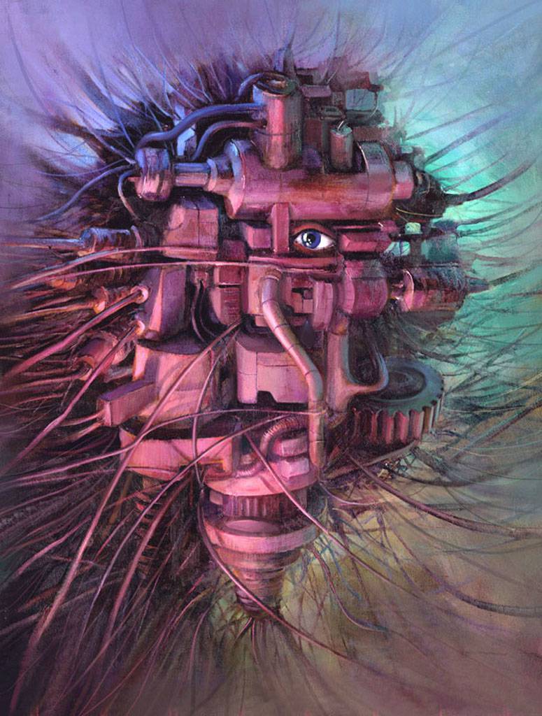 Obraz, który widzimy, to intrygujące połączenie mechanicznym częsci z elementami organicznymi. Dominują zimne odcienie fioletu i zieleni, które tworzą nieco tajemniczą i futurystyczną atmosferę. Centralnym motywem jest coś przypominającego skomplikowaną maszynę, z której wyrastają liczne przewody i rurki. W samym środku mechanicznej struktury znajduje się oko, które zdaje się obserwować nas z ciekawością. Obecność oka sugeruje pewną organiczną obecność, co wywołuje mieszane uczucia. Czy to mashine z duszą? Artysta zastosował precyzyjne cieniowanie i realistyczne detale, które sprawiają, że obraz wydaje się niemal dotykalny. Techniką jest digital painting, który idealnie pasuje do tematyki science fiction. Mieszanka mechaniki i biologii tworzy niepokojący, ale fascynujący nastrój. Obraz może budzić różnorakie emocje. Najpierw zdziwienie, potem może pytania o granice między człowiekiem a maszyną. Może trochę strachu, bo co jeśli maszyny naprawdę będą mogły patrzeć i czuć? Wow, ale super maszyna z oczkiem! Ten obraz jest jak wgląd w przyszłość, która już się dzieje. It's captivating. Nie da się od niego oderwać wzroku, bo cały czas się zastanawiasz, co jeszcze odkryjesz patrząc dłużej.