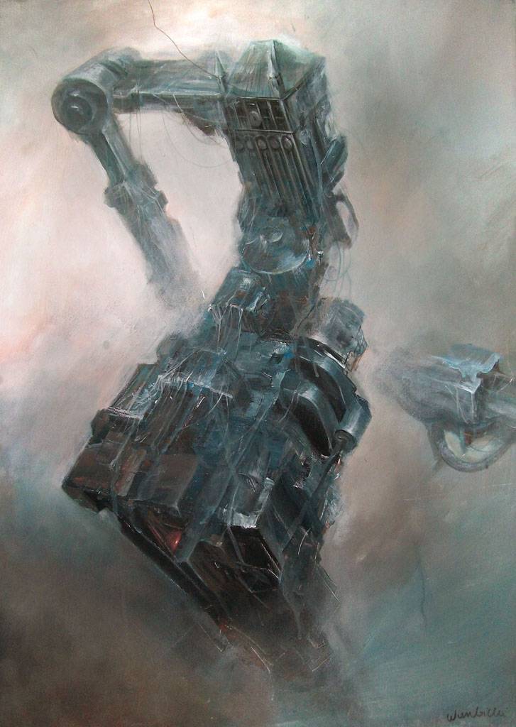 Na obrazie widzimy masywną, mechaniczną konstrukcję, wyglądającą jak skomplikowana maszyna lub gigantyczne ramię robota. Dominują zimne, metaliczne tony szarości, z odrobiną błękitu i czerni. Struktura, z licznymi zagięciami i detalami, zdaje się unosić w powietrzu, jakby była zawieszona w nieznanej przestrzeni. Kompozycja zbudowana jest w sposób, który przyciąga wzrok do centralnej części obrazu, pełnej geomterycznych kształtów. Atmosfera dzieła jest chłodna i nieco tajemnicza, emanuje pewnym dystansem, a jednocześnie ciekawością. To taki moment, gdy patrzysz na coś i myślisz sobie, "co to jest?". Technika malarska z wyraźnymi pociągnięciami pędzla dodaje dynamiki i wrażenia ruchu. Artysta zastosował tu miks realizmu z elementami surrealizmu, tworząc coś intrygującego. Wręcz czuć pewną nostalgiczność, jakby wspomnienie starych maszyn, których czasy świetności minęły. Możesz się zastanowić, czy to wizja przyszłości, czy przeszłości. "Look at this!" – chciałoby się wykrzyknąć, widząc, jak kawałki technologii splatają się w tej mgławicowej scenerii. Dla małego chłopca to po prostu wielki robot w chmurach. Czuje się trochę jak w sci-fi filmie, gdzie świat technologii spotyka się z artyzmem. Wszystko to budzi dziwne zaciekawienie i ekscytację, jak odkrywanie nieznanego świata.