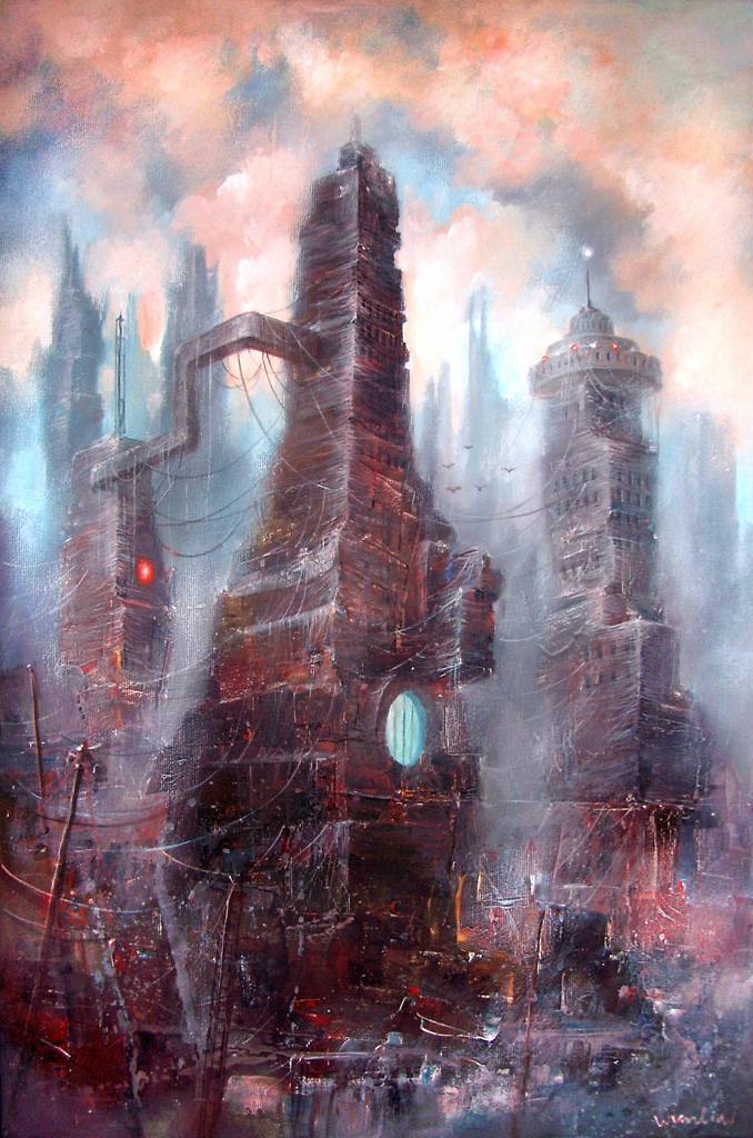 Obraz ukazuje postapokaliptyczny krajobraz z dominantą czerwieni i błękitów, gdzie monumentalne wieże wyrastają niczym zapomniane kolosy. Majestatyczne struktury zdają się walczyć z mrokiem otulonym mgłą, formują się w kształty lekko zamazane, a jednak wyraźne w kontekście chaosu otoczenia. Atmosfera jest pełna tajemnicy; czujesz się niemalże jak w dystopicznym świecie, gdzie czas stanął w miejscu. "Wow, ale duże budynki!" - pomyślałoby 7-letnie dziecko, przyciągnięte rozmiarem i imponującą aurą. Artysta korzysta z techniki impresjonistycznej, z dynamicznymi pociągnięciami pędzla, które dodają ruchu i energii. Widać tutaj pewien "drama" - napięcie, które buduje się między pozornie chaotycznymi kompozycjami. To futurystyczne cityscape może budzić poczucie zagubienia, ale też fascynacji. Z jednej strony to wizja, co by było, gdyby... Z drugiej, przypomina o kruchości tego, co mamy. Kiedy patrzę na ten obraz, czuję mieszankę niepokoju i zachwytu. Przypomina mi sny o miastach, które nigdy nie śpią. Może to absurdalne, ale mam wrażenie, że każdy z tych wieżowców ma swoją historię do opowiedzenia. Fascynujące i lekko przerażające, prawda? Może warto zastanowić się, co te milczące olbrzymy mówią o przyszłości.