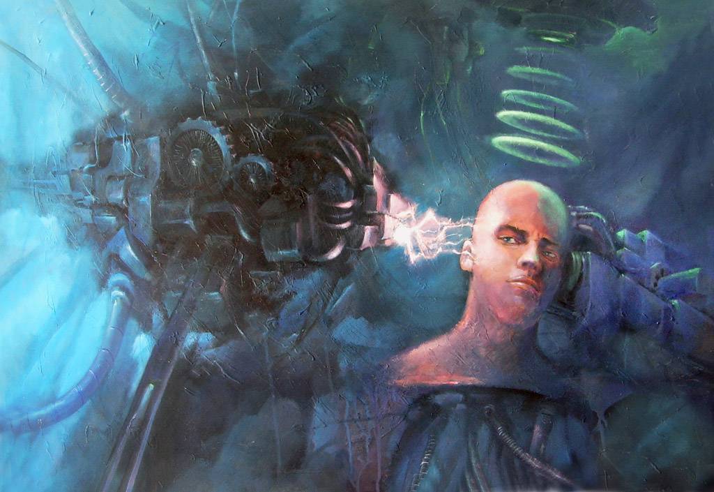 Obraz emanuje tajemniczą atmosferą, pełną futurystycznych akcentów. Dominują chłodne odcienie niebieskiego, które przeplatają się z subtelnymi, kontrastowym różem. Centralną postacią jest mężczyzna o intensywnym spojrzeniu, którego głowa łączy się z industrialną maszynerią pełną kół zębatych i kabli. To takie cool, jak w filmie sci-fi. Kompozycja podkreśla dynamiczne połączenie człowieka i technologii, co może budzić niepokój i fascynację jednocześnie. Styl artystyczny jest surrealistyczny, z nutą dystopii, a techniki użyte przez artystę, jak impasto i mieszanie kolorów, dodają głębi dziełu. Obraz wywołuje emocje związane z postępem technologicznym i jego wpływem na człowieka. Dla niektórych to może być wizja przyszłości, dla innych przerazająca rzeczywistość. Osobiście czuję pewien dystans, ale też niesłabnącą ciekawość. Ten artwork wydaje się mówić o granicach ludzkiej natury, które są nieustannie testowane. Każdy szczegół pobudza wyobraźnię, zachęcając do refleksji nad tym, dokąd zmierzamy jako społeczeństwo.